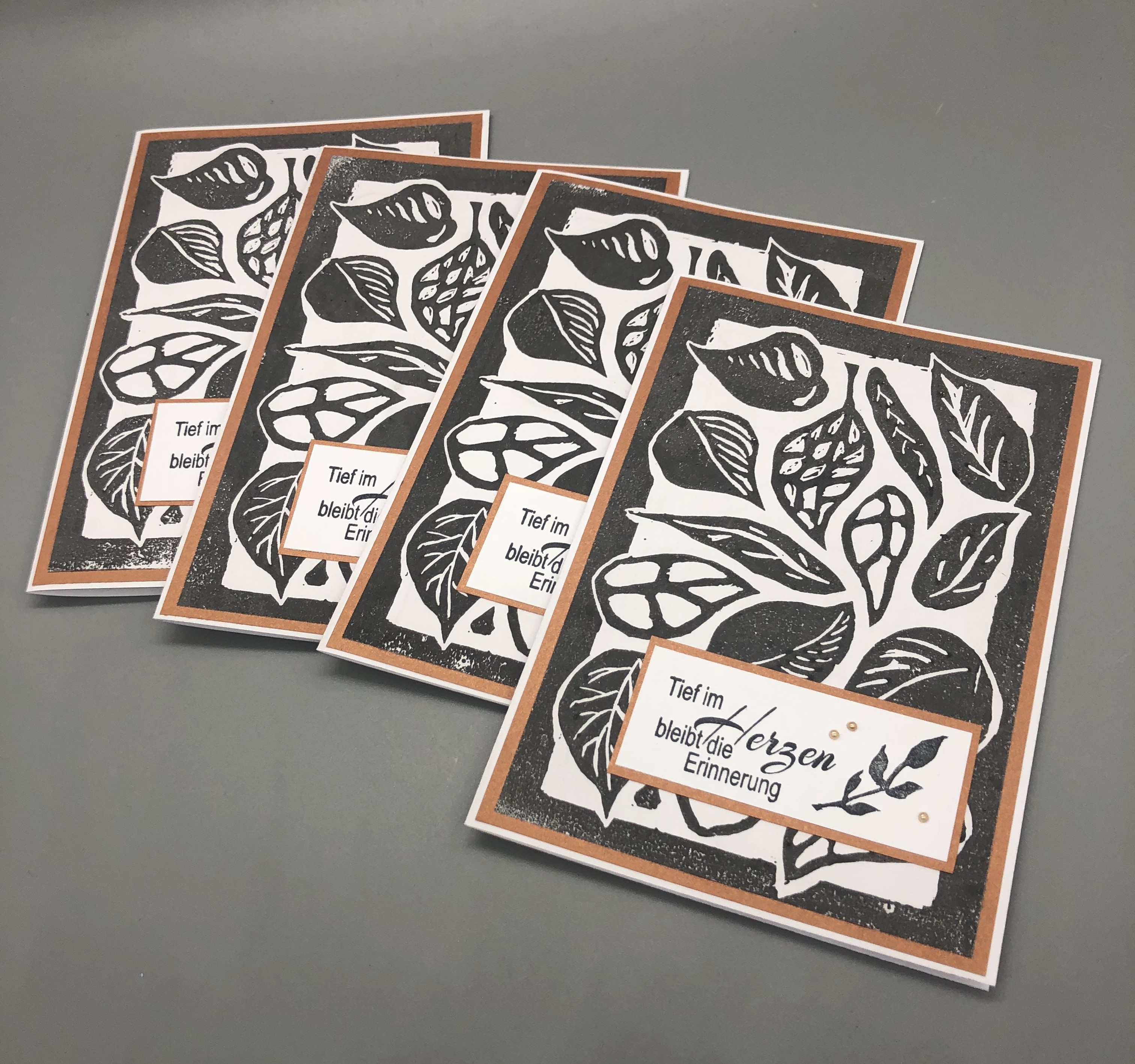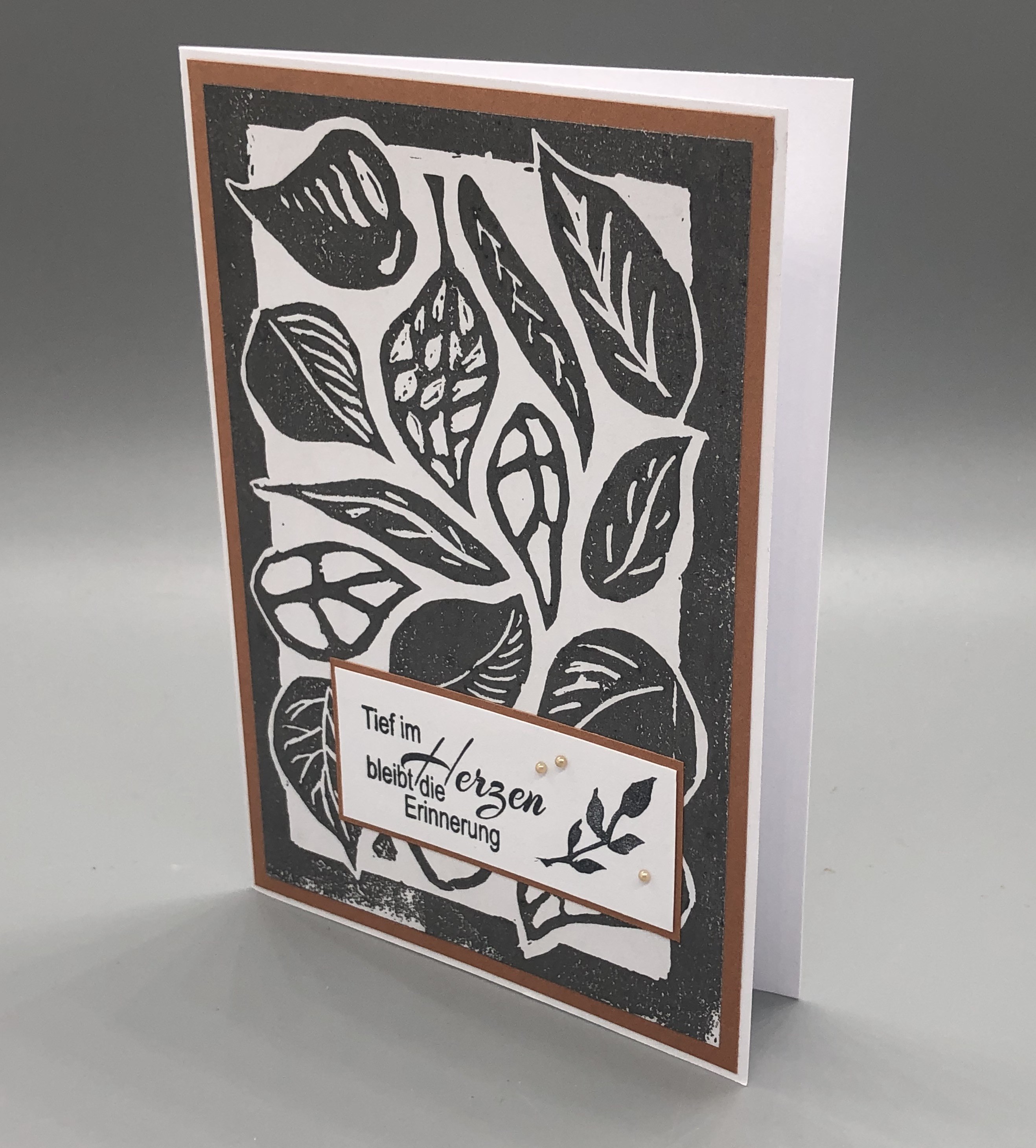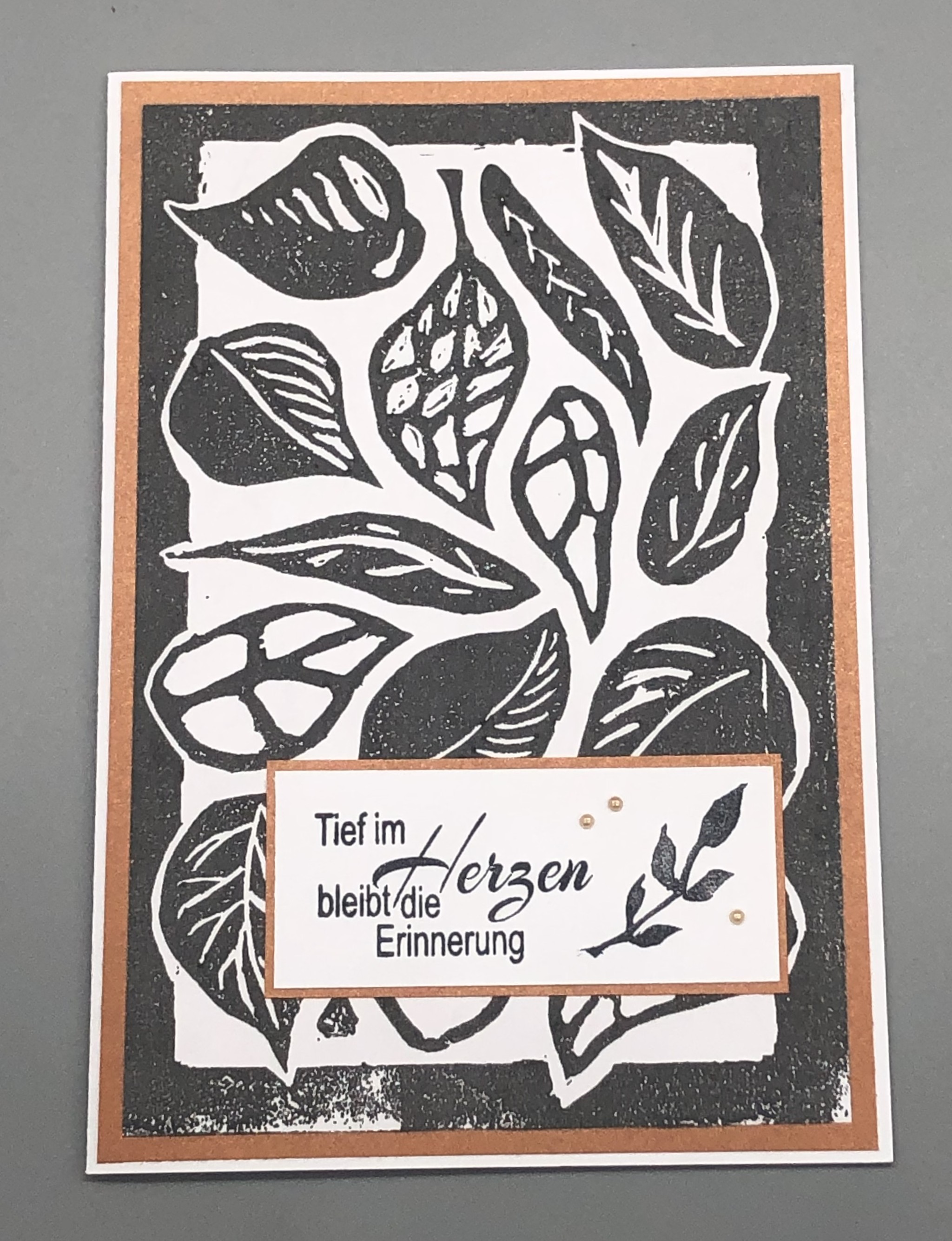 Ein selbstgeschnitzter Stempelgummi macht jedes Exemplar dieser Trauerkarte zu einem echten Unikat. Gedruckt habe ich das Blättermotiv mit schwarzer Linolfarbe.