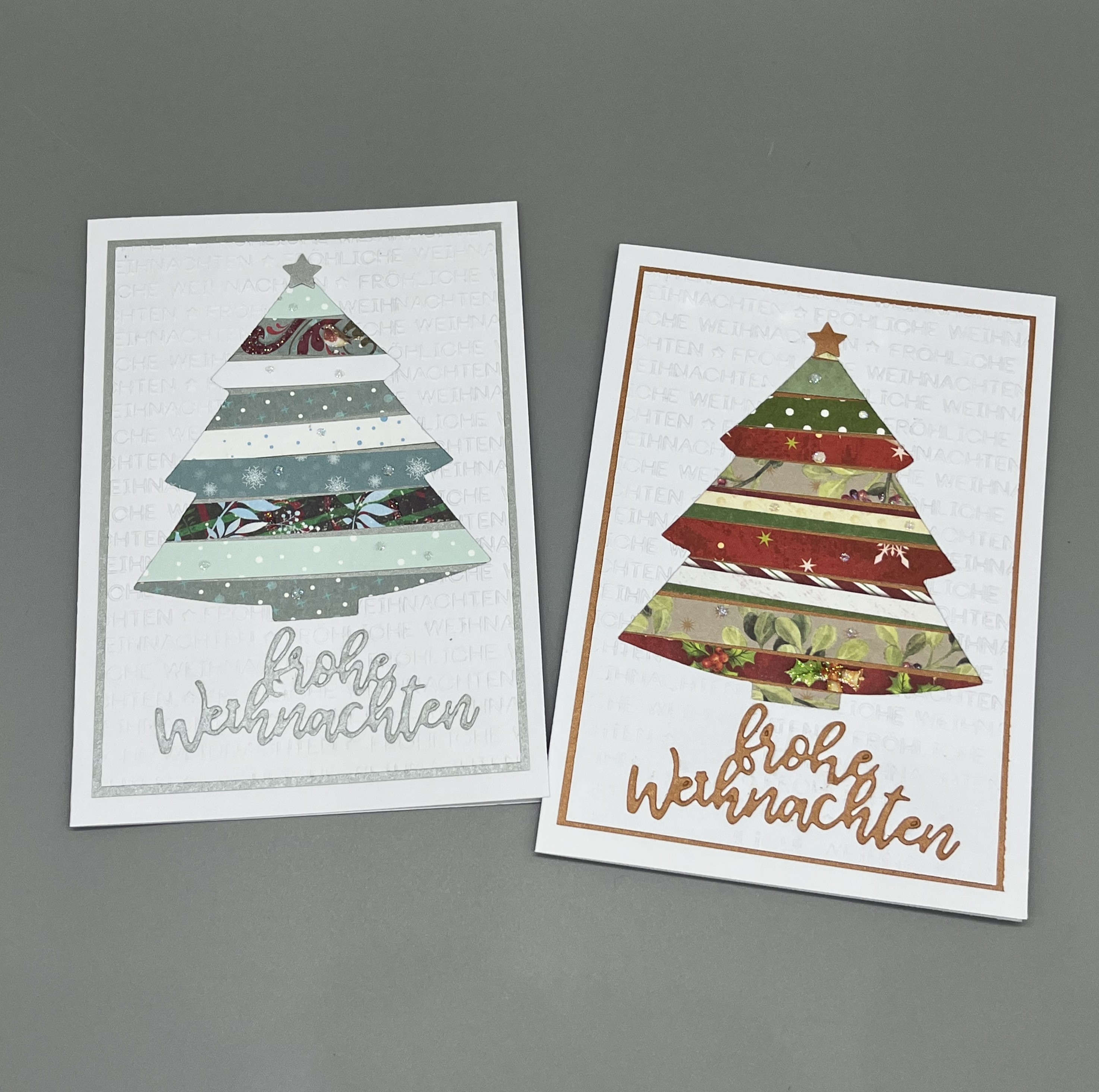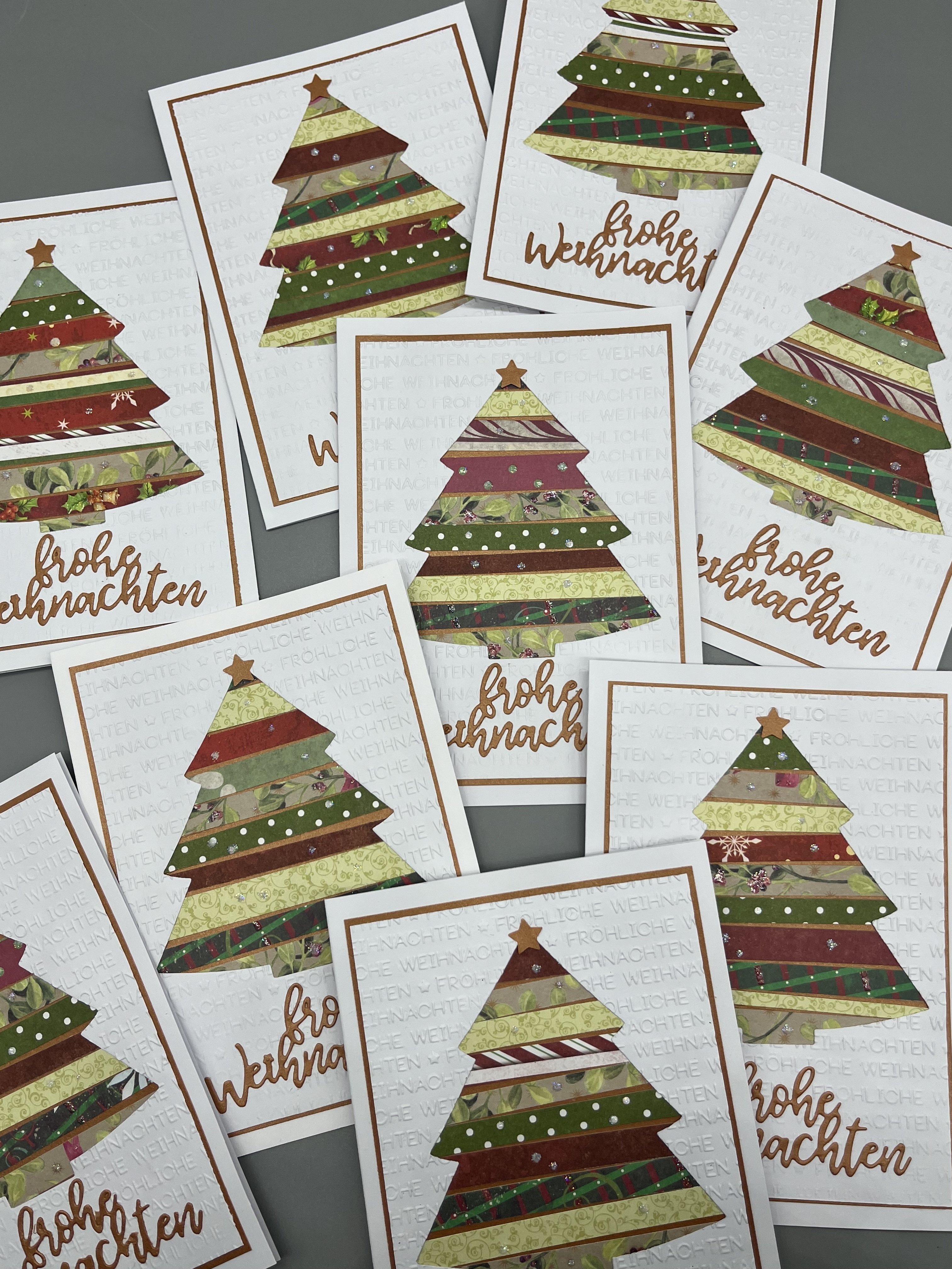 - Mit kupferfarbenem Aufleger und Designpapierstreifen in Rot- und Grüntönen
