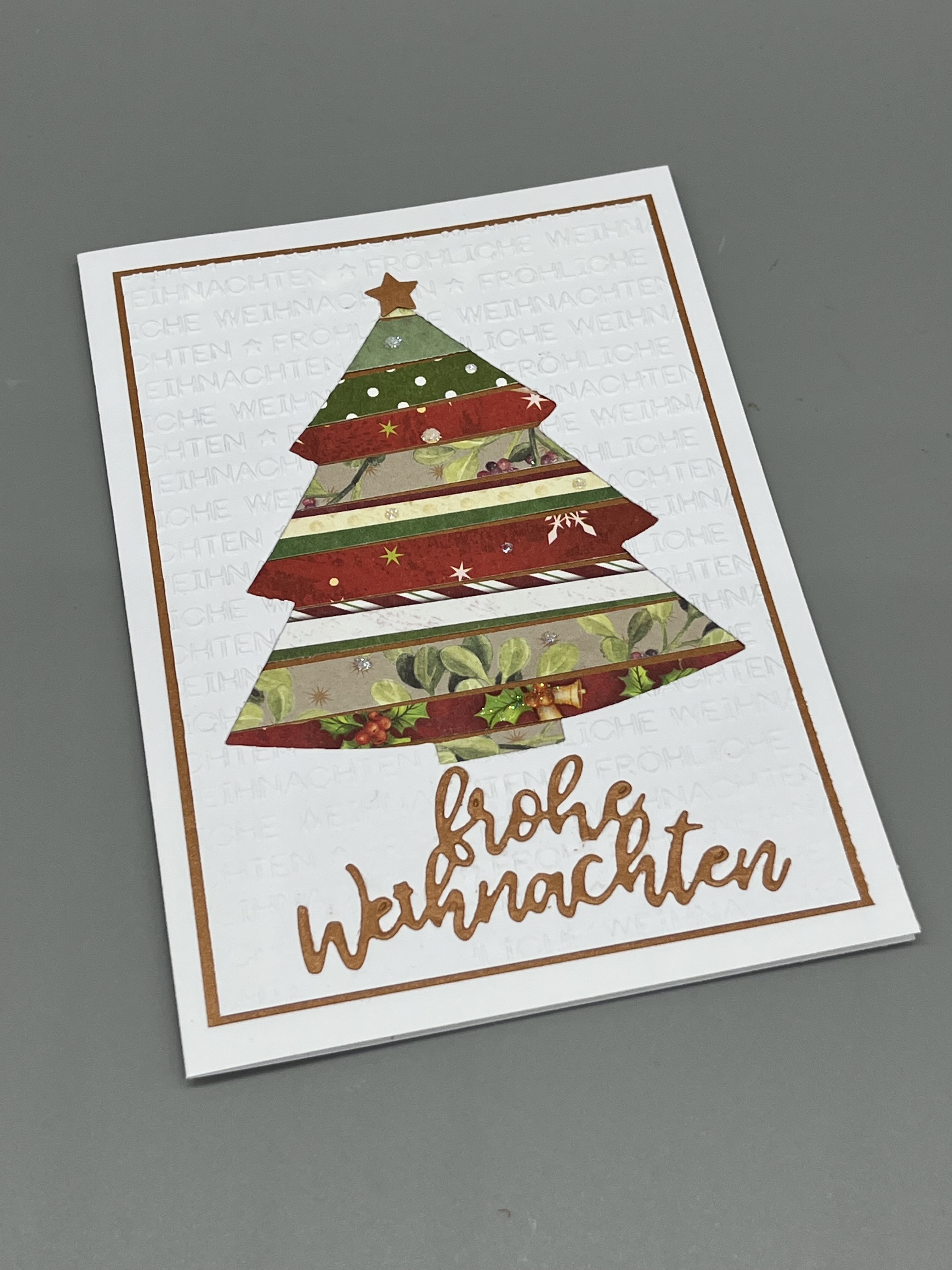 Eine weihnachtliche Tanne steht im Mittelpunkt dieser Klappkarte. Der Gruß "frohe Weihnachten" ist darunter zu lesen und eine Prägung mit den Worten "Fröhliche Weihnachten" umrahmt das Bäumchen.