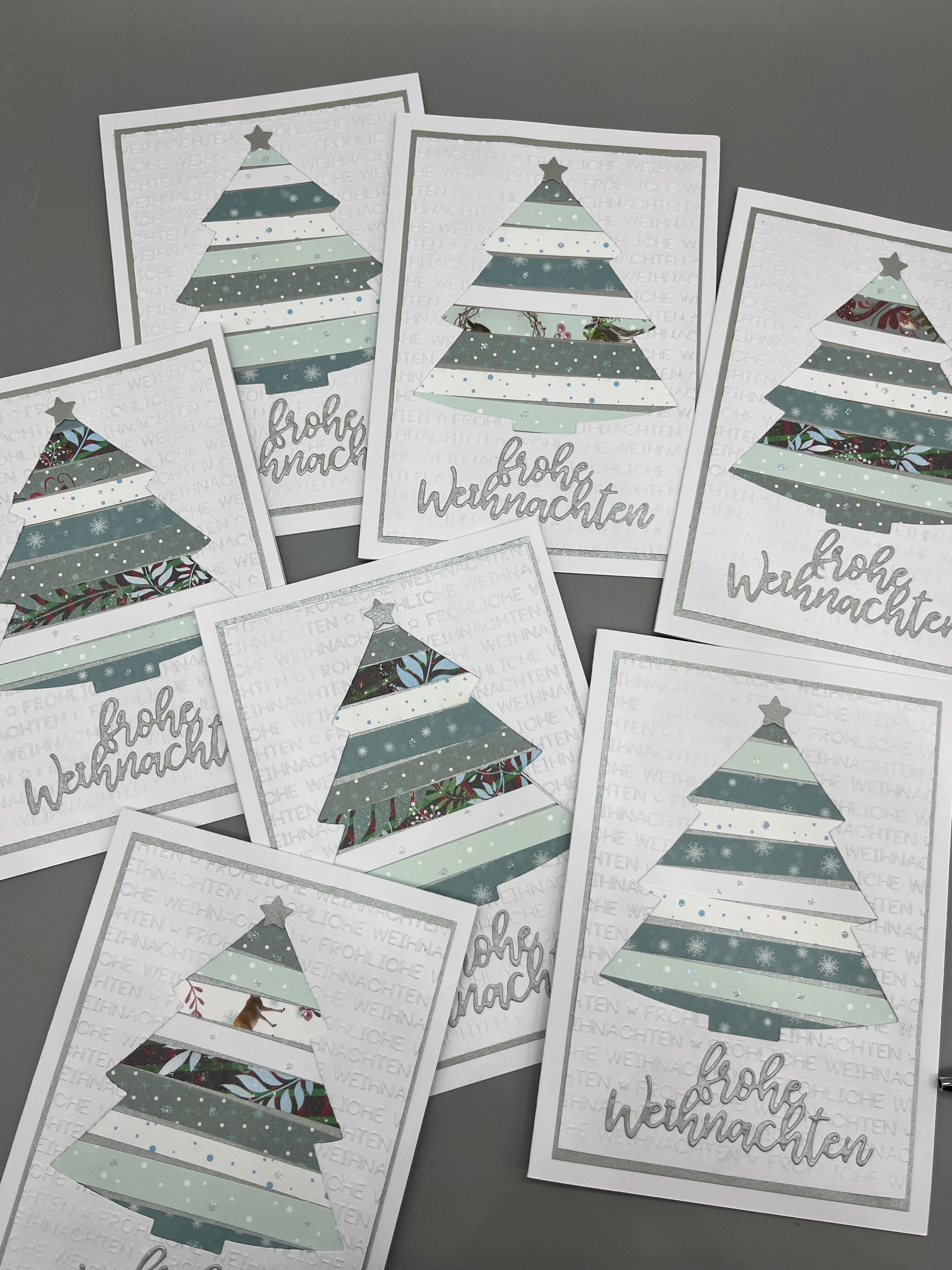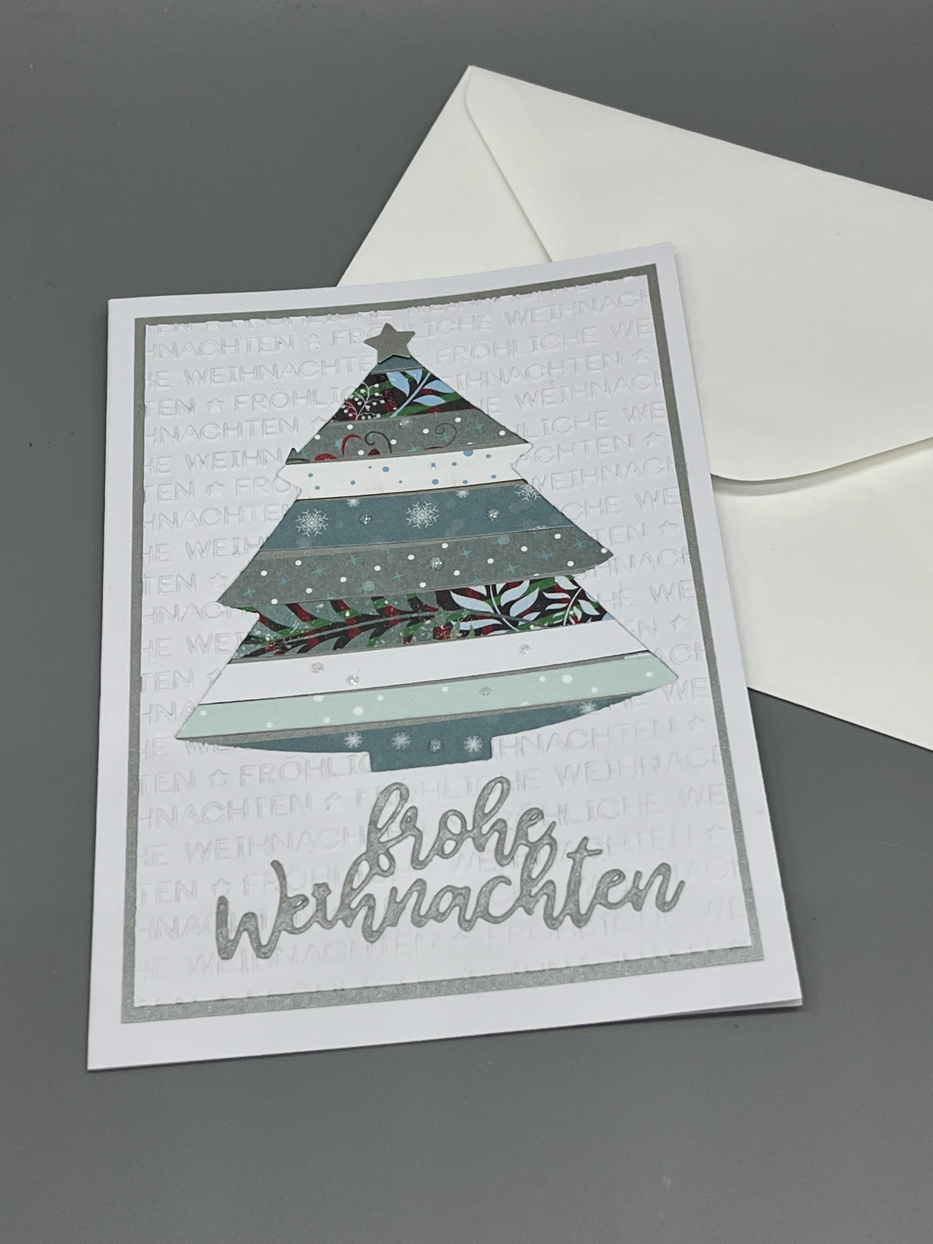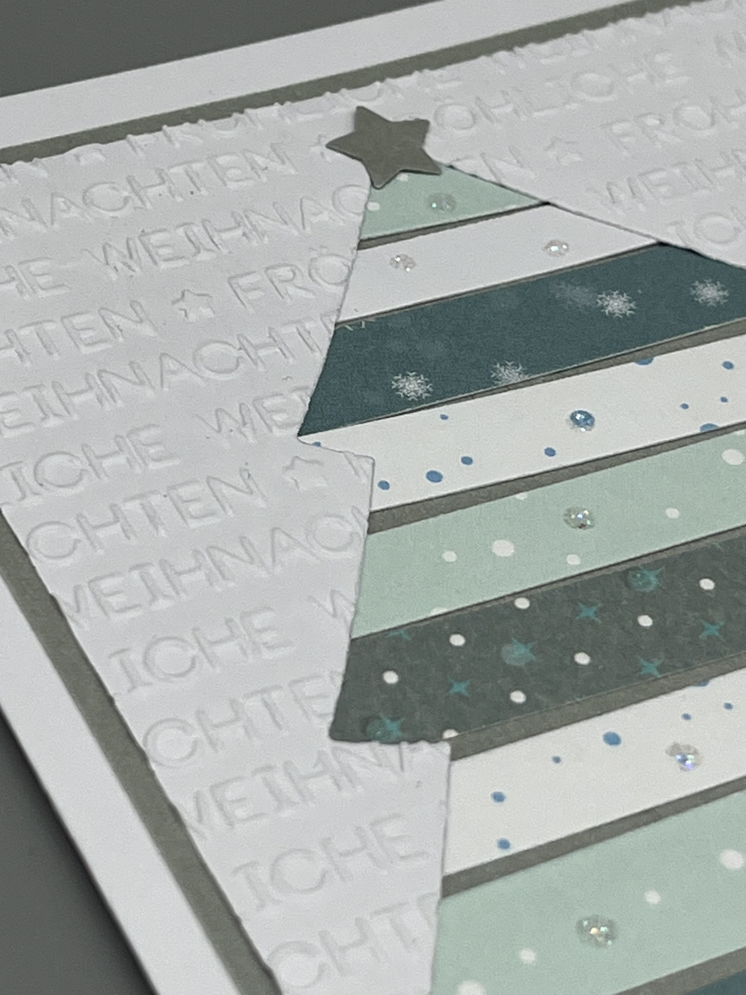 Die Karte habe ich aus verschiedenen Papieren zusammengefügt. Dabei ist der Tannenbaum aus dem weißen, geprägten Aufleger herausgestanzt und mit verschiedenen Streifen hinterlegt. Der farblich passende Aufleger darunter schaut zwischen den Streifen hindurch; er ist aus Metallicpapier. Hier und da habe ich einen zusätzlichen kleinen Glitzerpunkt gesetzt.