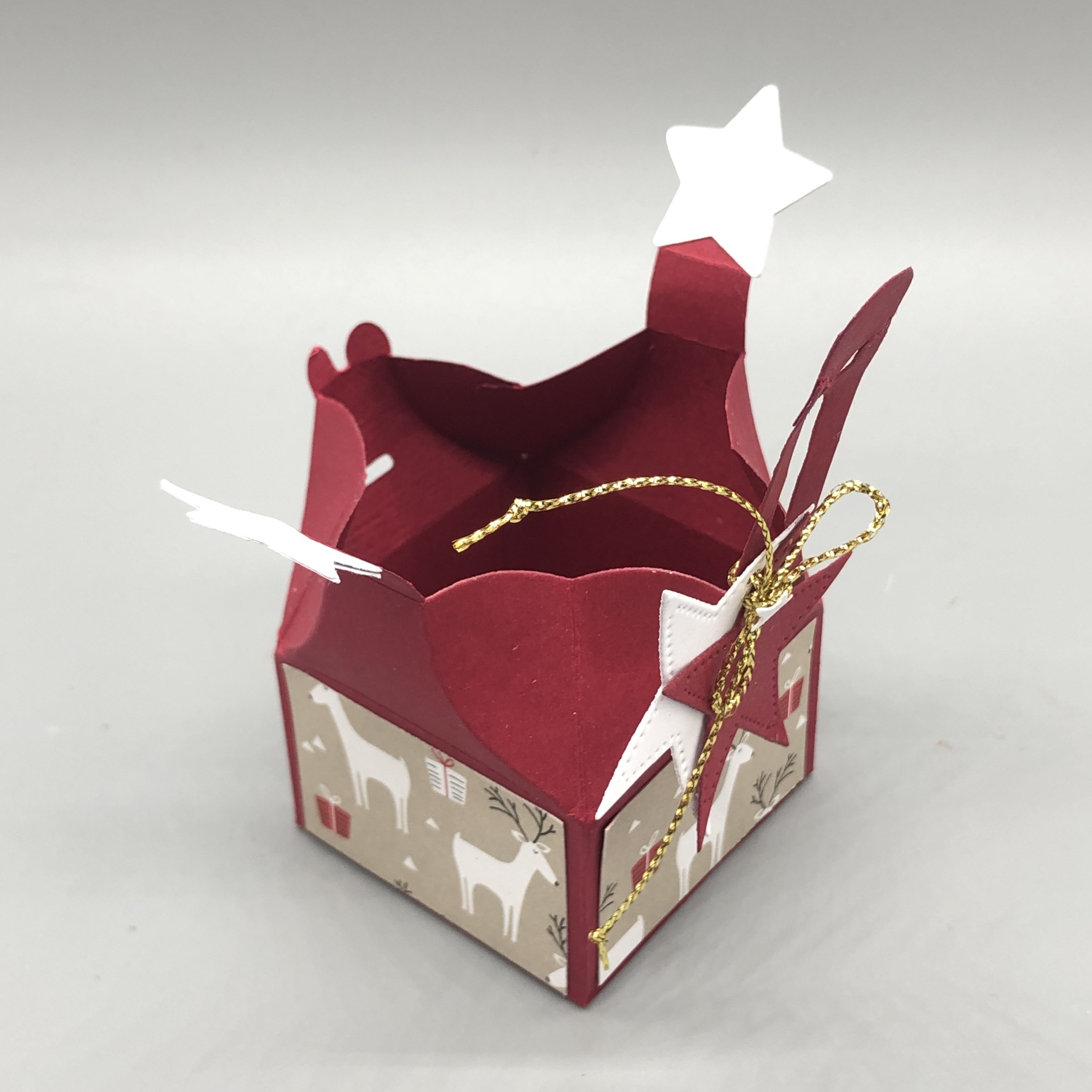 In der weihnachtlichen Schachtel aus Motiv- und Fotokarton finden kleinere Präsente ihren Platz: ein Schmuckstück, Geld, etwas Süßes oder eine selbstgemachte Kleinigkeit. Lege Dein Geschenk einfach in die Box, anstatt Dich damit herumzuärgern, schwierig zu verpackende Dinge ansprechend in Papier einwickeln zu wollen.