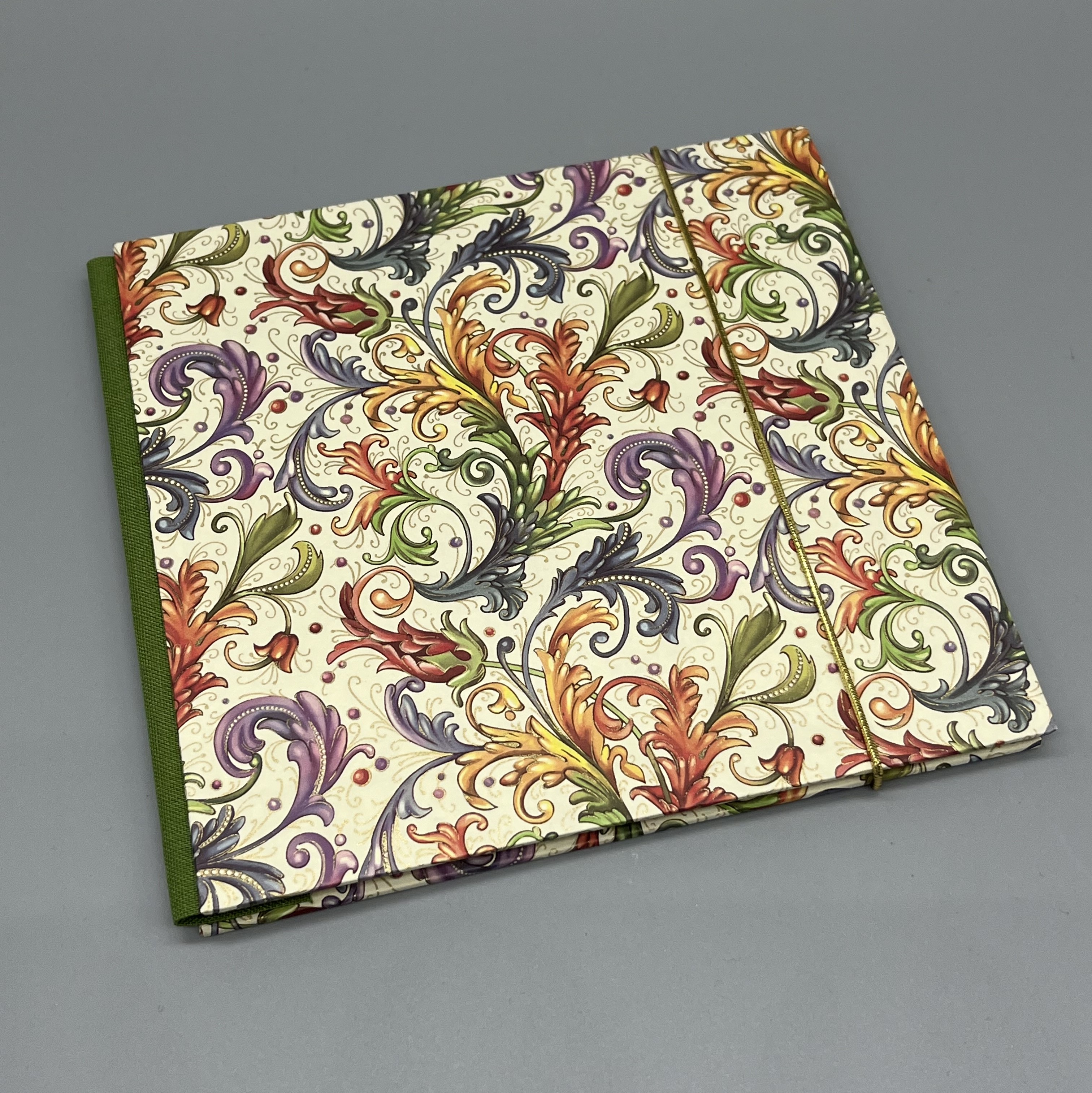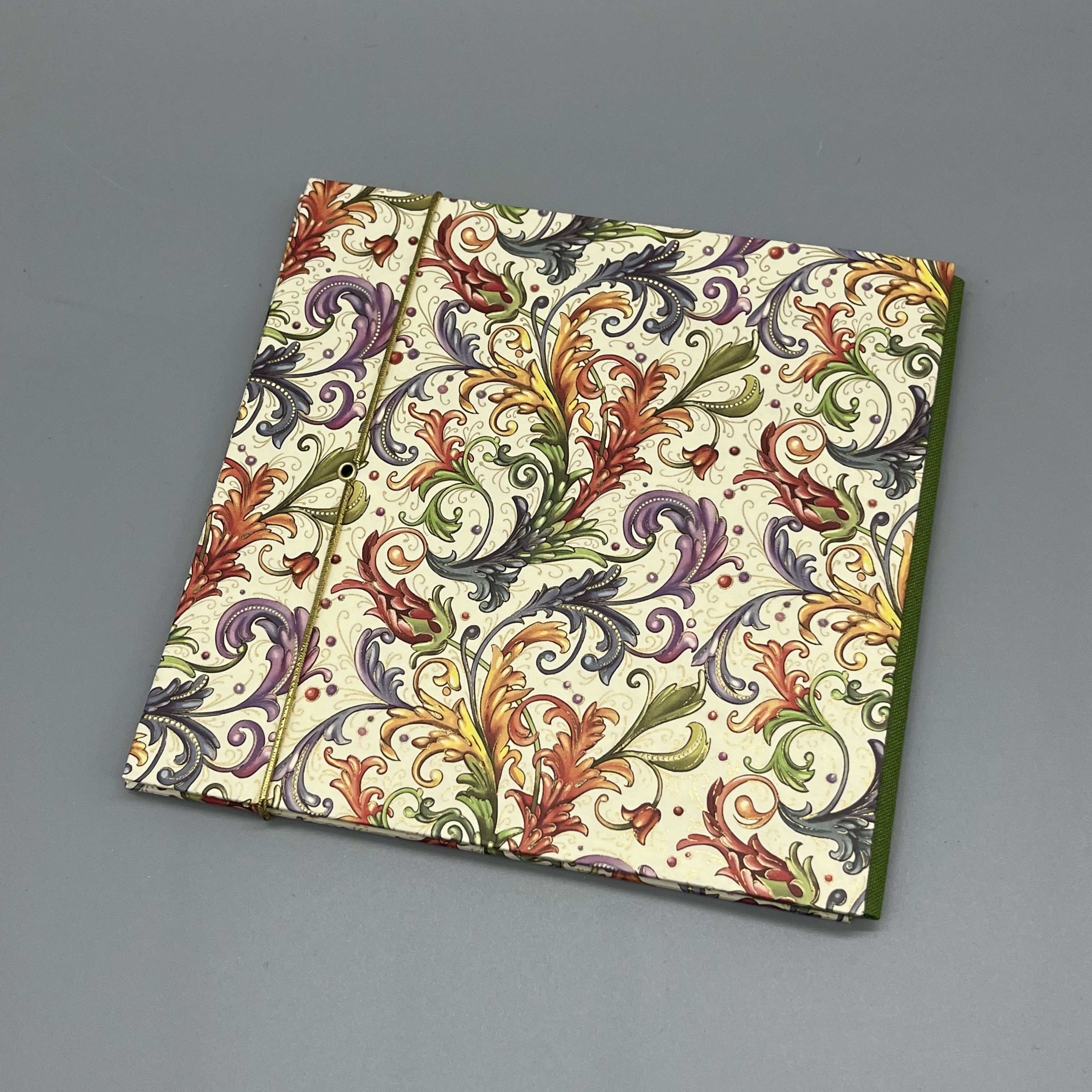 Das Bezugspapier schmückt das Leporello außen mit einem klassischen Florentiner Muster in bunten Farben mit dezentem Golddruck.