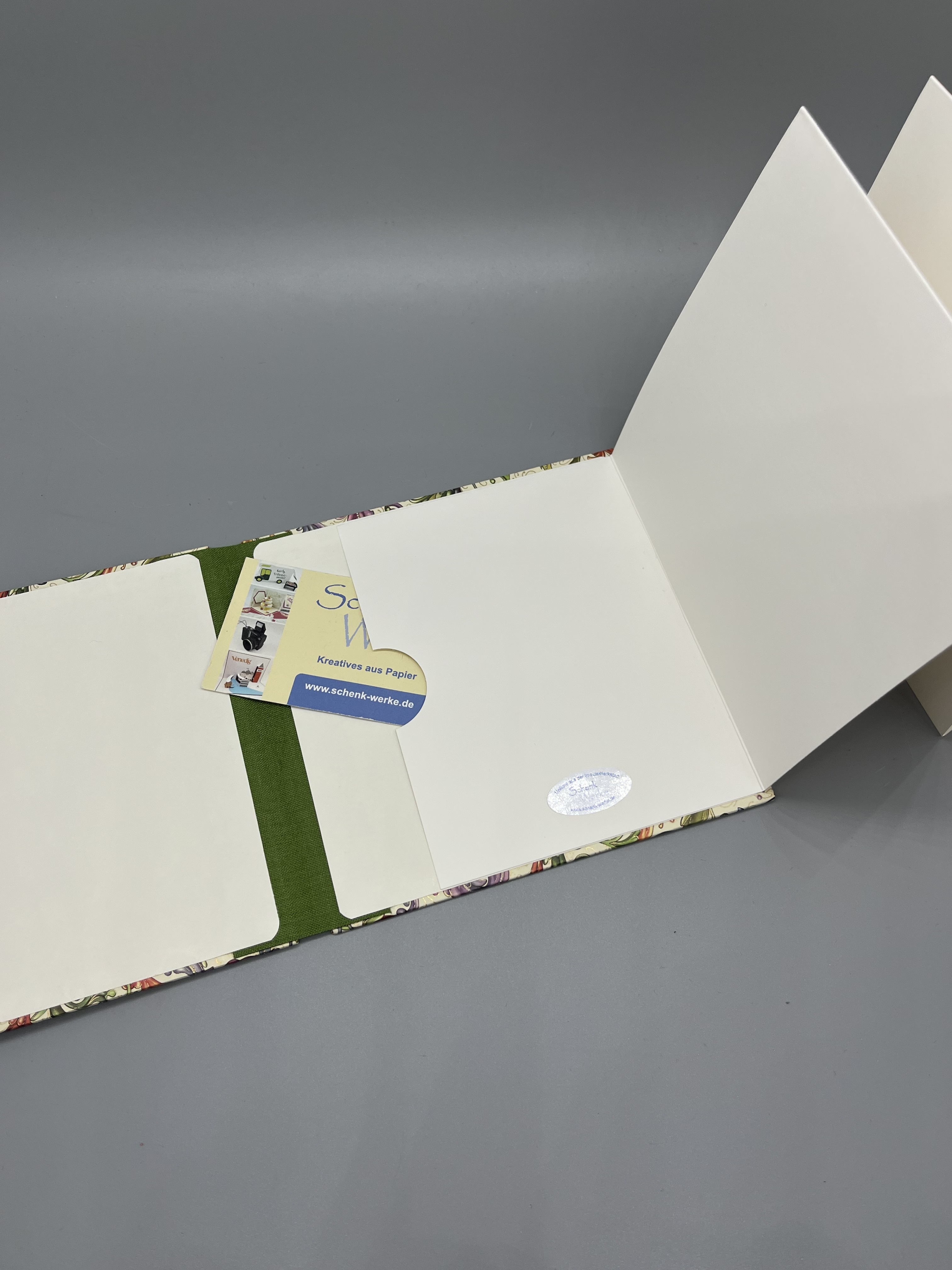 Zusätzlich zu den Seiten gibt es ein Steckfach im hinteren Deckel, das lose Stücke aufnimmt. Ein Gut- oder Geldschein oder auch ein Ticket kann beispielsweise hier "versteckt" werden. So wird das Leporello auch noch zur Geschenkverpackung.