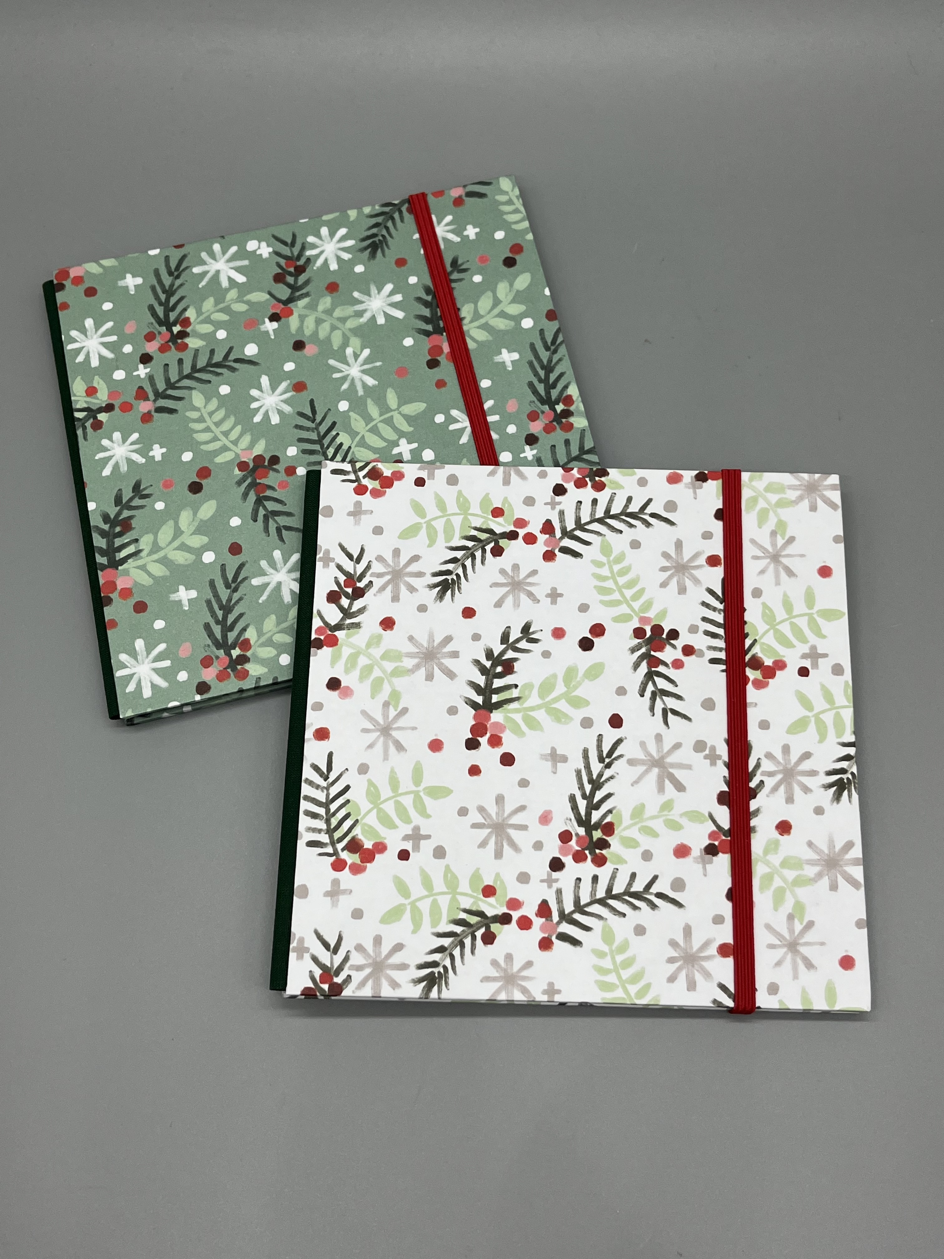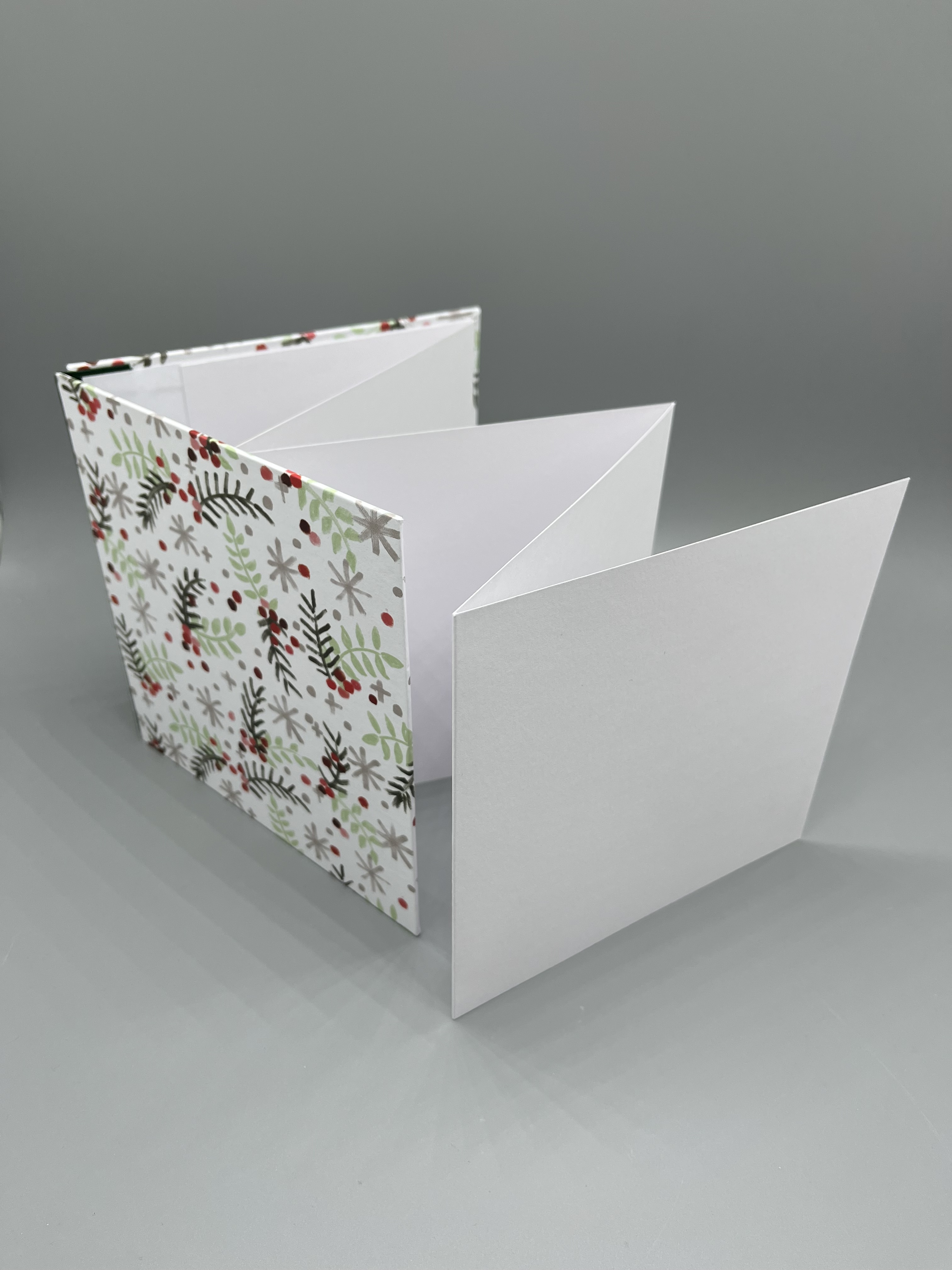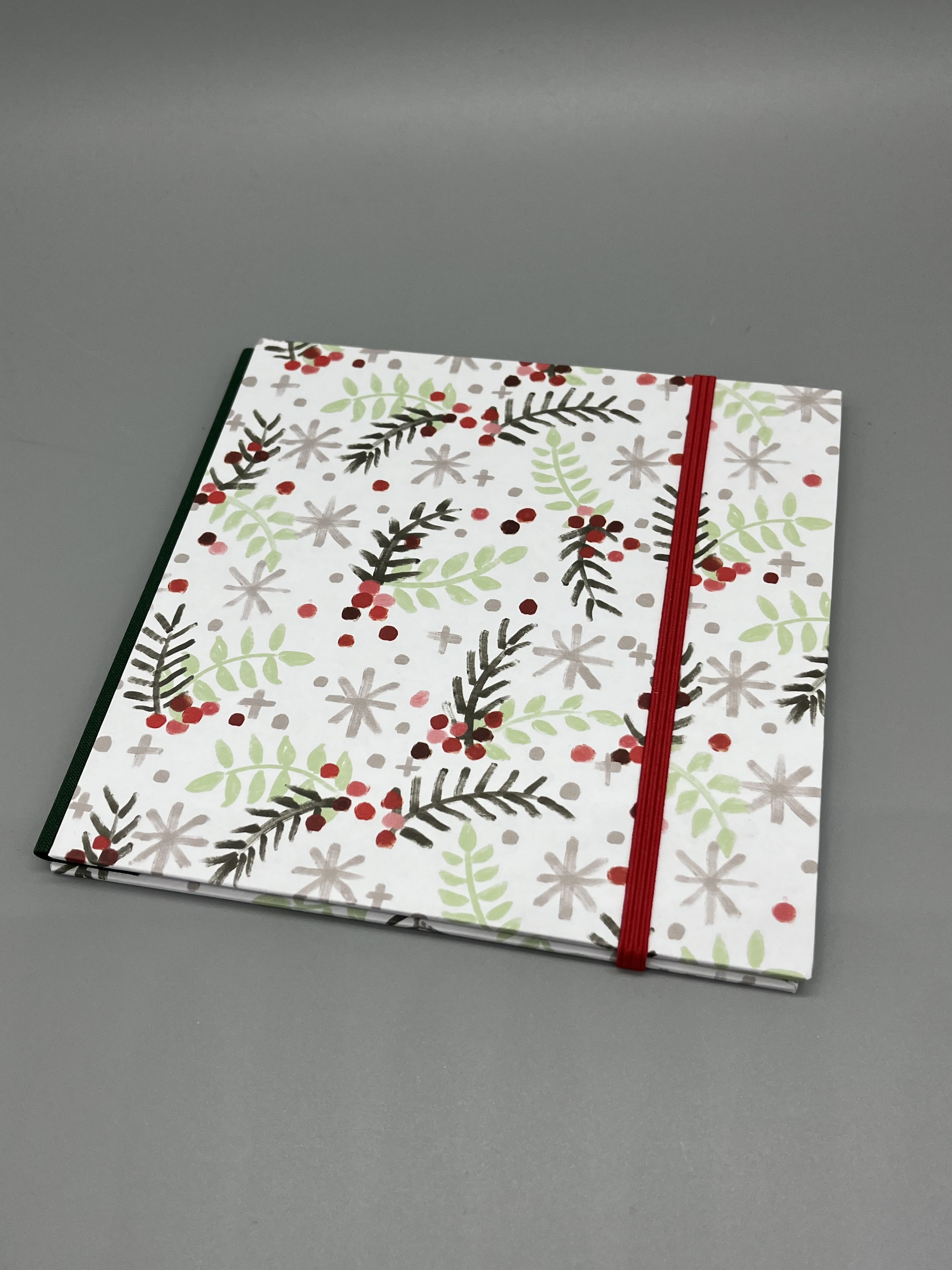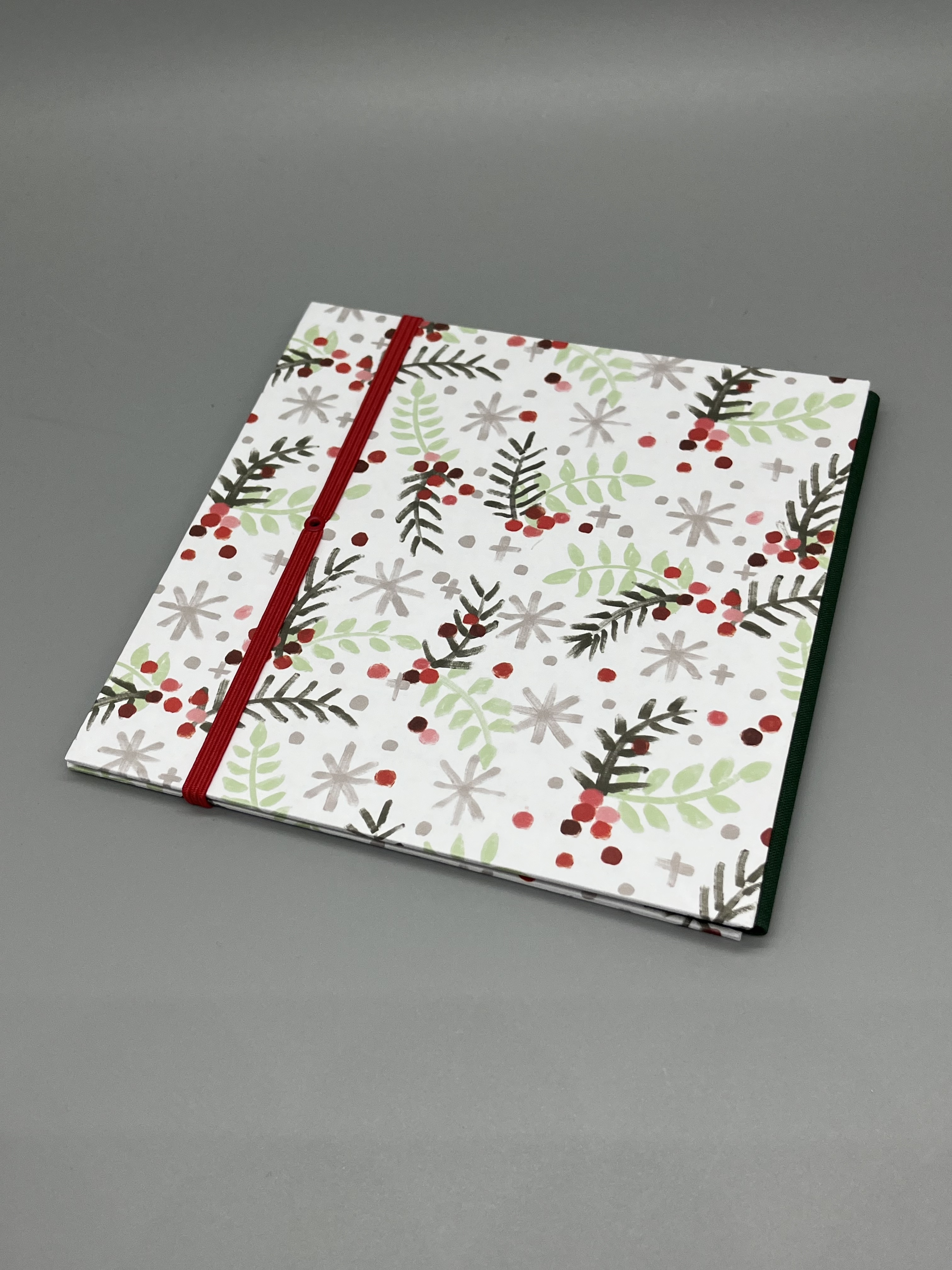 Das Bezugspapier schmückt das Leporello außen mit weihnachtlichen Zweigen und Beeren. Dazwischen wirbeln Schneeflocken. Der Hintergrund ist Weiß.