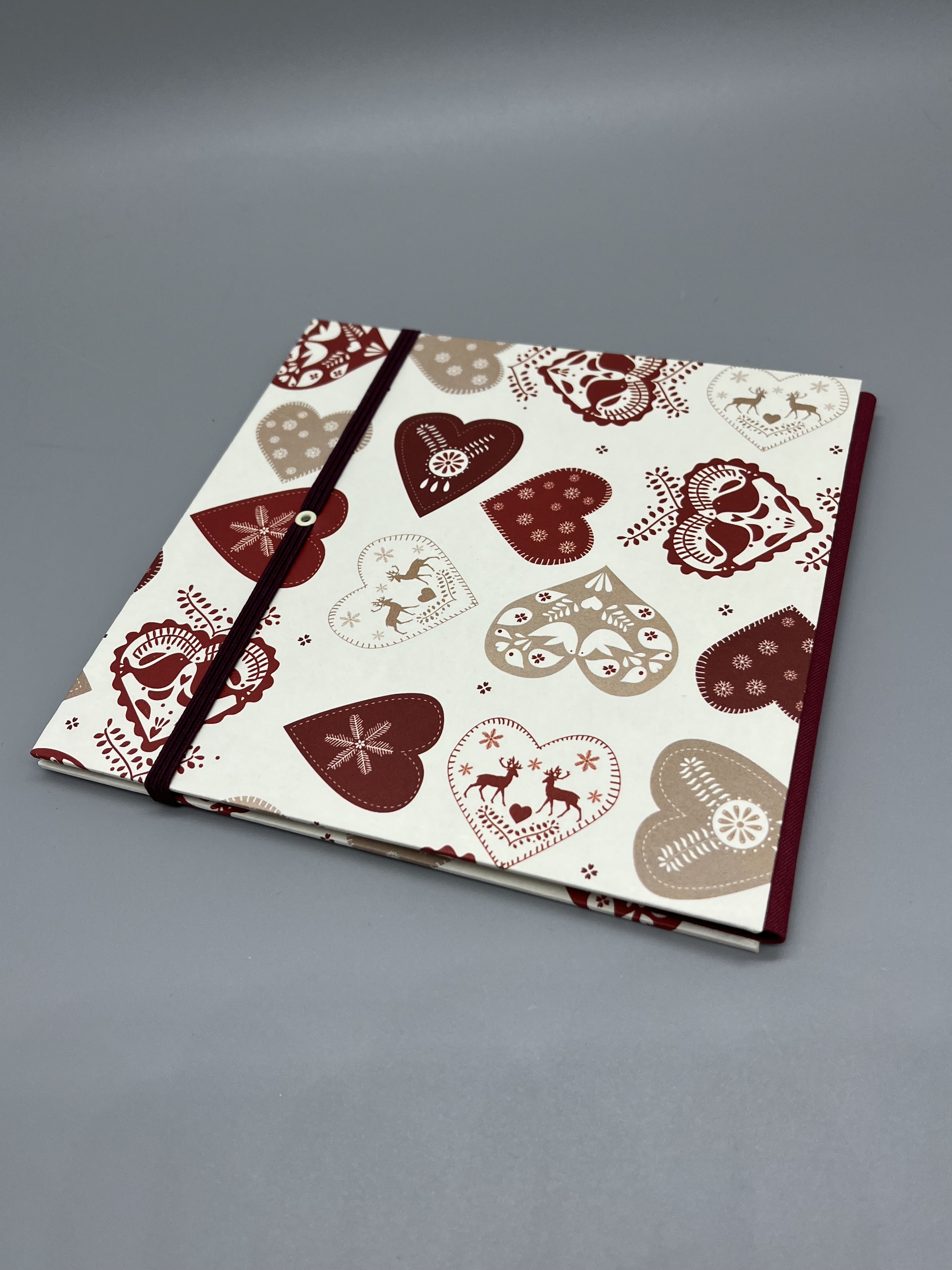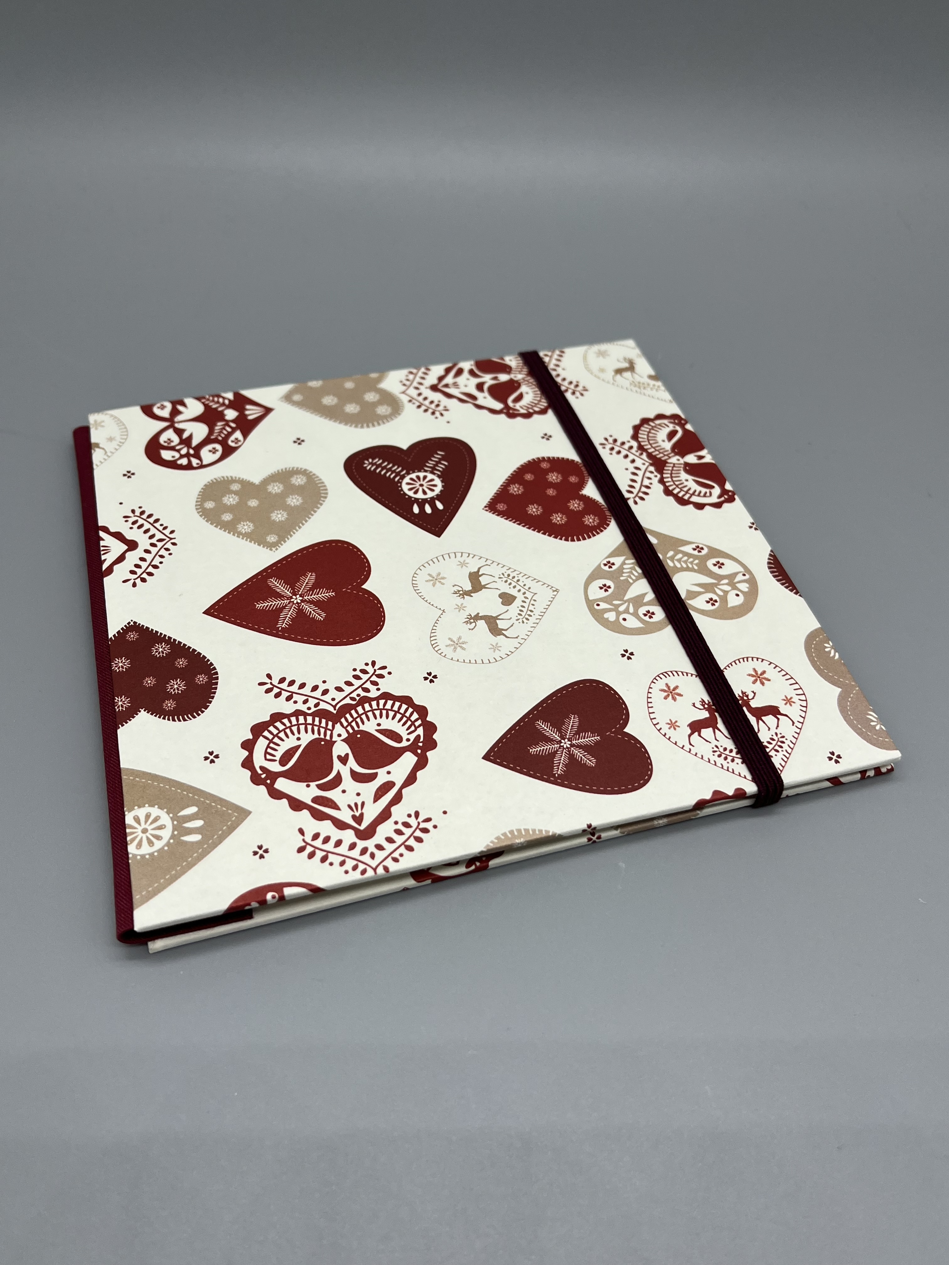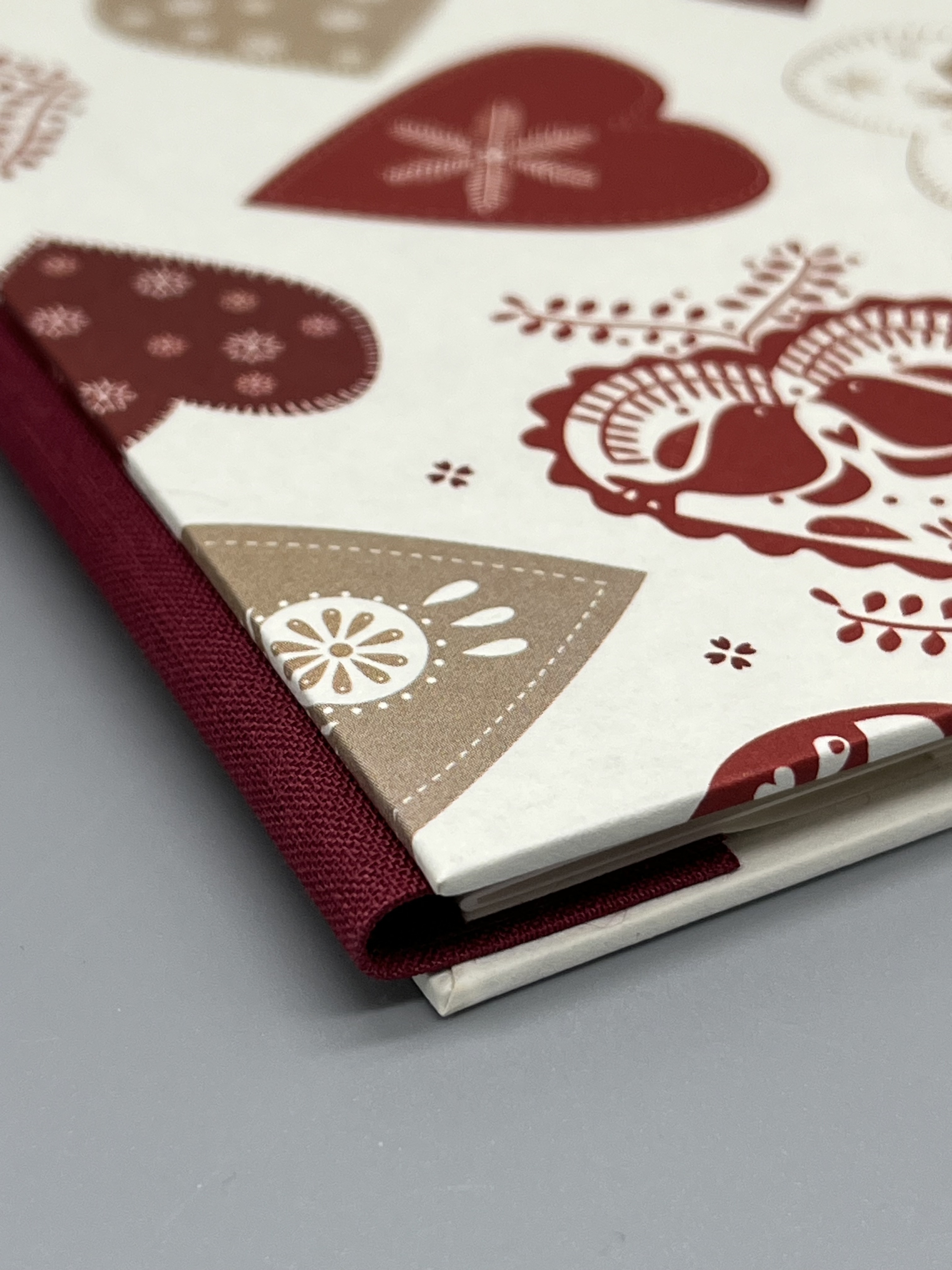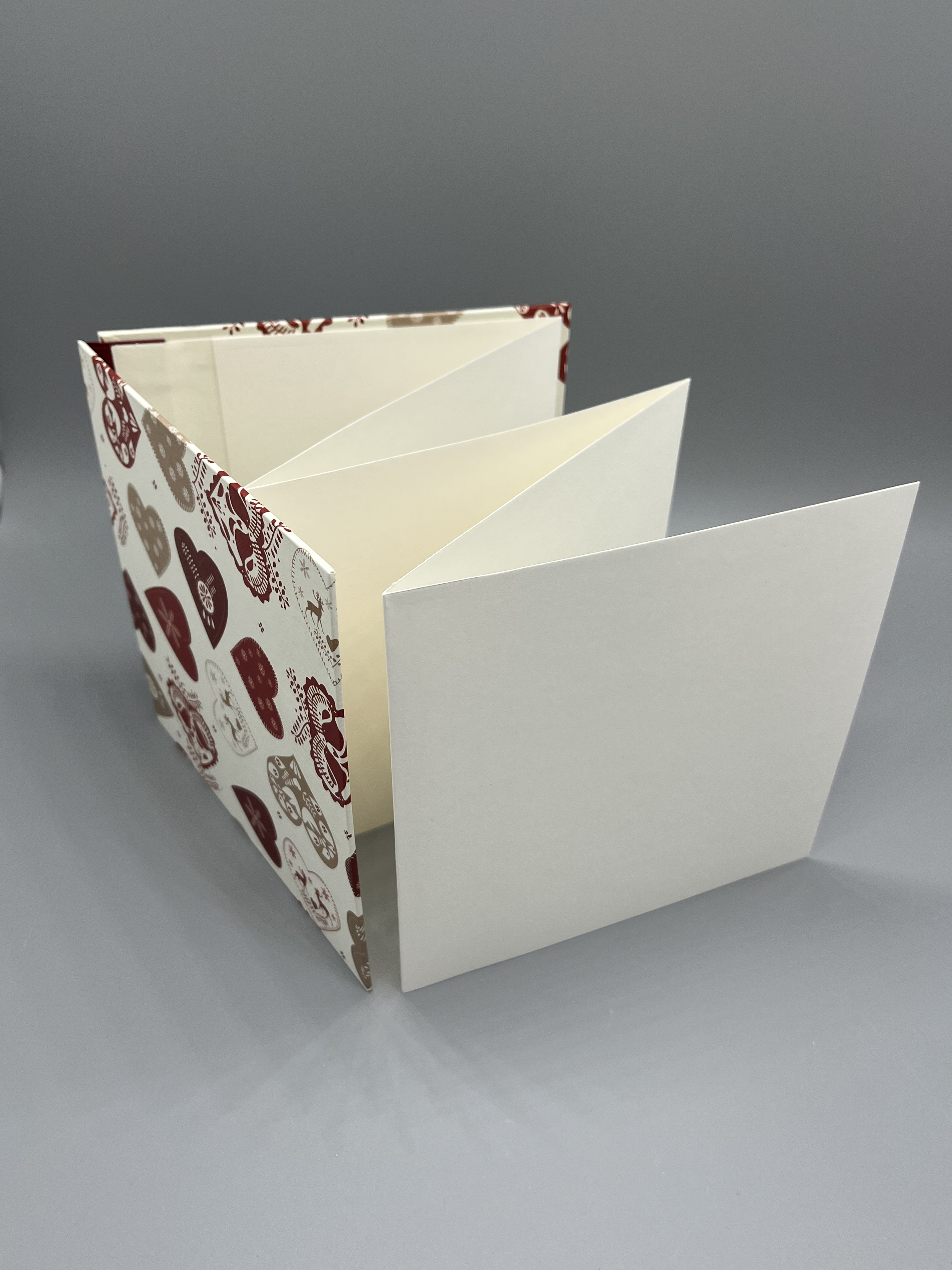Das Bezugspapier schmückt das Leporello außen mit verschiedenen Herzen im skandinavischen Stil. Sie sind weinrot oder beige auf cremeweißem Hintergrund.
