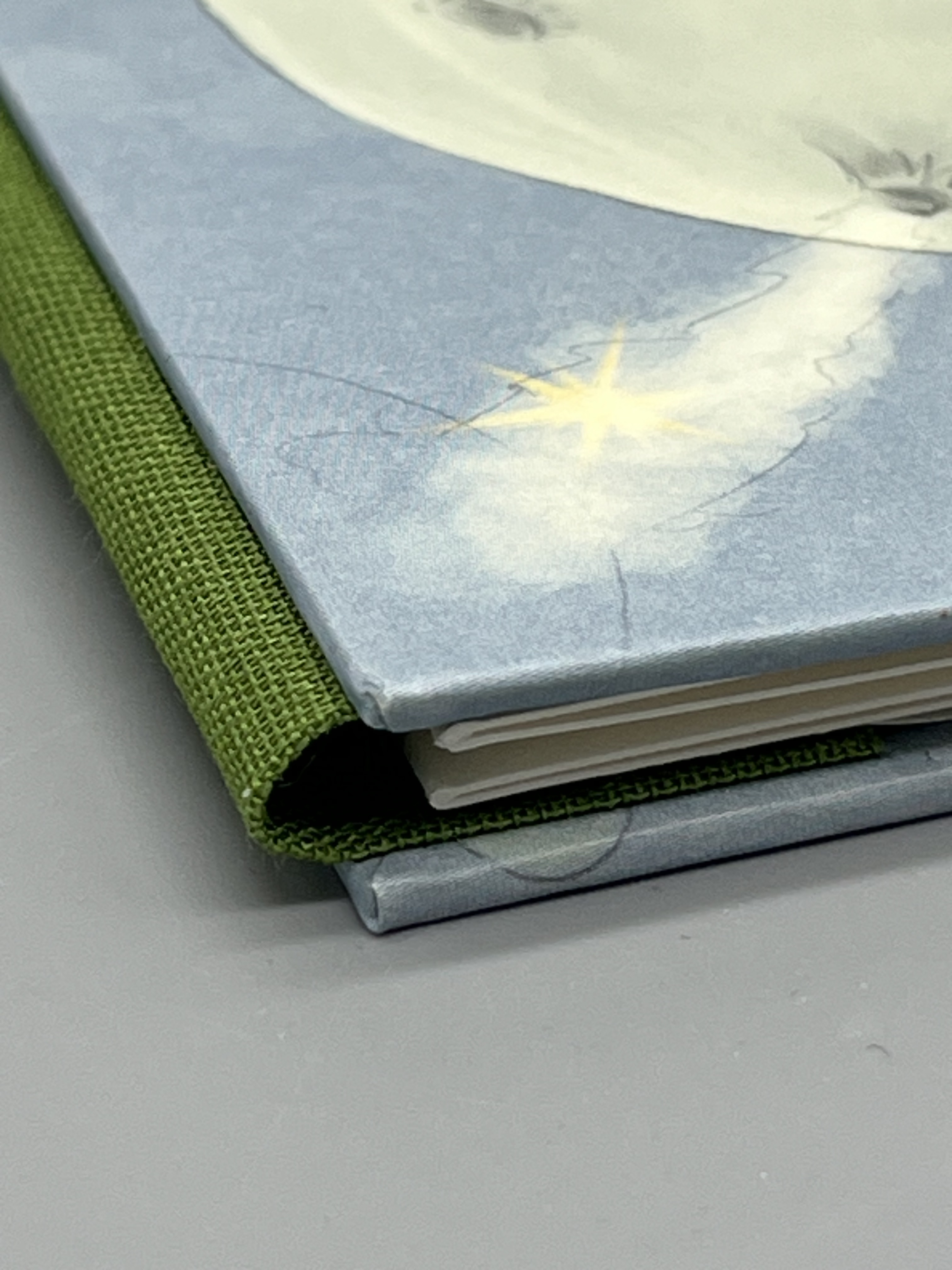Dieses Büchlein ist mit viel Liebe handgebunden. Ich habe dafür feste Graupappe, ein hochwertiges, italienisches Bezugspapier und grünes Buchleinen genutzt.