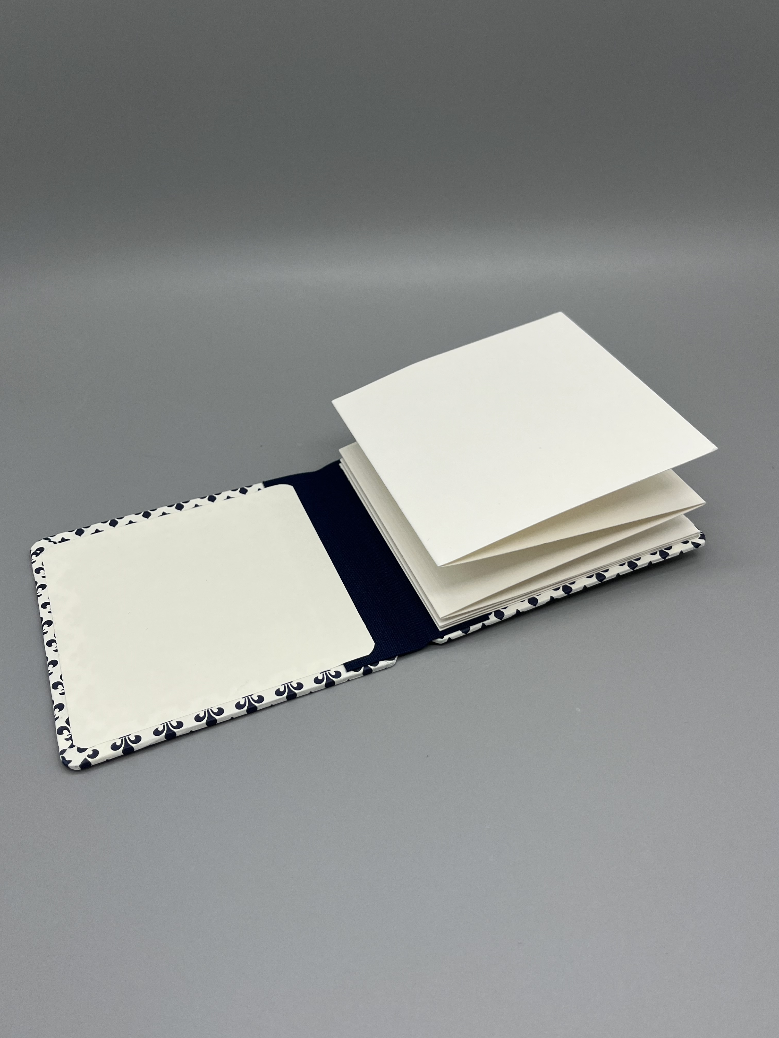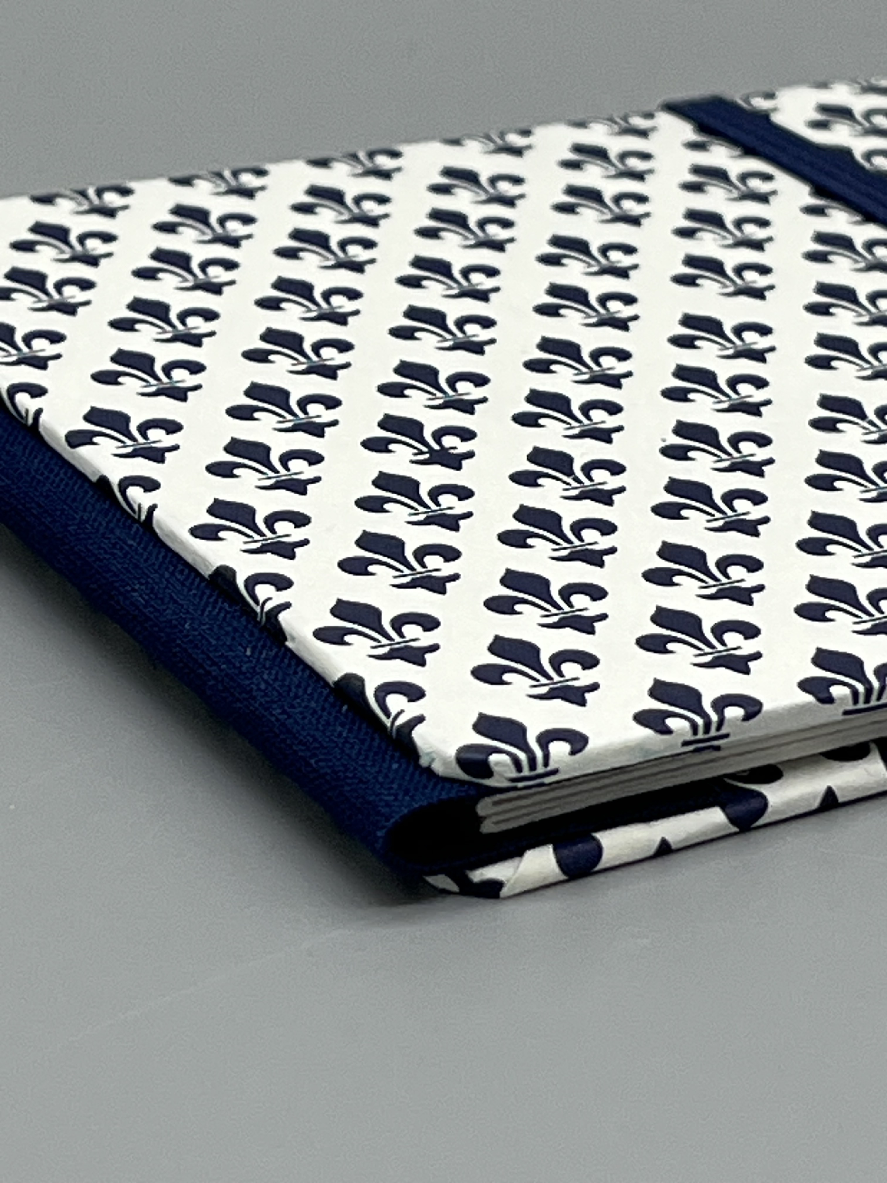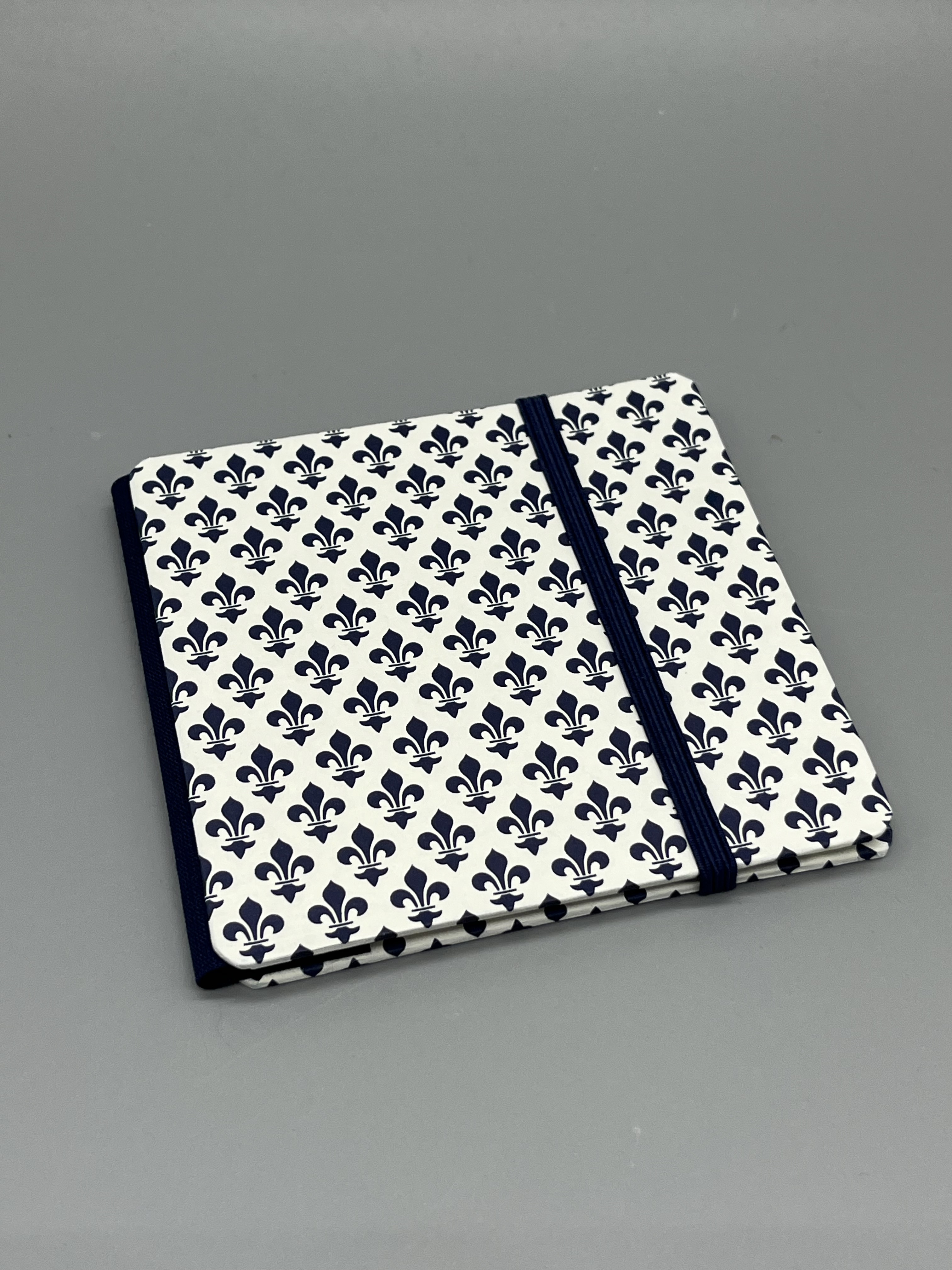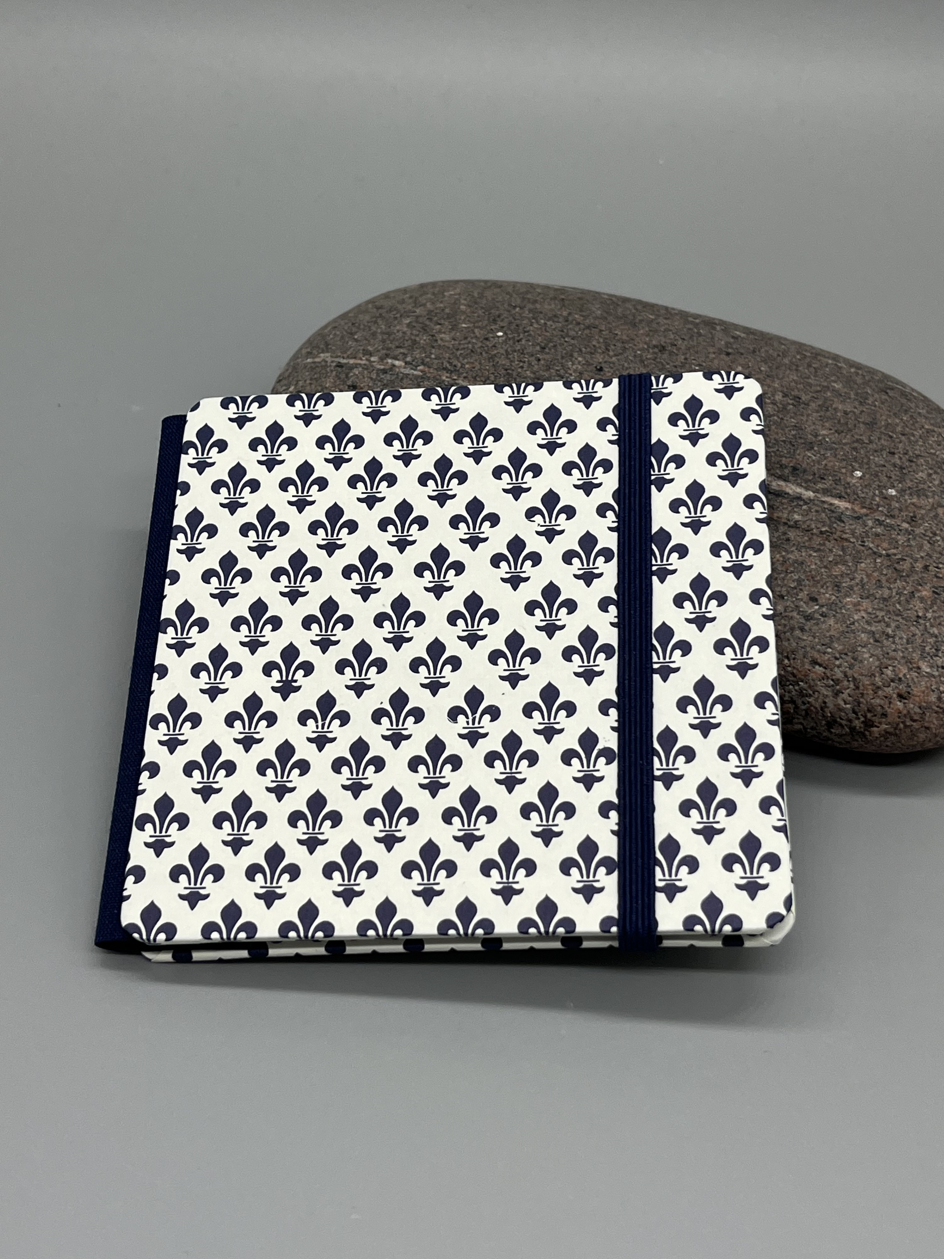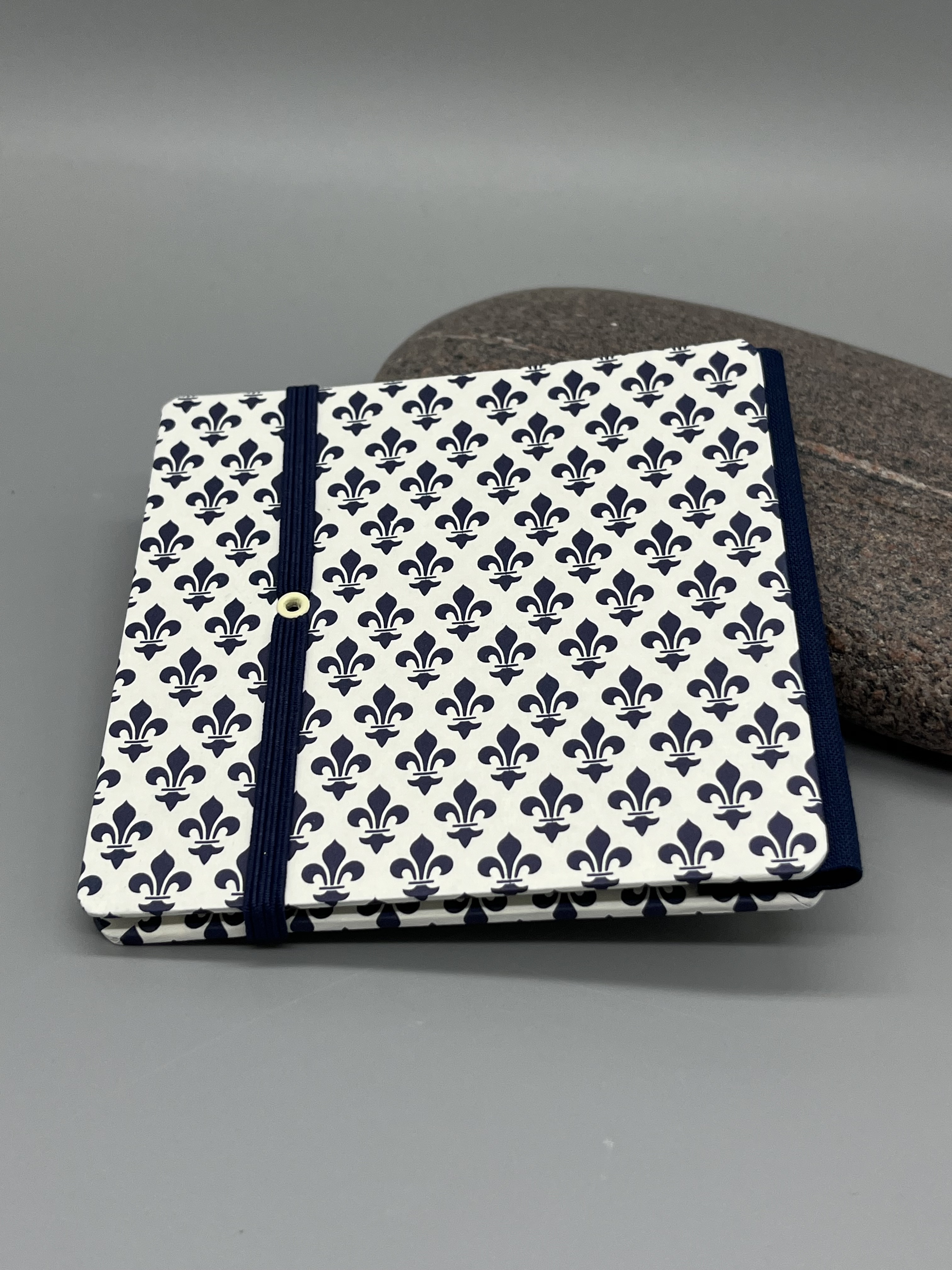 Dieses Büchlein ist mit viel Liebe handgebunden. Ich habe dafür feste Graupappe, ein hochwertiges Bezugspapier mit Carta Varese-Druck und dunkelblaues Buchleinen genutzt.