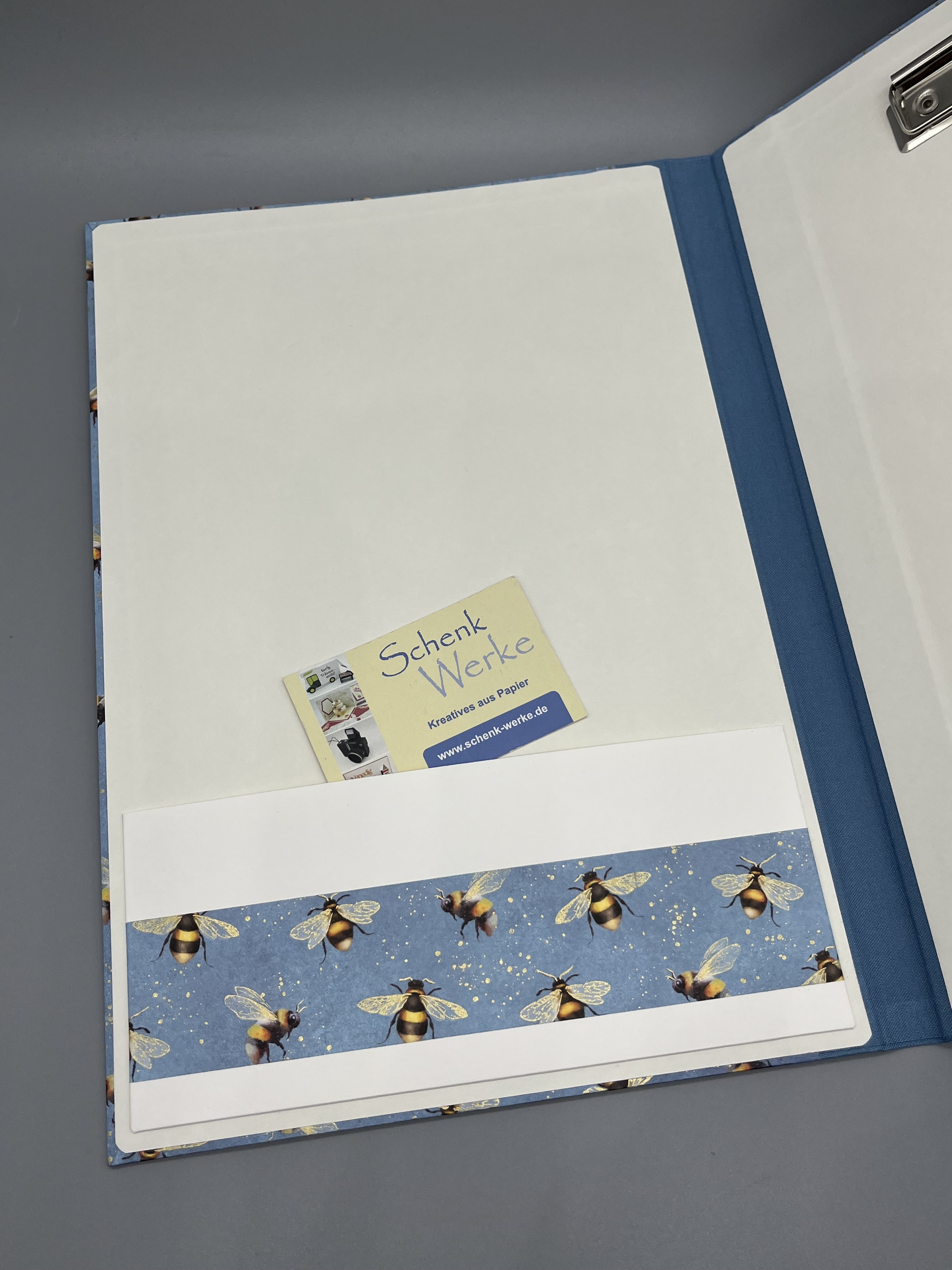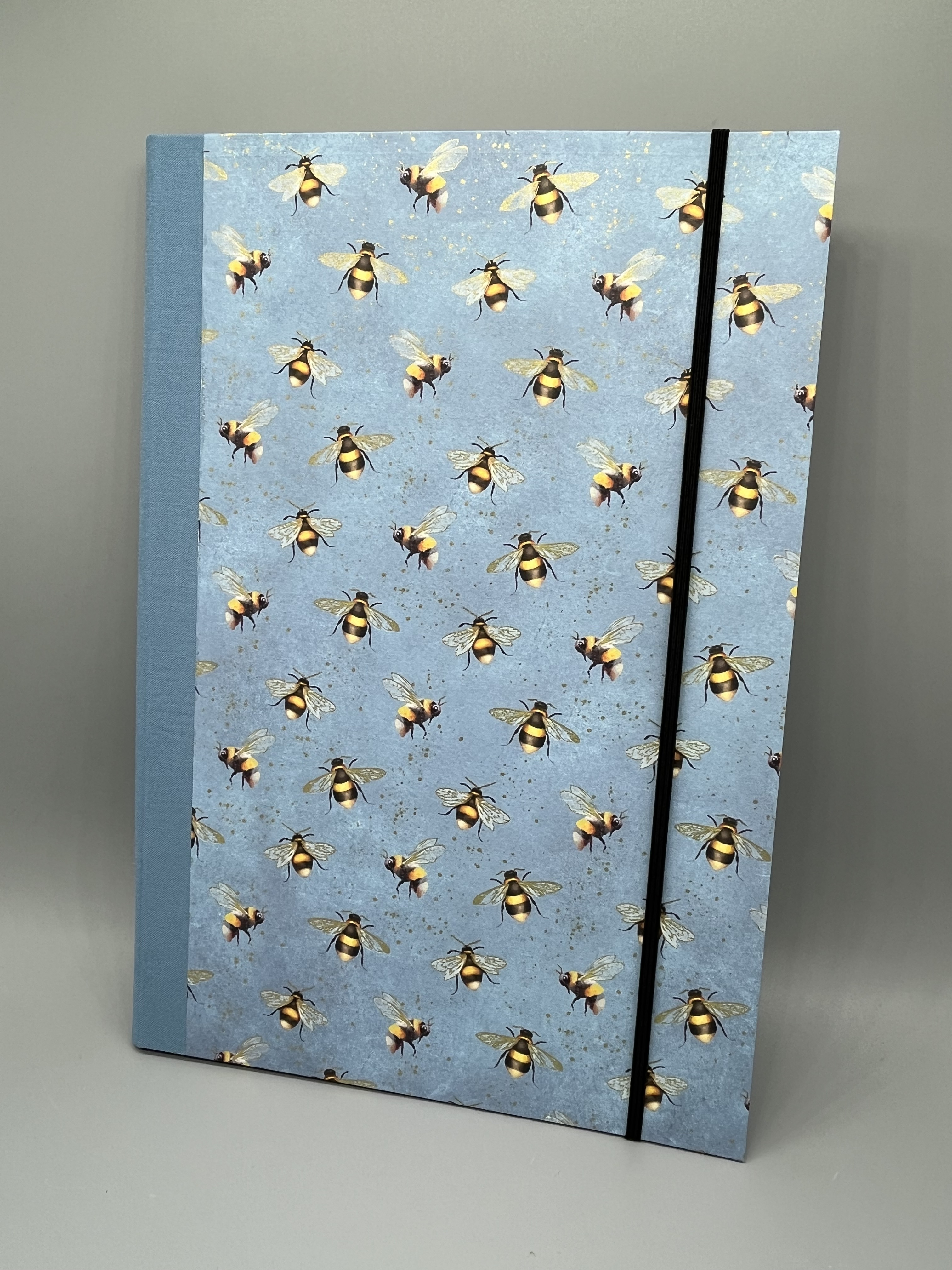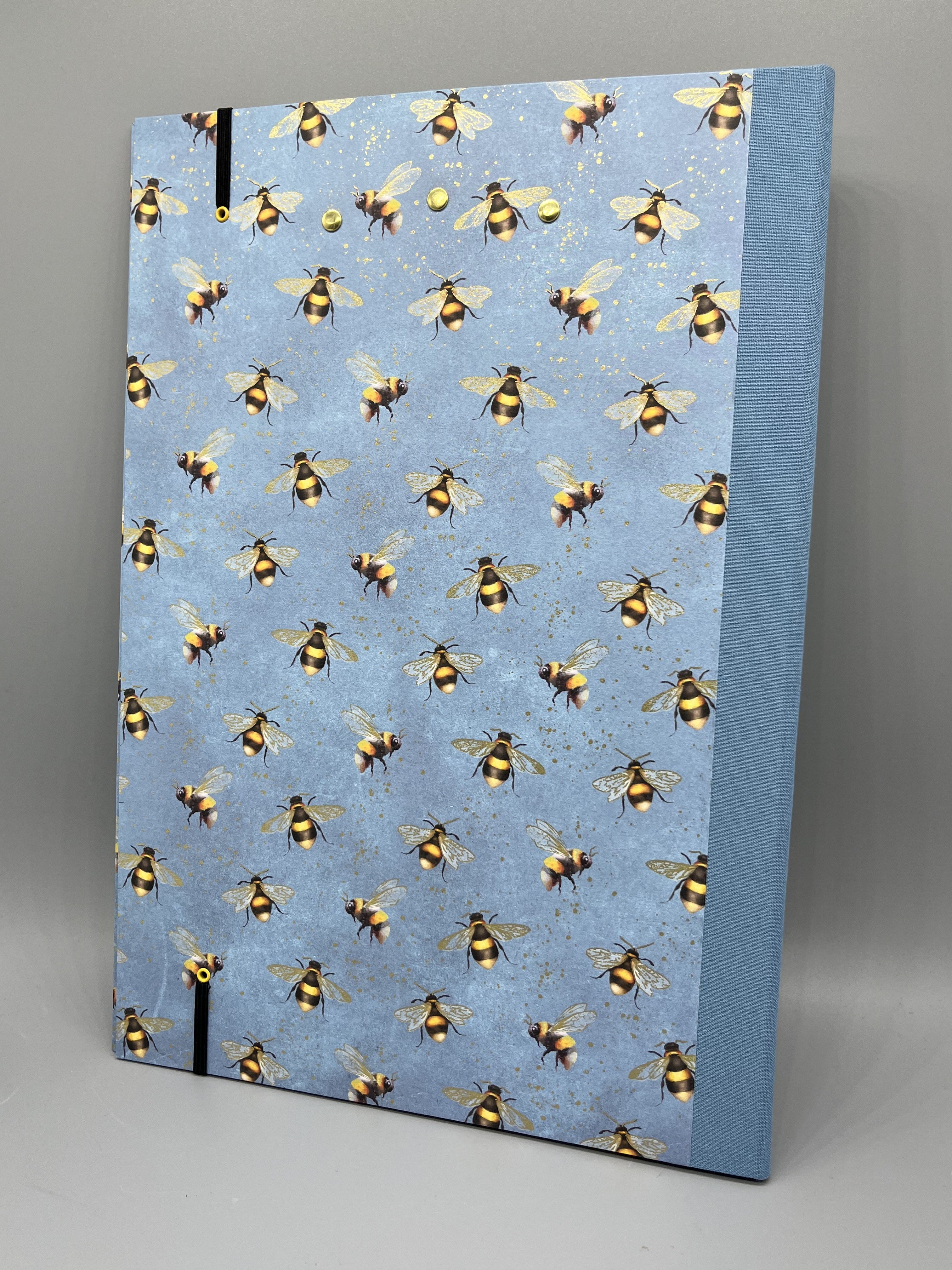 Gefertigt ist die Klemm-Mappe A4 Bienen mit dem gleichnamigen Geschenkpapier aus unserem Sortiment. Innen sind die Deckel der Mappe mit hochwertigem Vorsatzpapier kaschiert. Den Buchrücken habe ich aus blauem Buchbinderleinen gefertigt. Passend zum Bienenthema hält ein schwarzes Gummiband die Mappe geschlossen, das ich mit gelben Nieten befestigt habe.