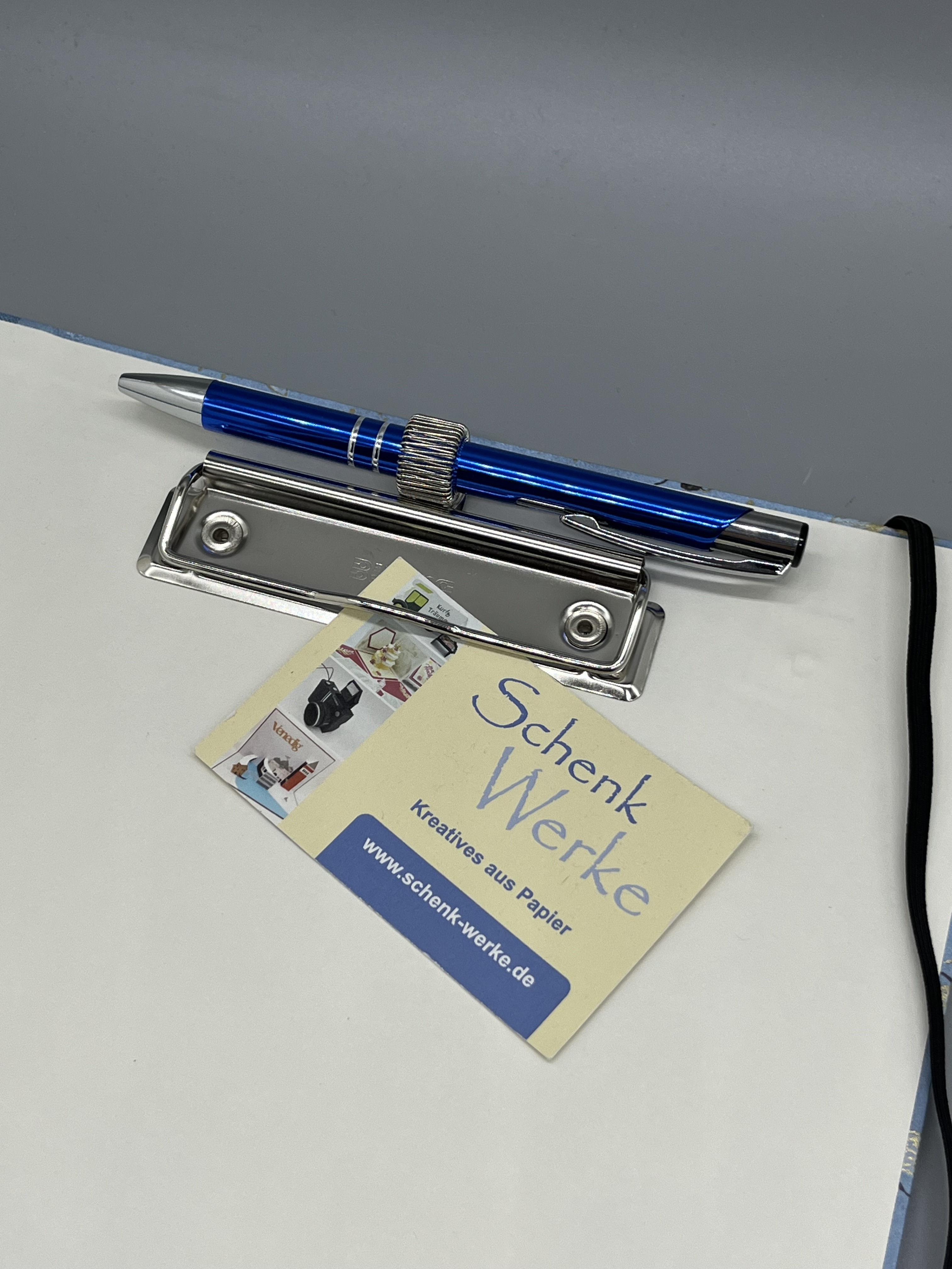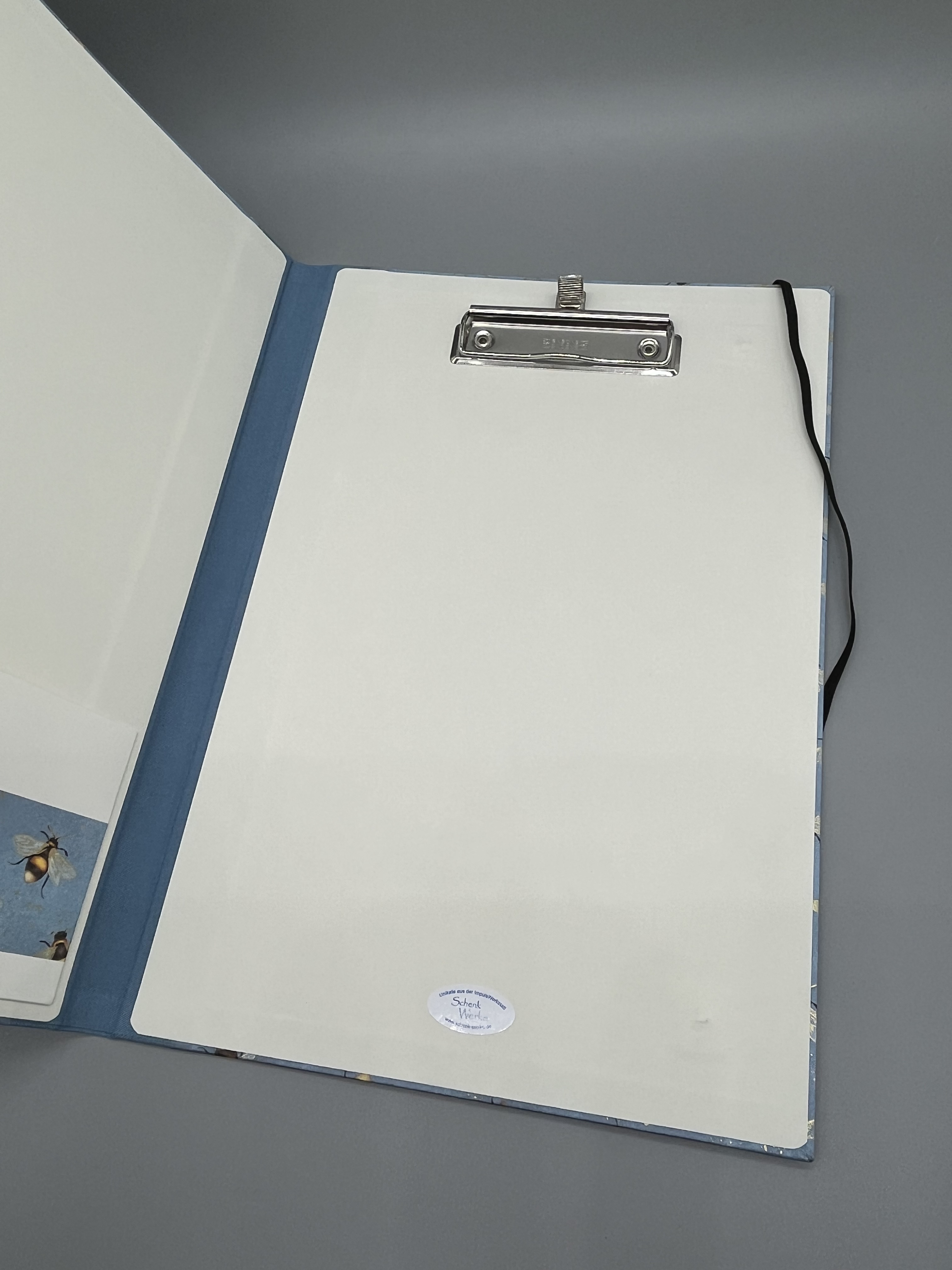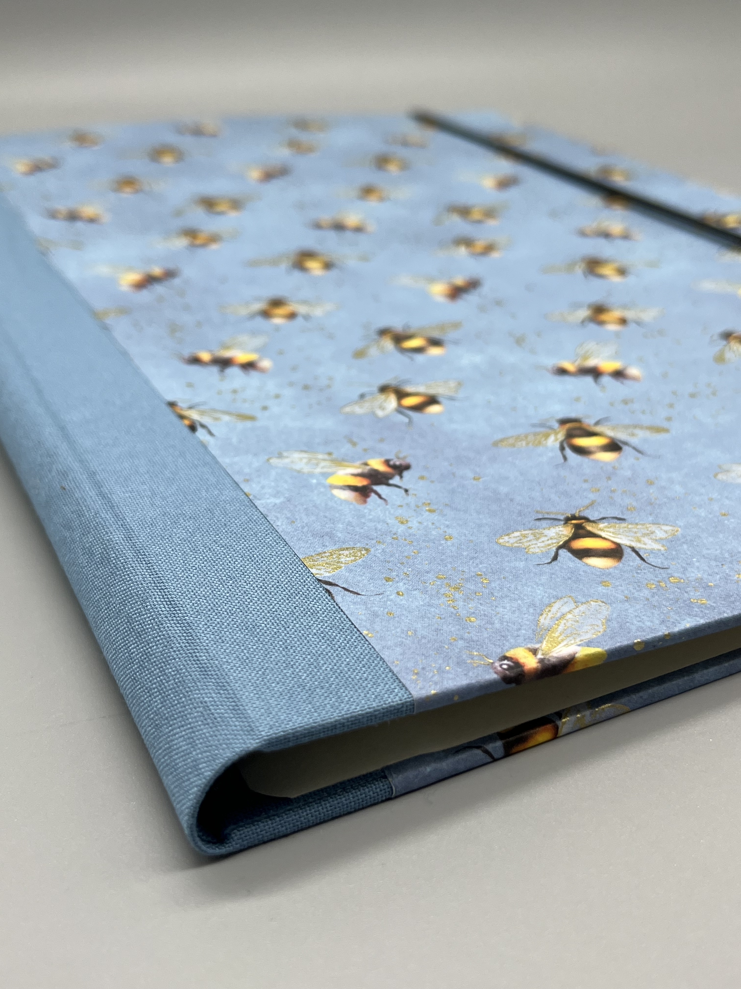 Gefertigt ist die Klemm-Mappe A4 Bienen mit dem gleichnamigen Geschenkpapier aus unserem Sortiment. Innen sind die Deckel der Mappe mit hochwertigem Vorsatzpapier kaschiert. Den Buchrücken habe ich aus blauem Buchbinderleinen gefertigt. Passend zum Bienenthema hält ein schwarzes Gummiband die Mappe geschlossen, das ich mit gelben Nieten befestigt habe.
