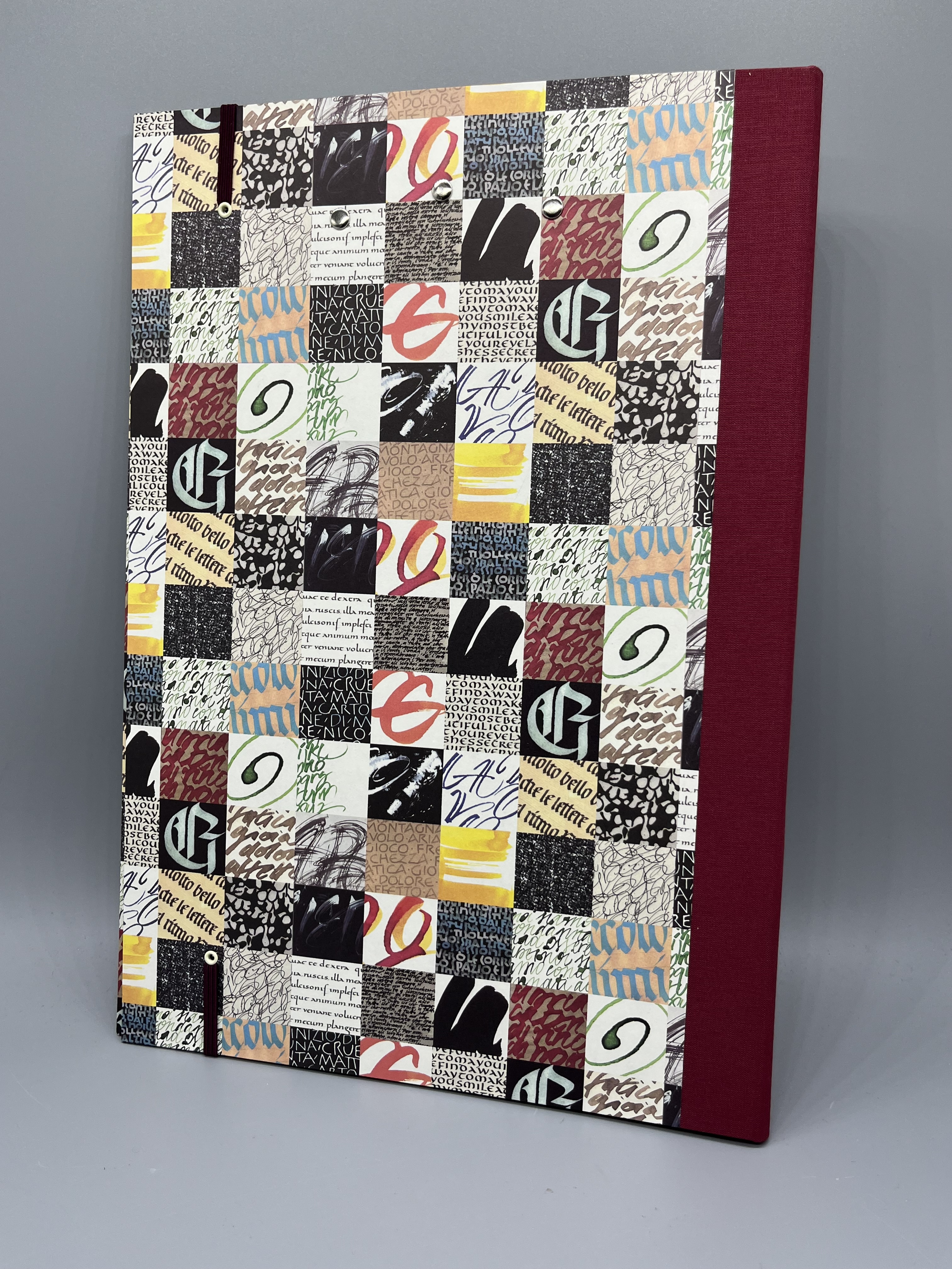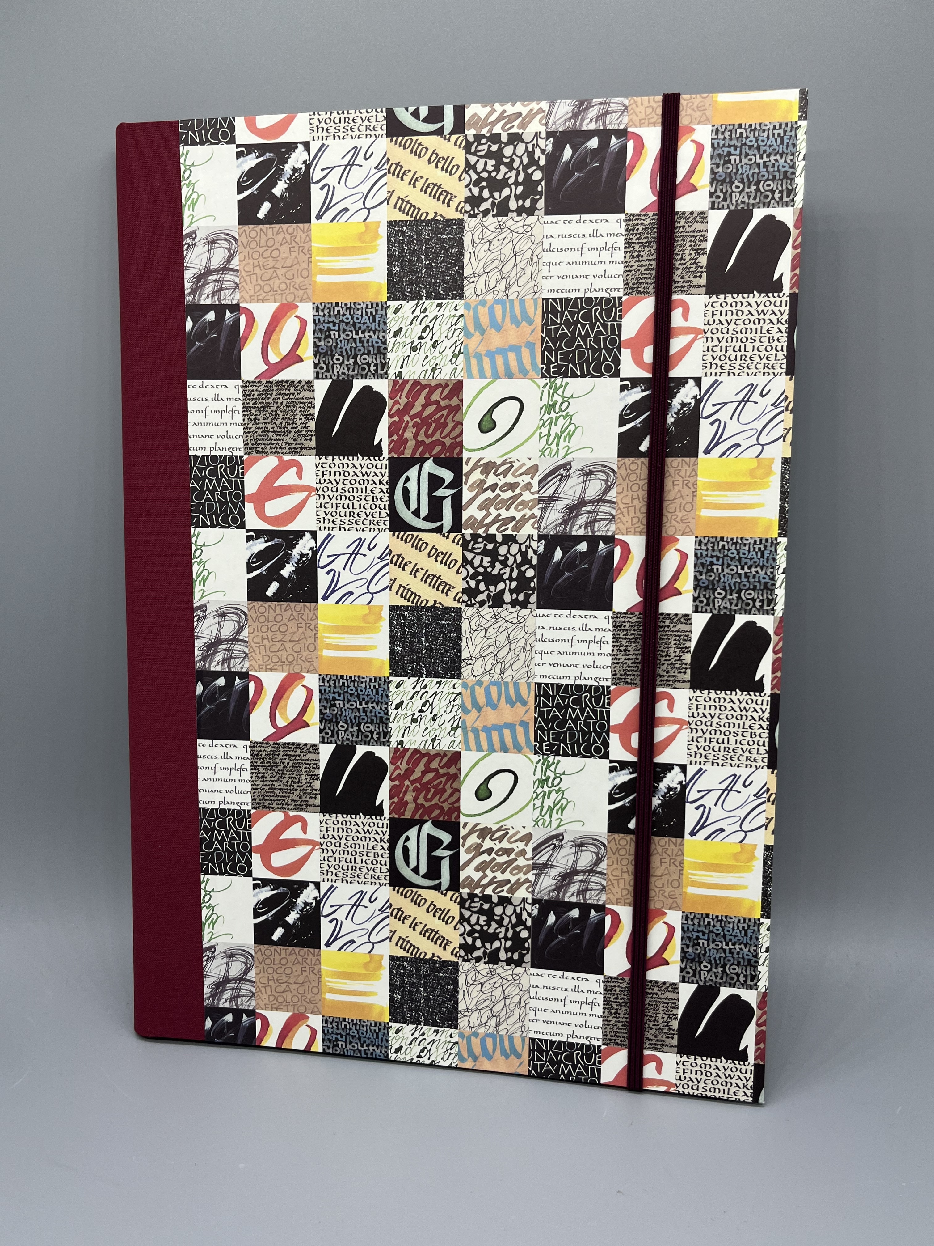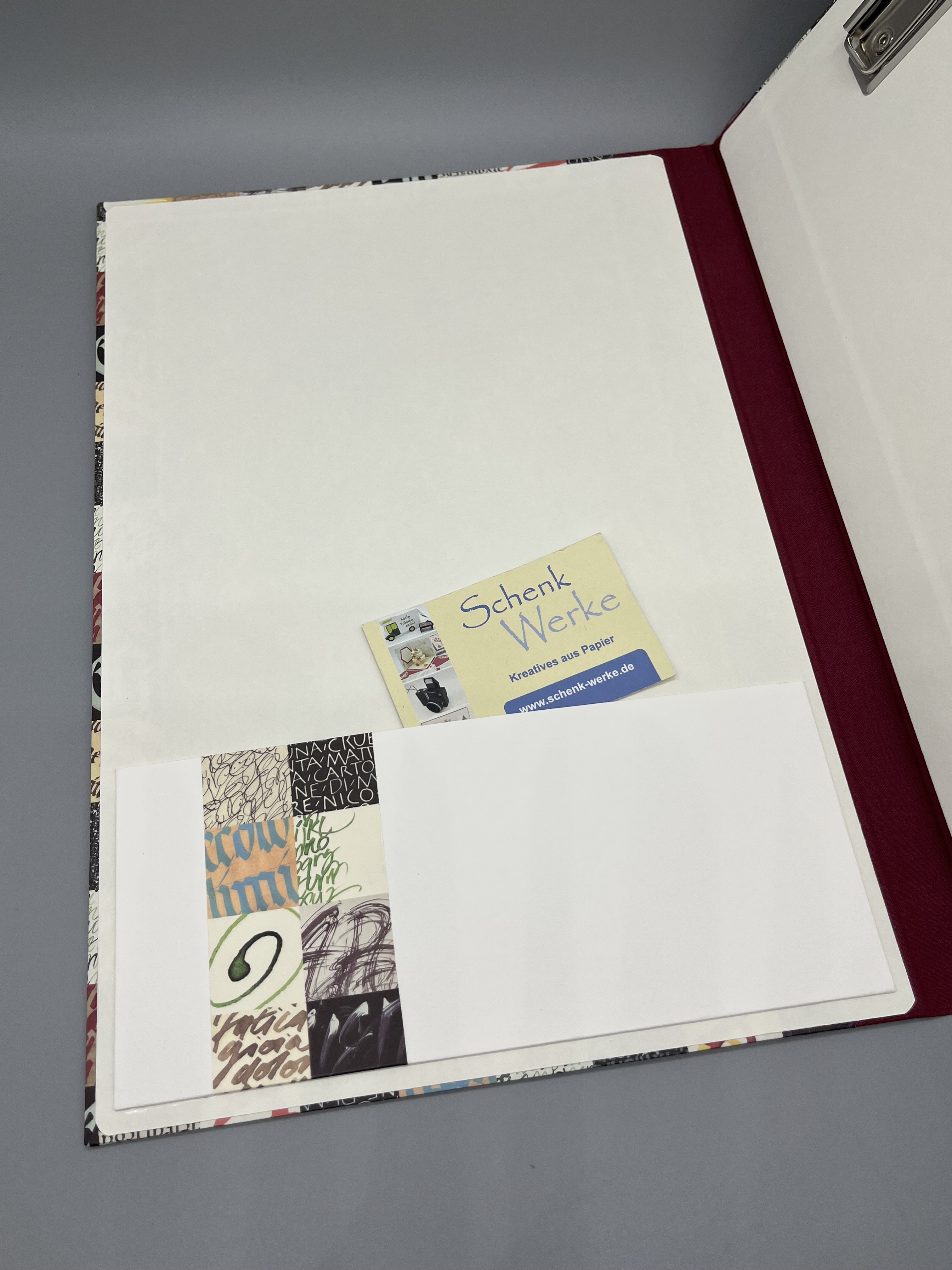 Gefertigt ist die Klemm-Mappe A4 Kalligrafie mit dem gleichnamigen Geschenkpapier aus unserem Sortiment. Innen sind die Deckel der Mappe mit hochwertigem Vorsatzpapier kaschiert. Den Buchrücken habe ich aus dunkelrotem Buchbinderleinen gefertigt. Ein rotes Gummiband hält die Mappe geschlossen.