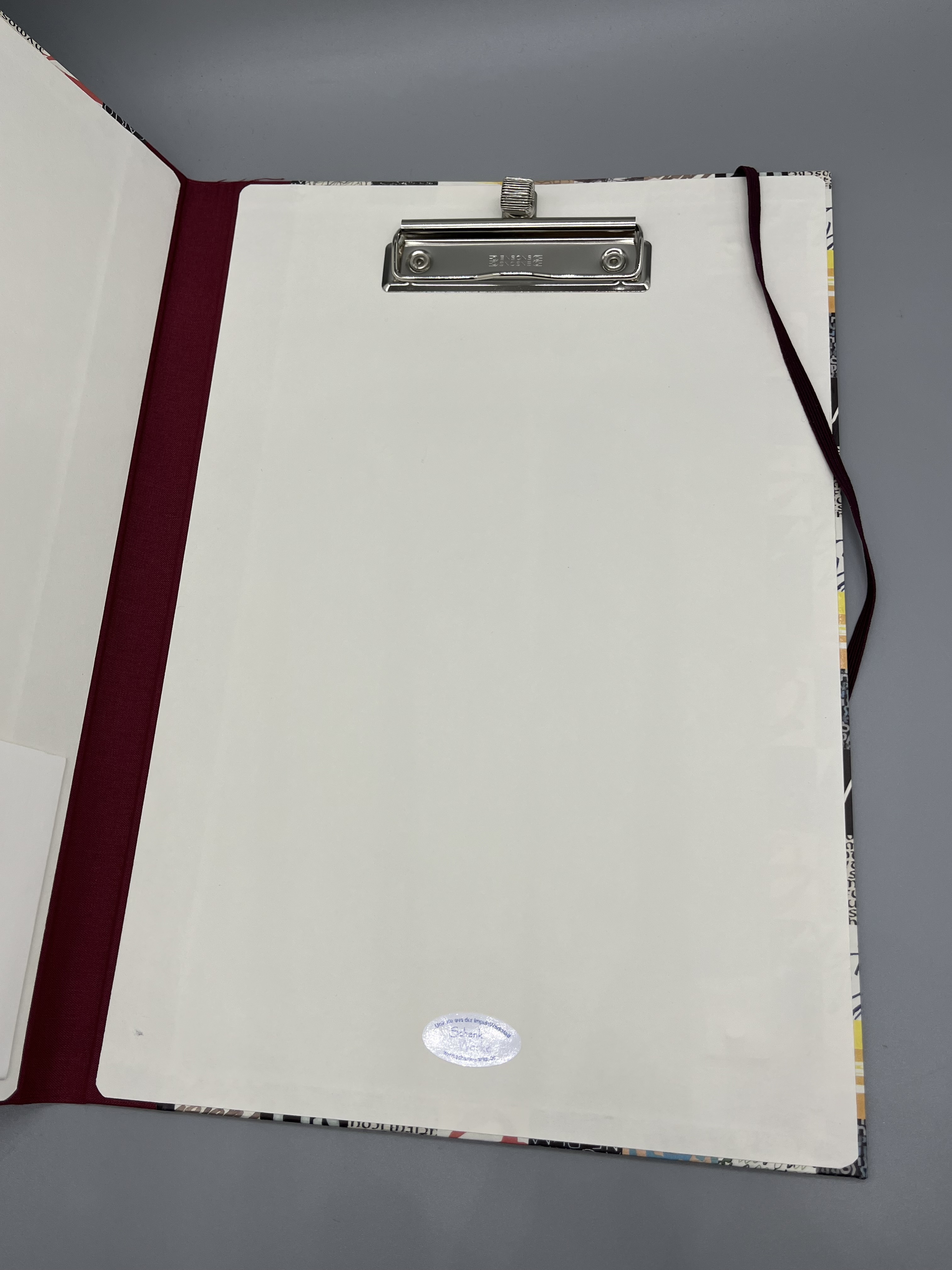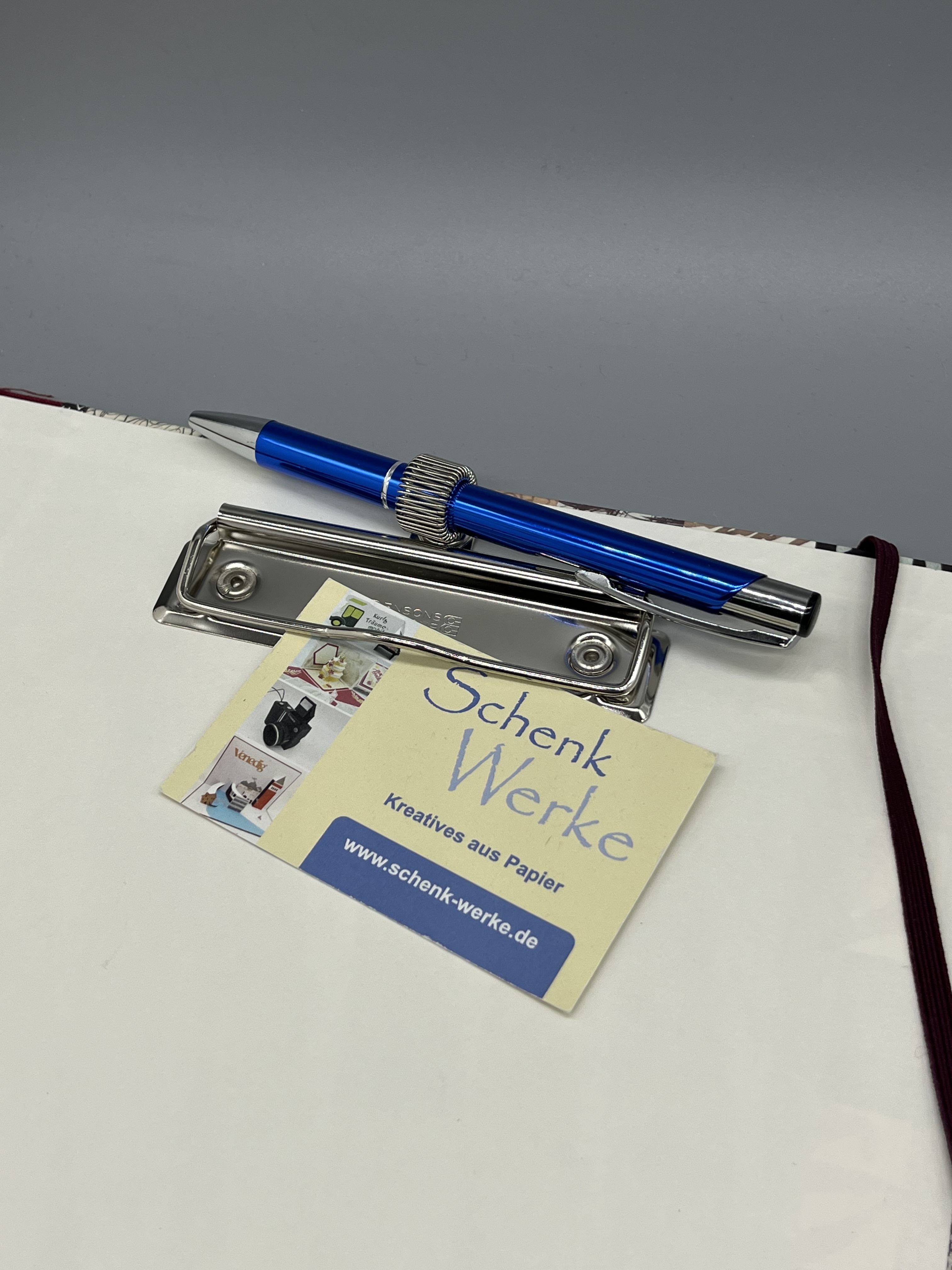 Diese handgebundene Mappe mit Klemmvorrichtung und Stifthalter kannst Du vielfältig nutzen: Fasse lose Blätter darin zusammen oder gebrauche sie als Skizzen- oder Studienblock, Handlettering-Workbook, Lose-Blatt-Sammlung usw. Die stabile Klemme aus Metall hält so einiges für Dich fest. Ein zusätzlich darüber angebrachter Stifthalter passt außerdem auf ein Schreibgerät Deiner Wahl auf, damit wichtige Anmerkungen immer gleich notiert werden können. Im vorderen Deckel nimmt ein Steckfach zusätzlich lose Blätter auf.Das Gesamtformat von etwa 34 x 23 cm bietet Papier bis zum Format DIN A4 Platz. Du kannst sie hochkant oder quer nutzen und beispielsweise beim Zeichnen den Deckel auch ganz umschlagen.