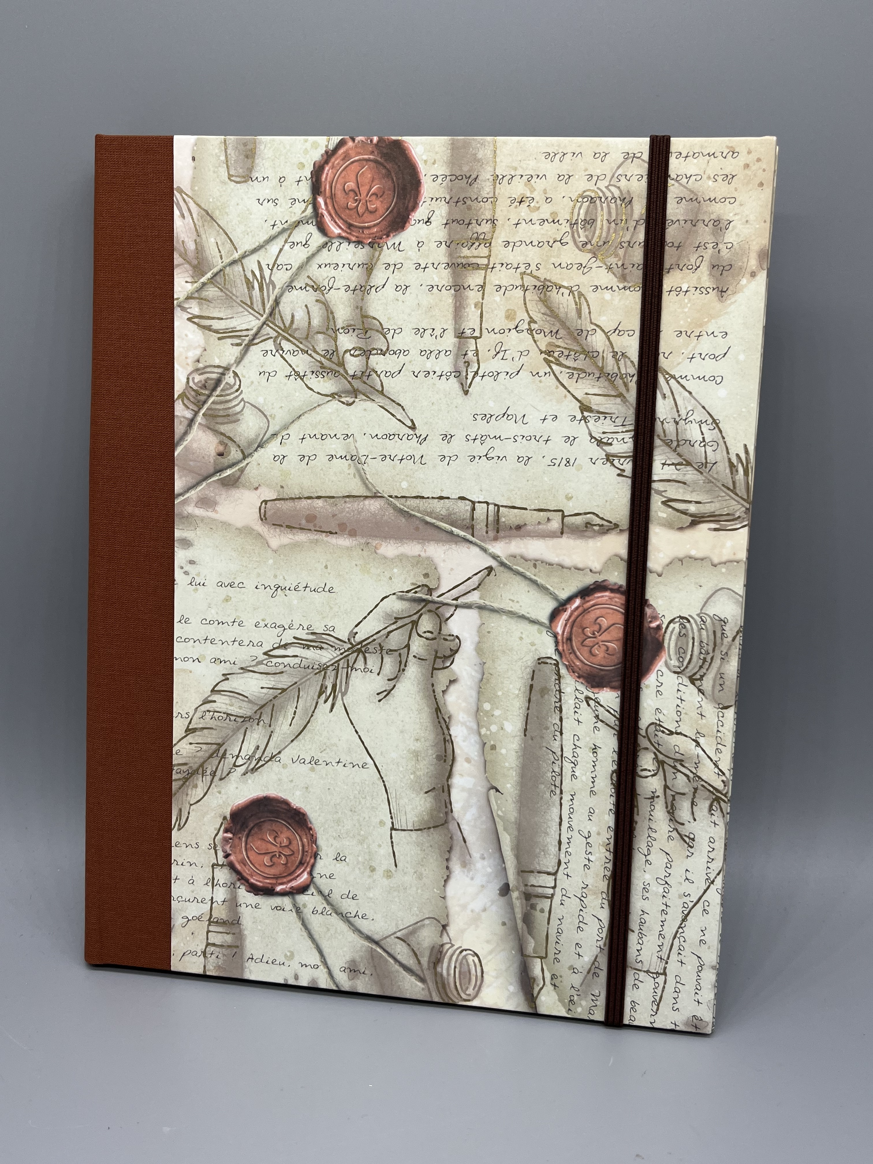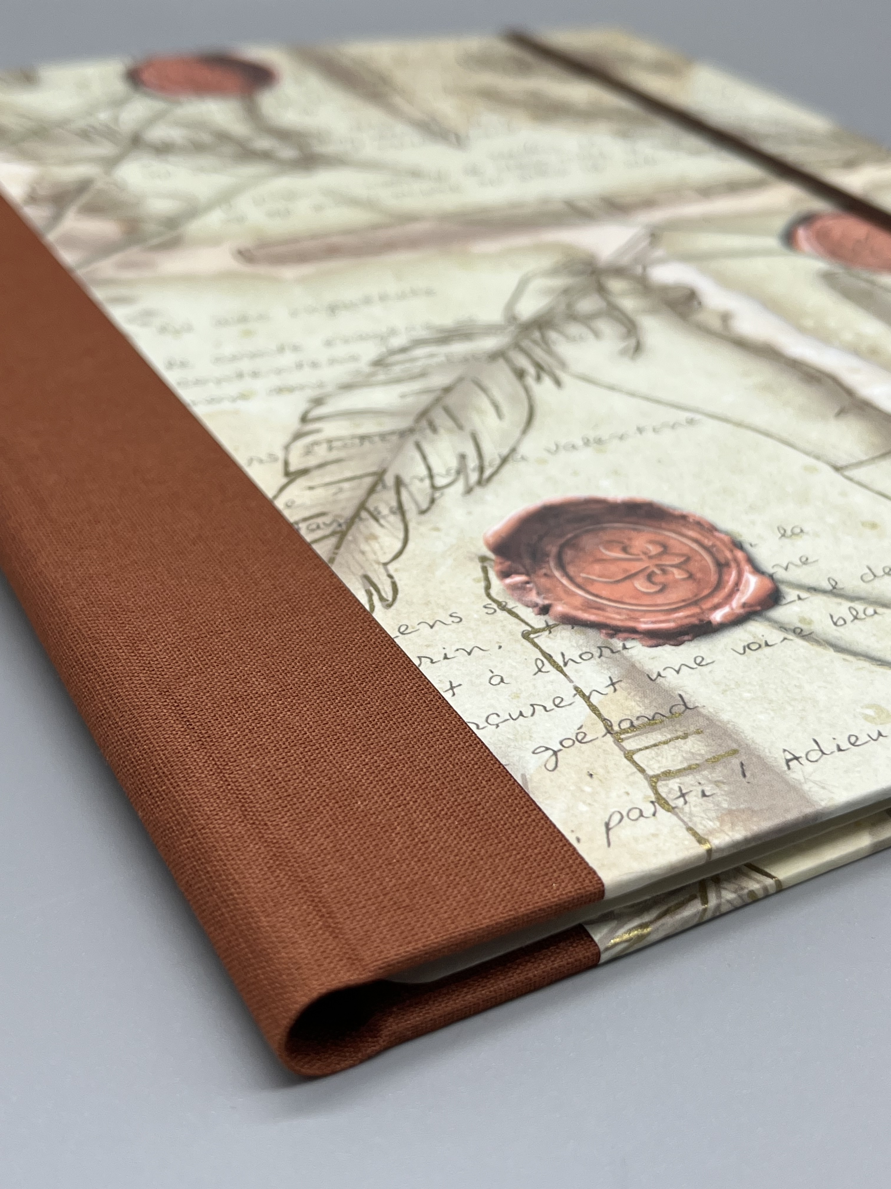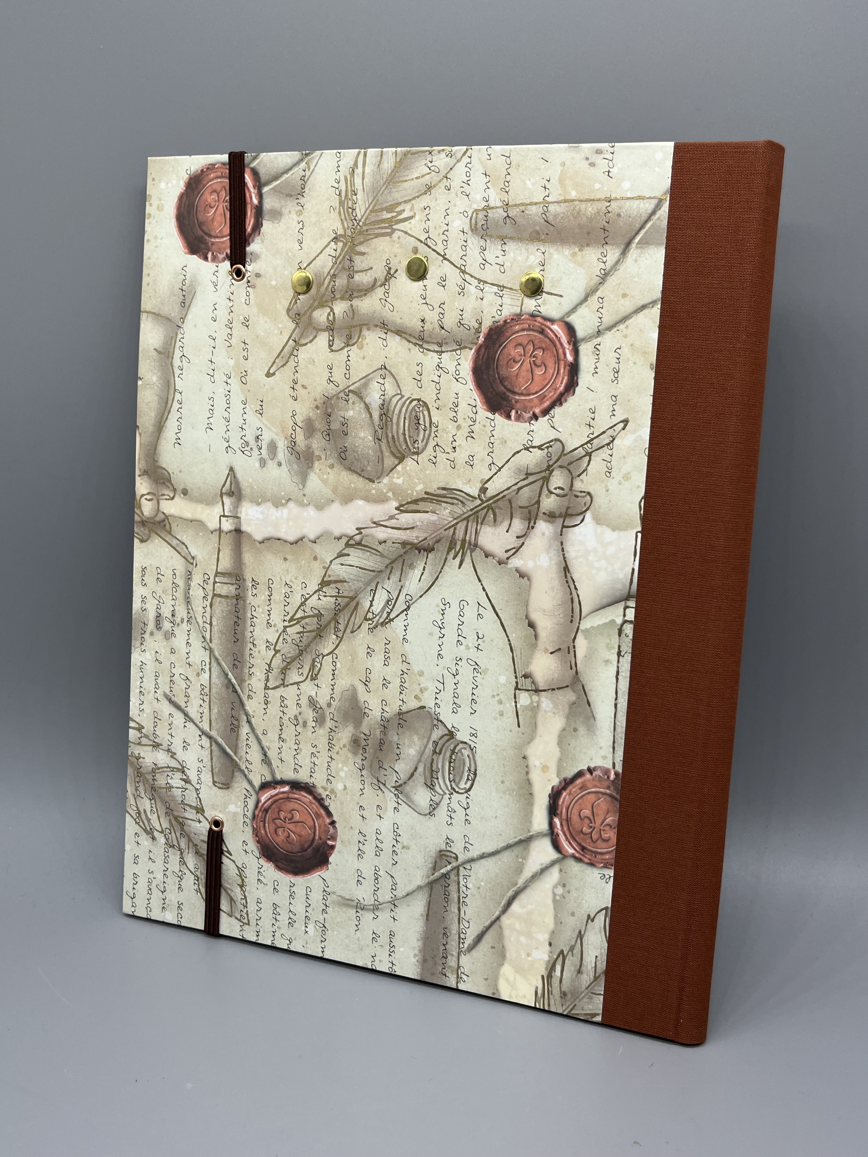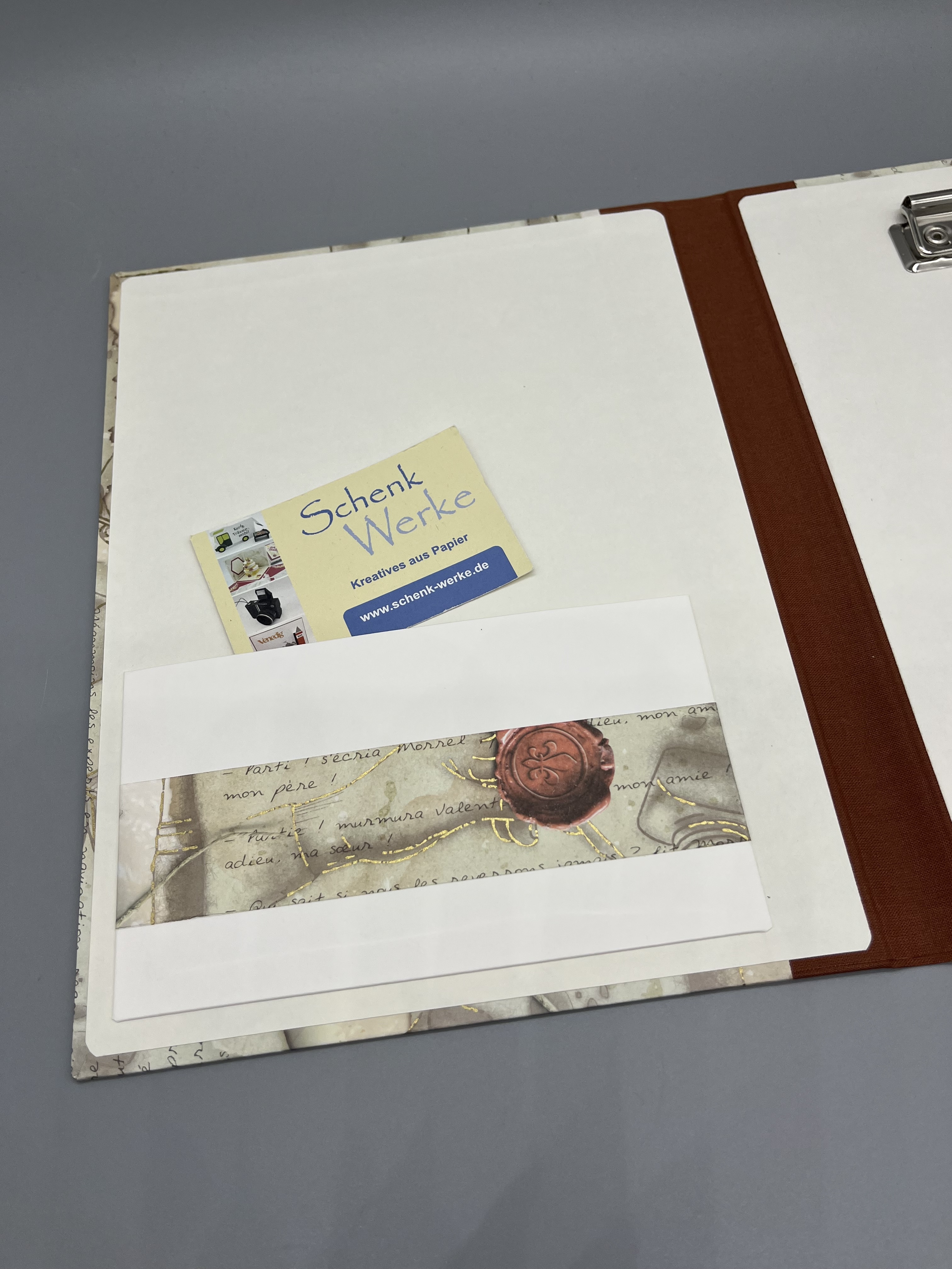 Gefertigt ist die Klemm-Mappe mit einem italienischen Geschenkpapier mit teilweisem Golddruck. Zu sehen sind Wachssiegel und gezeichnete Hände, die mit Tuschfedern schreiben. Innen sind die stabilen Deckel der Mappe mit cremeweißem Vorsatzpapier kaschiert. Für den Buchrücken habe ich dunkelgraues Buchbinderleinen genutzt.