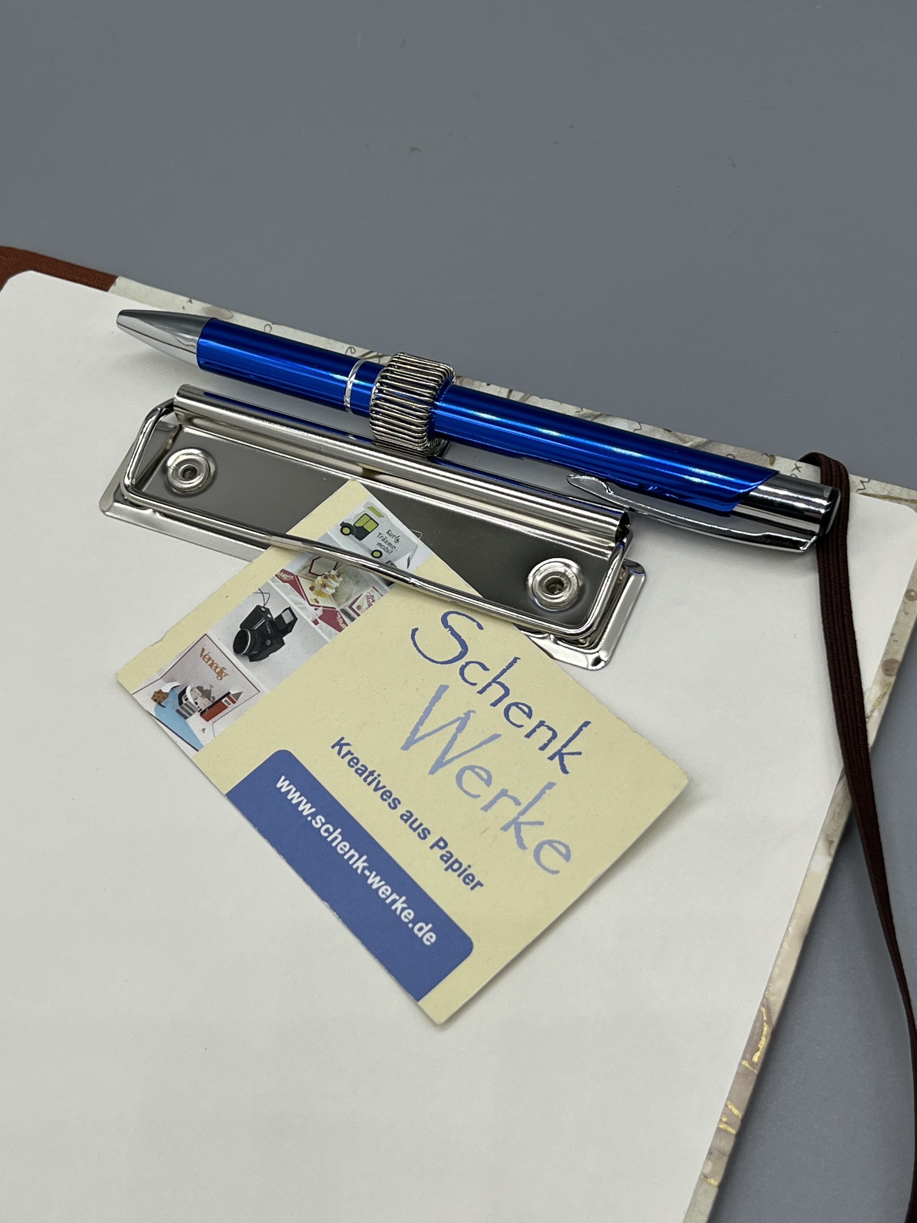Die Klemme ist 10 cm breit. Der Stifthalter sitzt darüber, sodass ein Stift oben quer in die Mappe eingesteckt werden kann.
