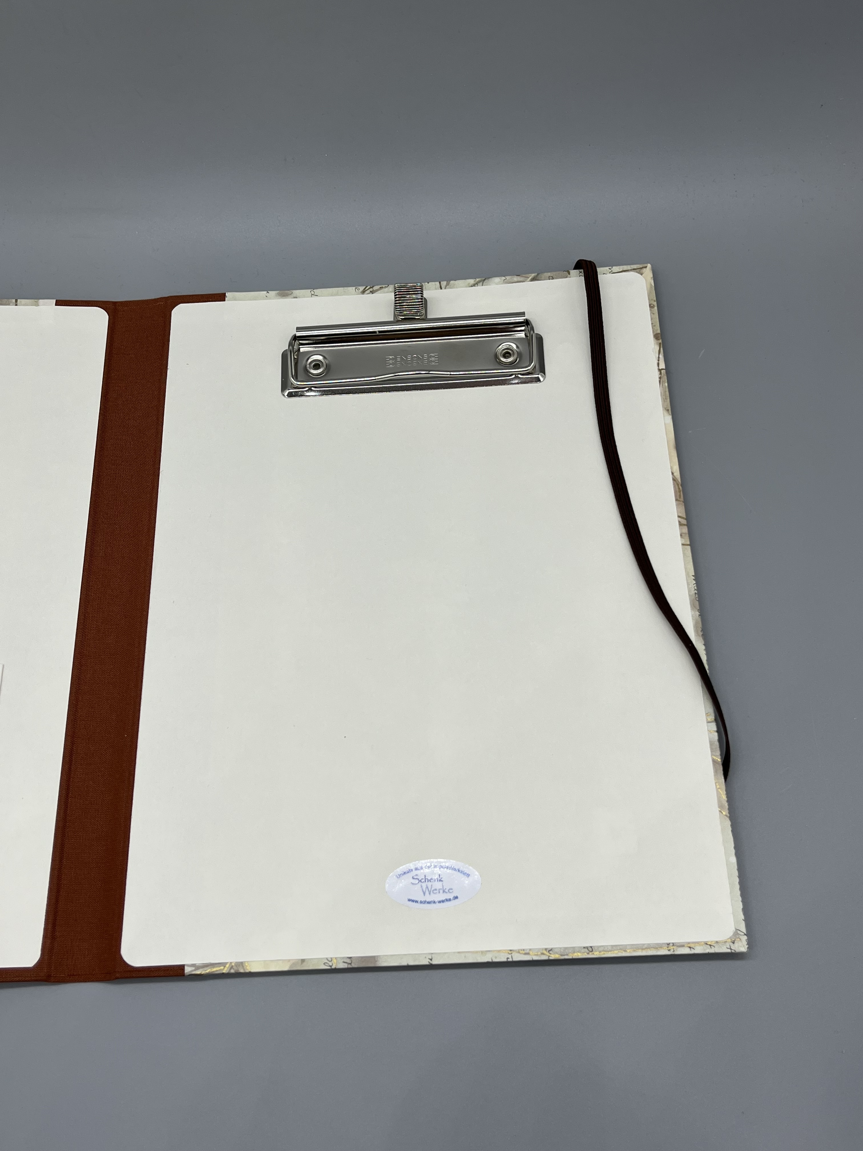 Diese handgebundene Mappe mit Klemmvorrichtung und Stifthalter kannst Du vielfältig nutzen: Fasse lose Papierbögen darin zusammen oder gebrauche sie als Skizzen- oder Studienblock, Handlettering-Workbook, Lose-Blatt-Sammlung usw. Die stabile Klemme aus Metall hält so einiges für Dich fest. Einen Stift für spontane Einträge kannst Du in den Halter einstecken. Im vorderen Deckel nimmt ein Steckfach zusätzlich lose Blätter auf.Das Gesamtformat von etwa 19 x 25,5 cm bietet Papier bis zum Format DIN A5 Platz. Du kannst die Mappe hochkant oder quer nutzen und beispielsweise beim Zeichnen den Deckel auch ganz umschlagen.