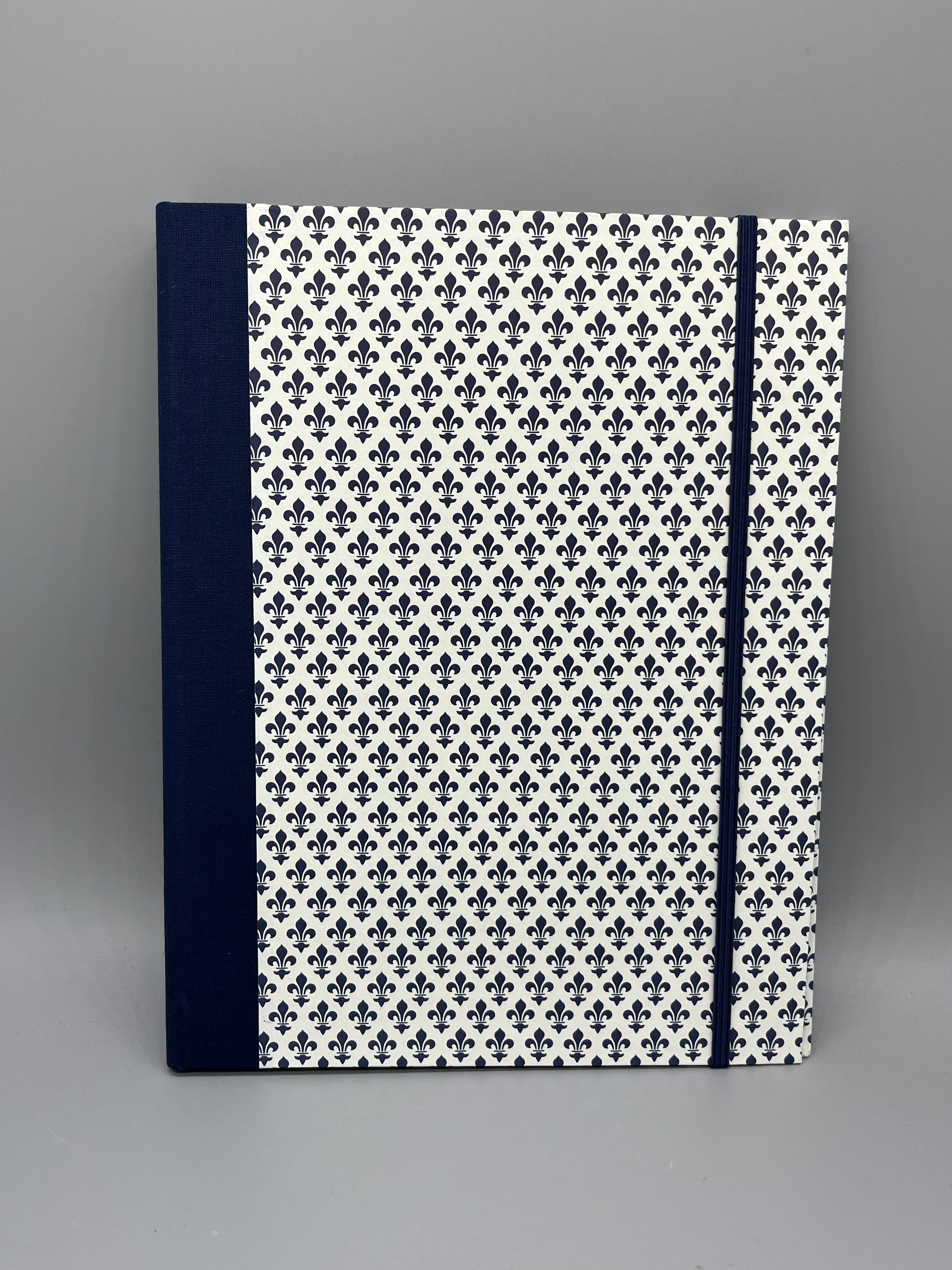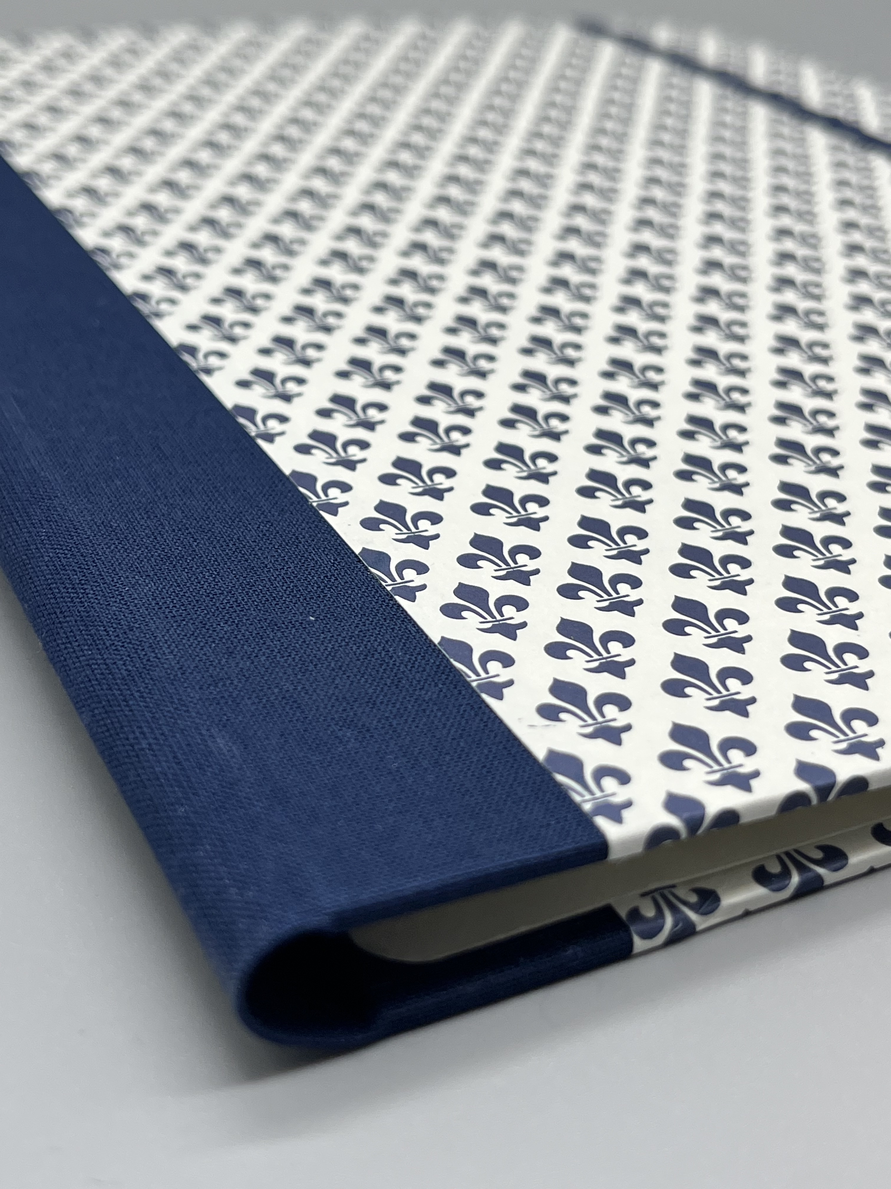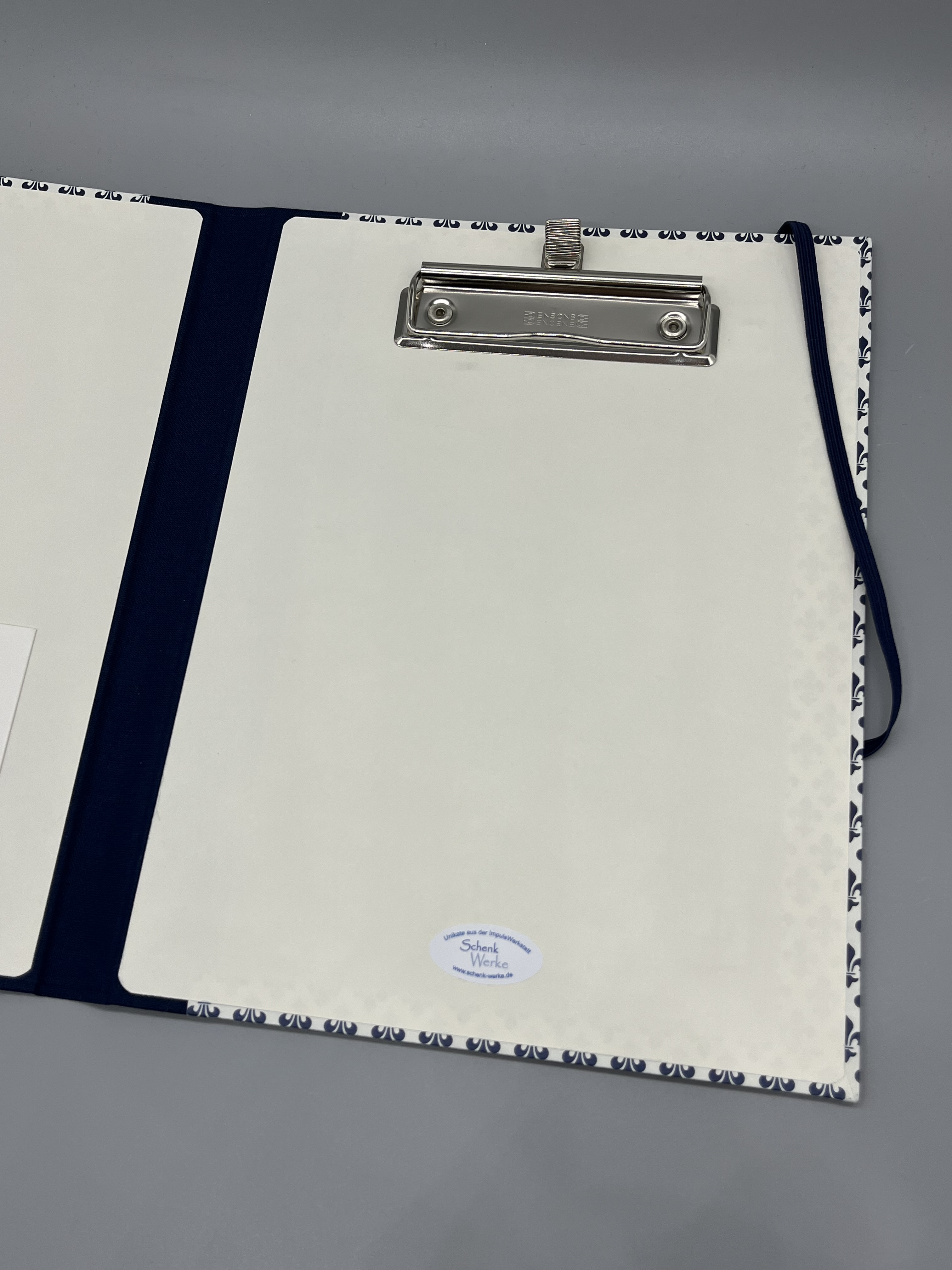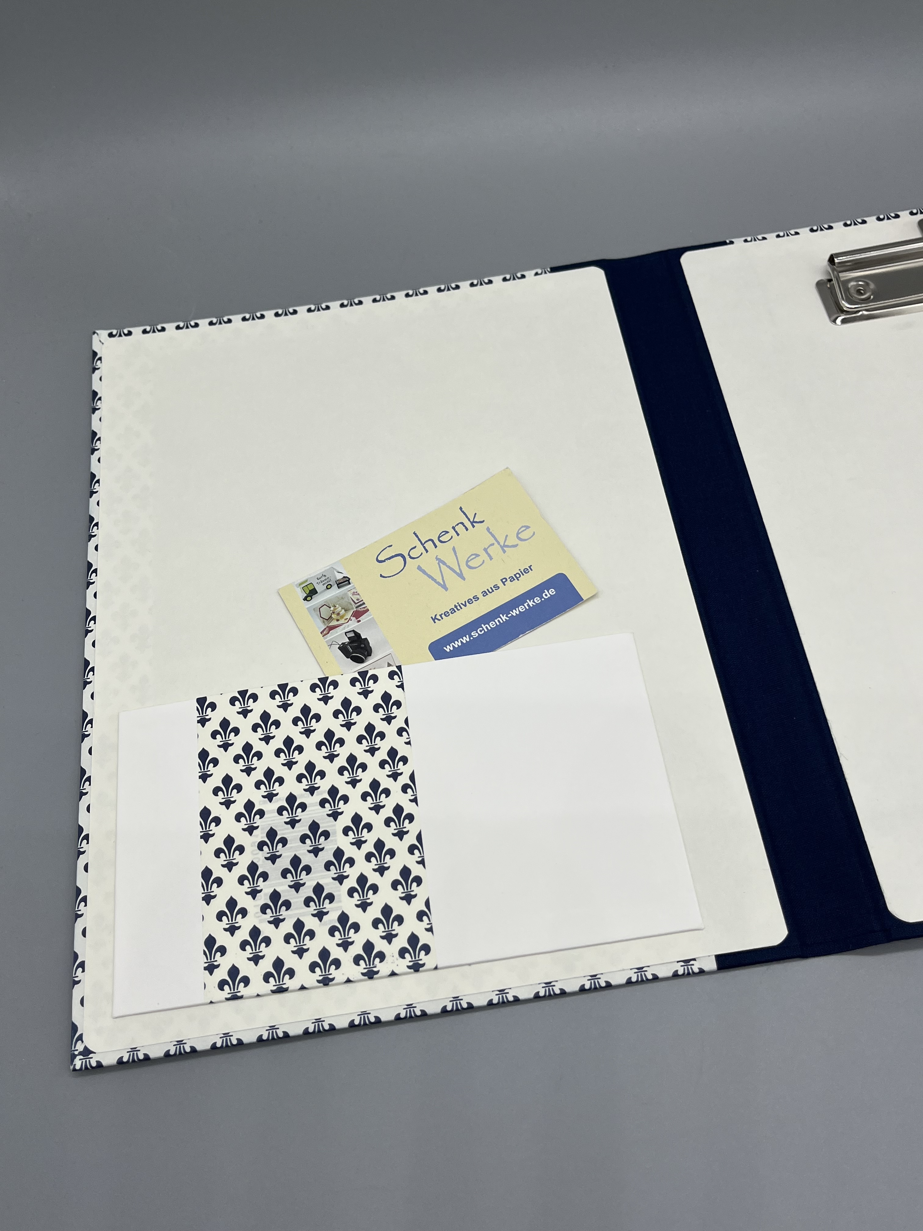 Gefertigt ist die Klemm-Mappe mit einem Carta Varese-Geschenkpapier mit blauen, stilisierten Lilien. Innen sind die stabilen Deckel der Mappe mit cremeweißem Vorsatzpapier kaschiert. Für den Buchrücken habe ich dunkelblaues Buchbinderleinen genutzt.