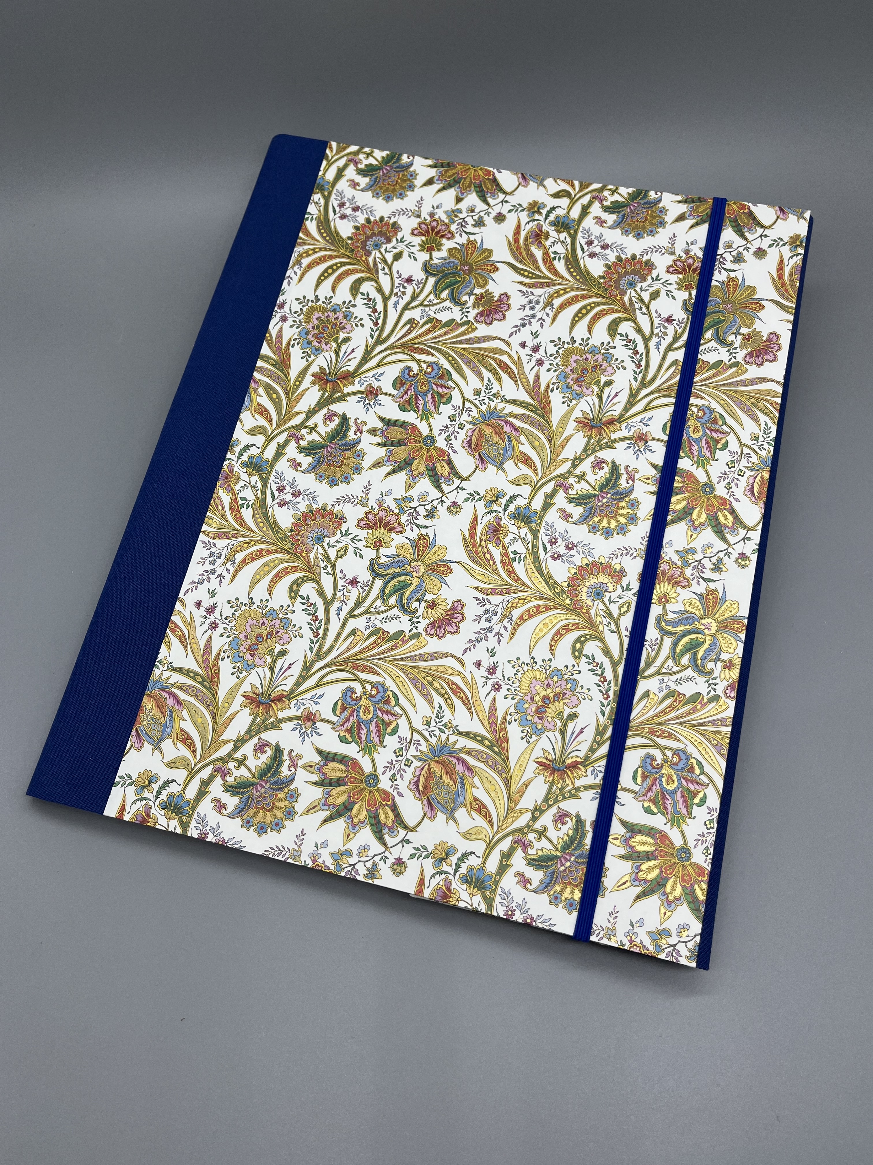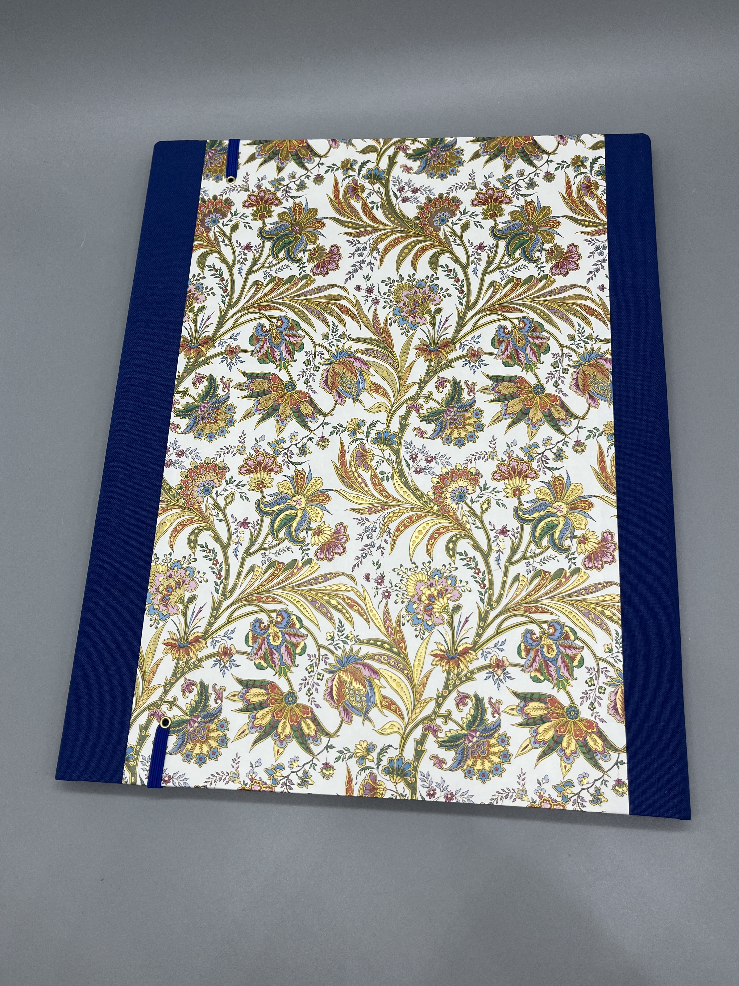 Ein Klassiker in moderner Variante kleidet diese Mappe ein. Bunte Ranken und Blüten in stilisierter Form, teilweise mit dezentem Golddruck, sind auf dem italienischen Bezugspapier zu sehen.