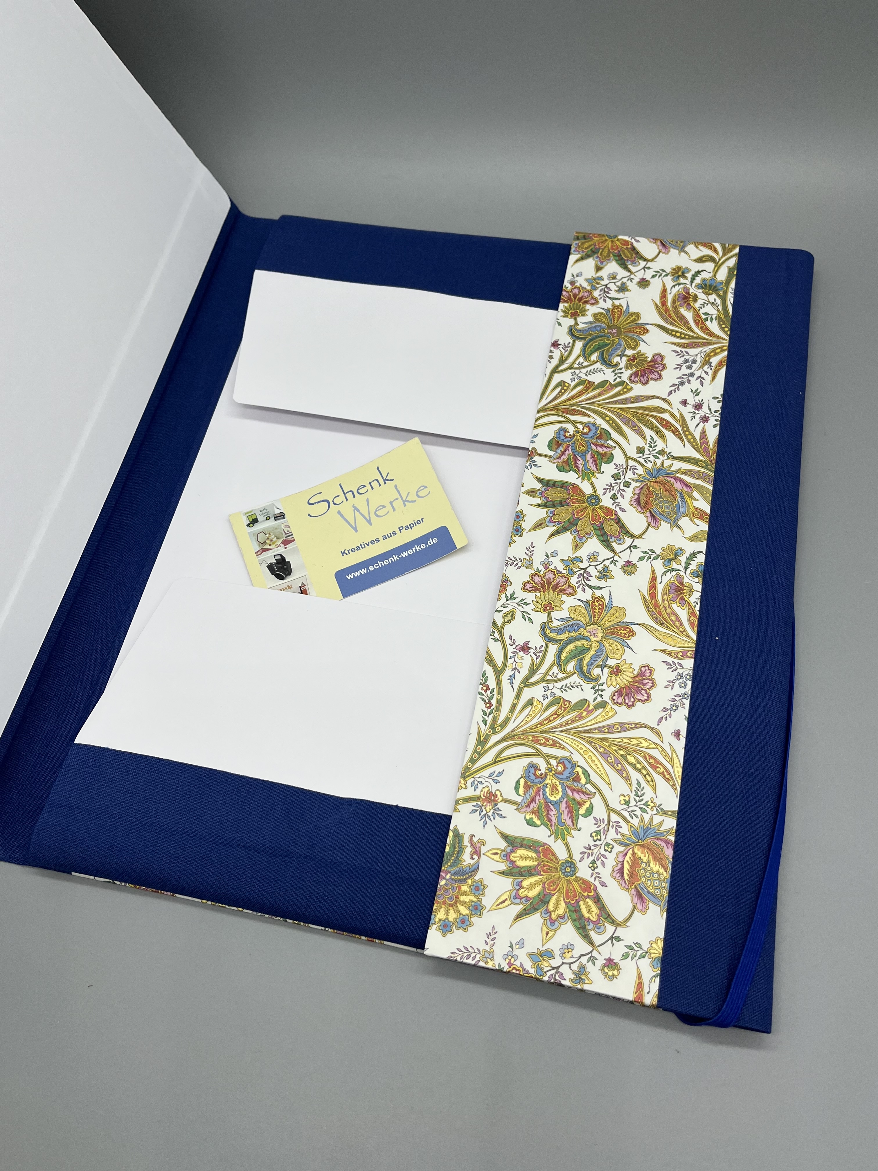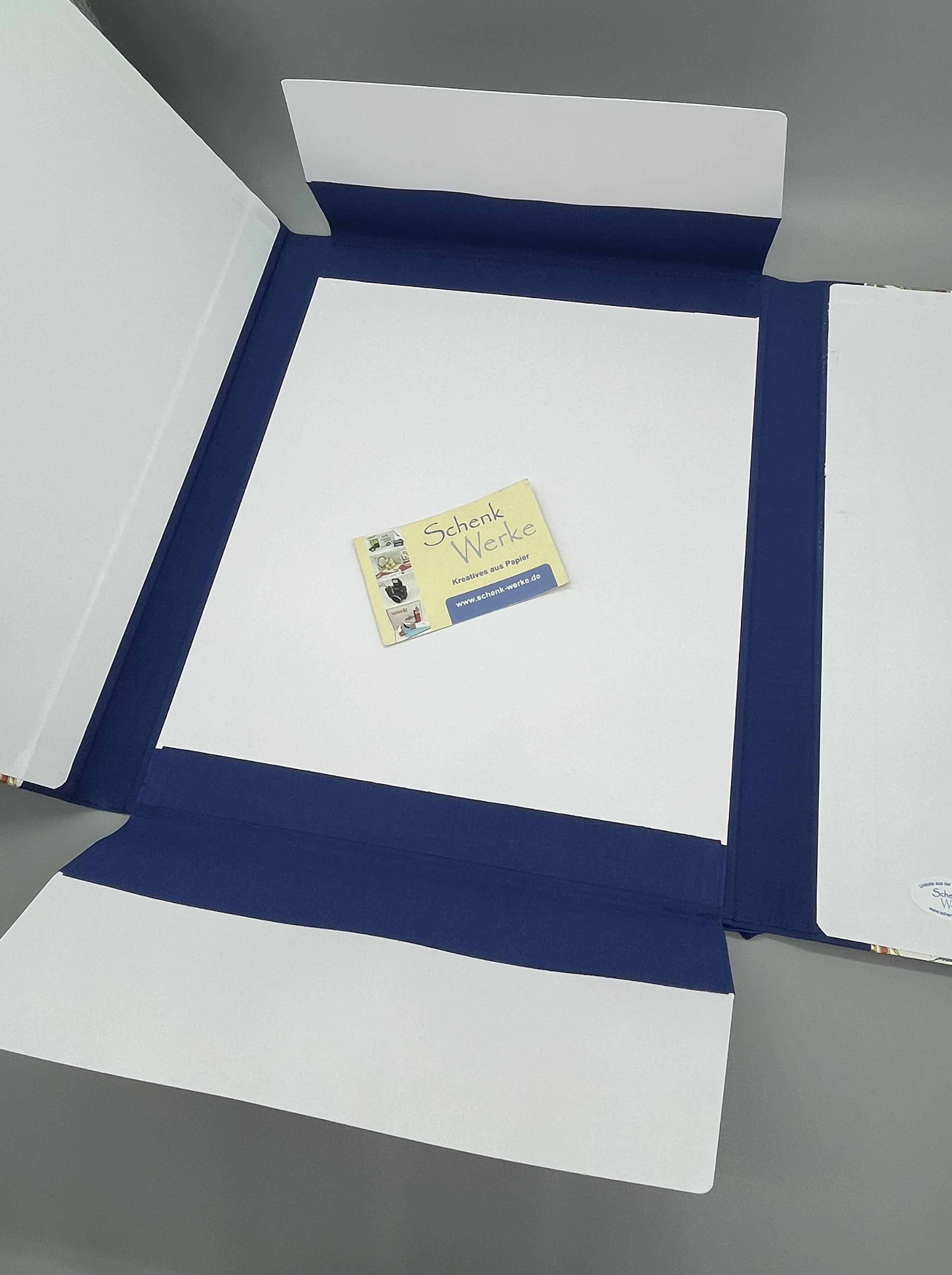 Die Gelenkverbindungen der Klappen und Deckel habe ich aus blauem Buchleinen gearbeitet, das farblich gut zum Bezugspapier passt und die Mappe sehr edel wirken lässt.