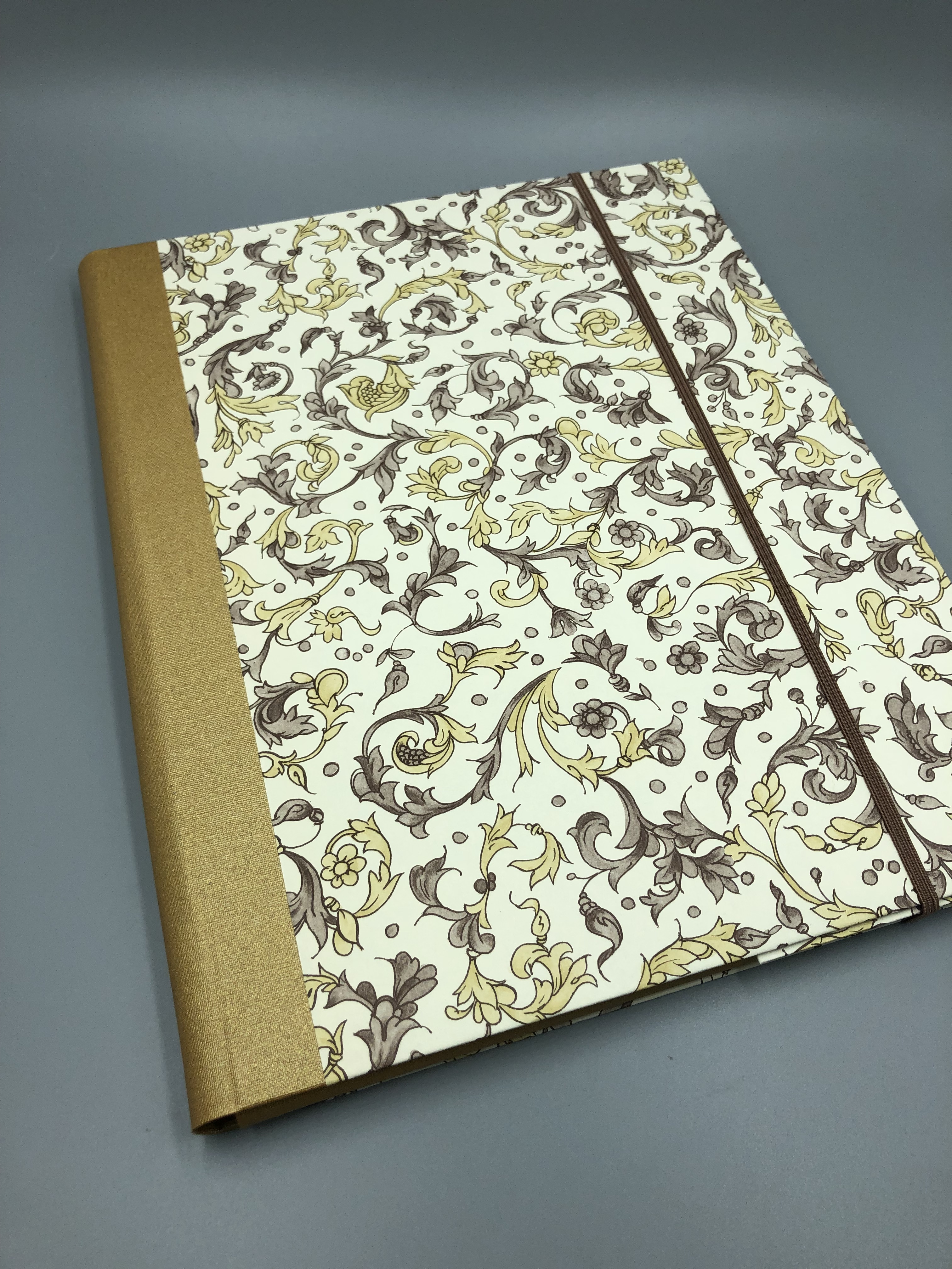 Alle Gelenkverbindungen der Klappen und Deckel habe ich aus goldfarbenem Buchleinen gearbeitet, das farblich zum Bezugspapier passt.