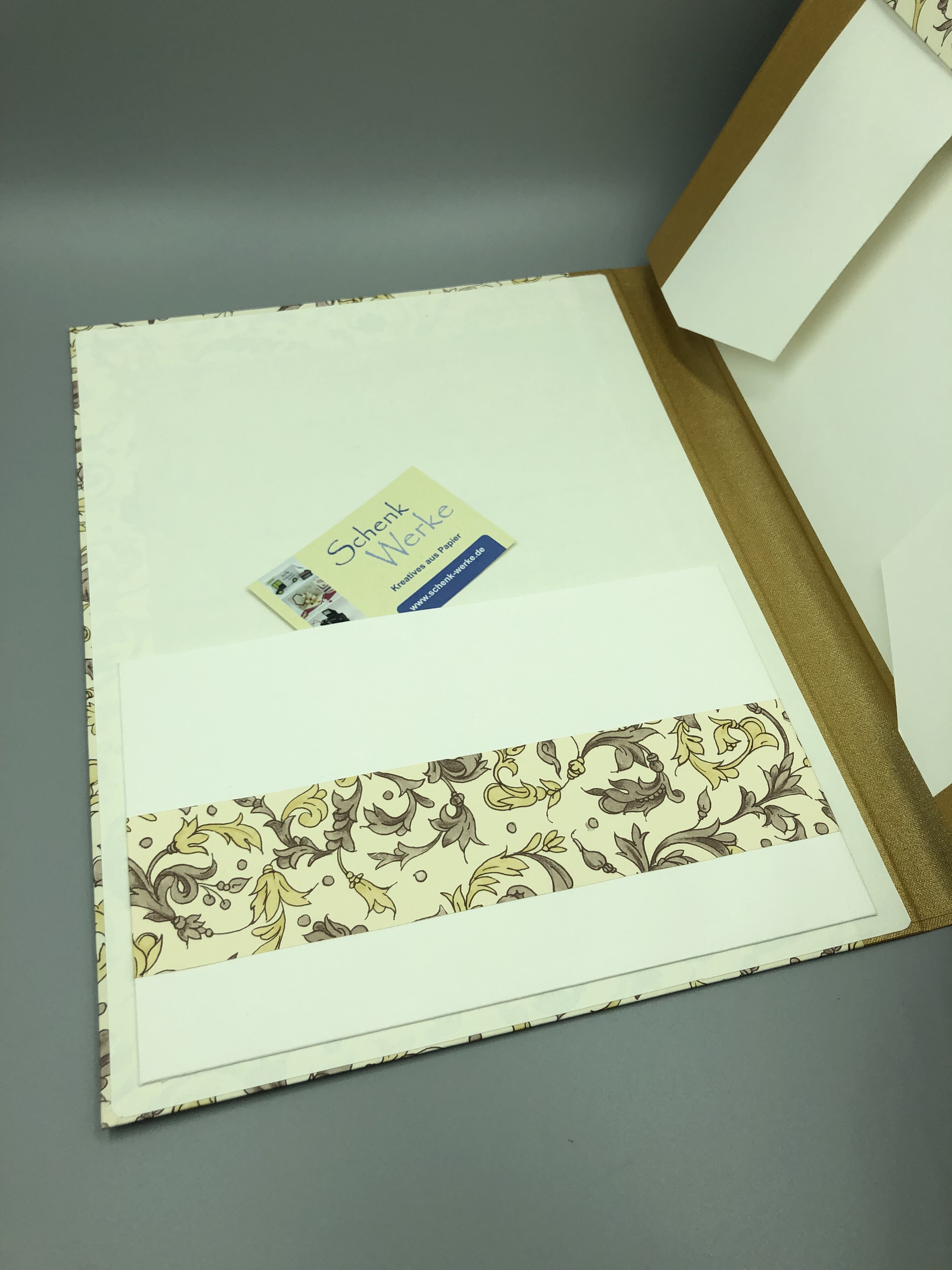 Diese handgebundene Mappe ist vielfältig nutzbar. Das Gesamtformat von etwa 31,5 x 25 x 2,5 cm bietet Papier bis zum Format DIN A4 viel Platz. Im Deckel ist ein Steckfach, das ebenfalls einzelne Bögen aufnehmen kann. Gefertigt habe ich die Mappe mit einem hochwertigen italienischen Geschenkpapier in Beige und Braun. Weiterhin kamen Graupappe und hochwertiger Fotokarton zum Einsatz.