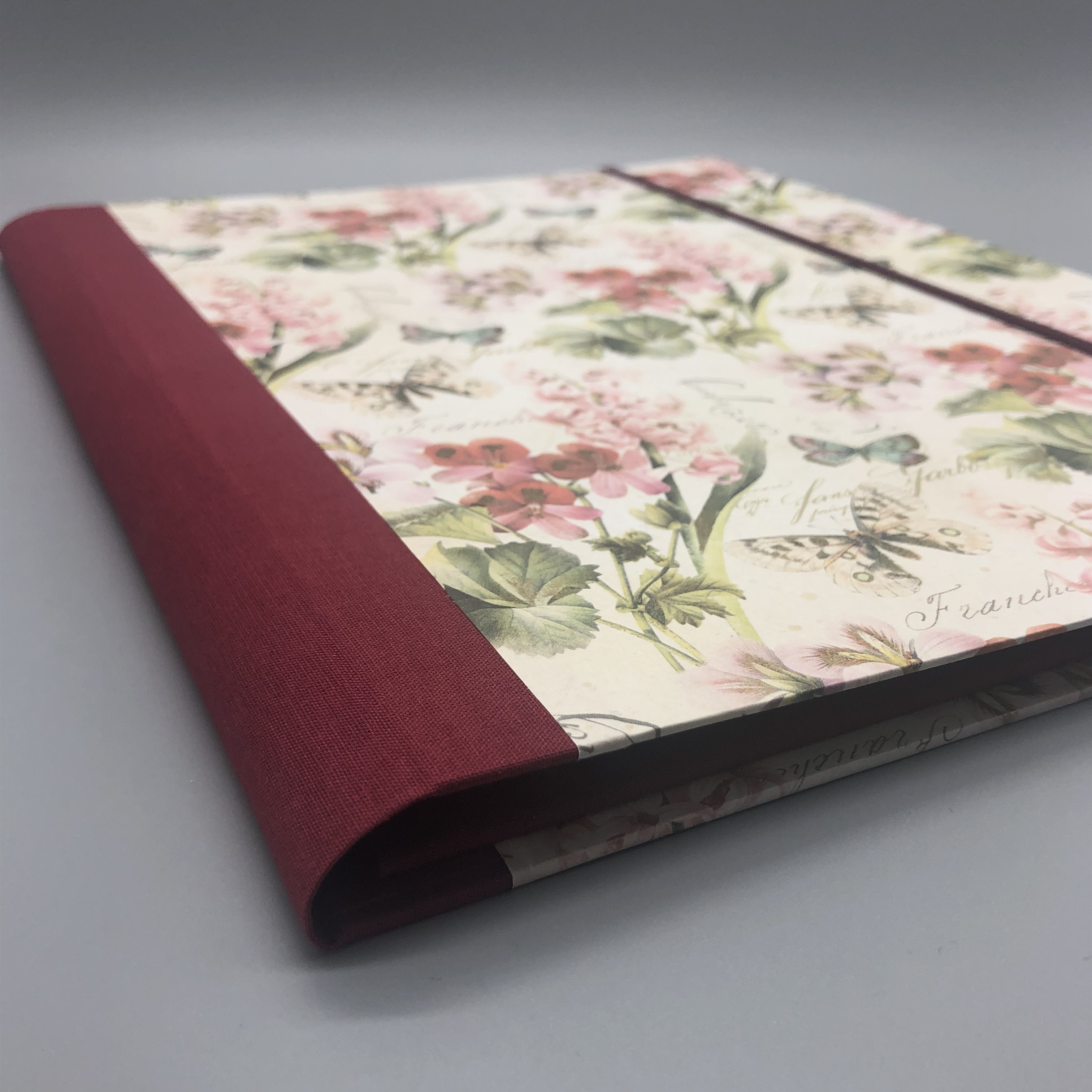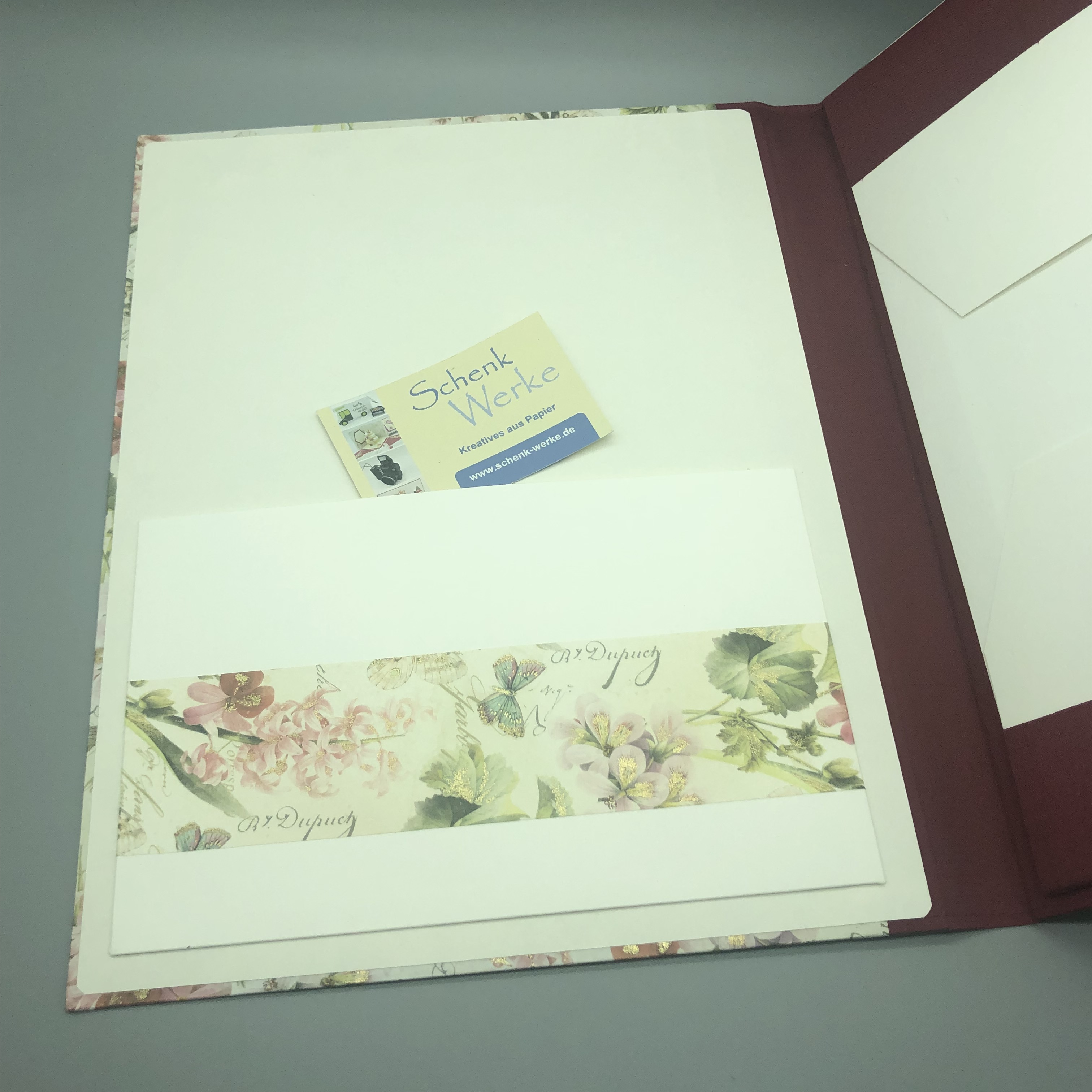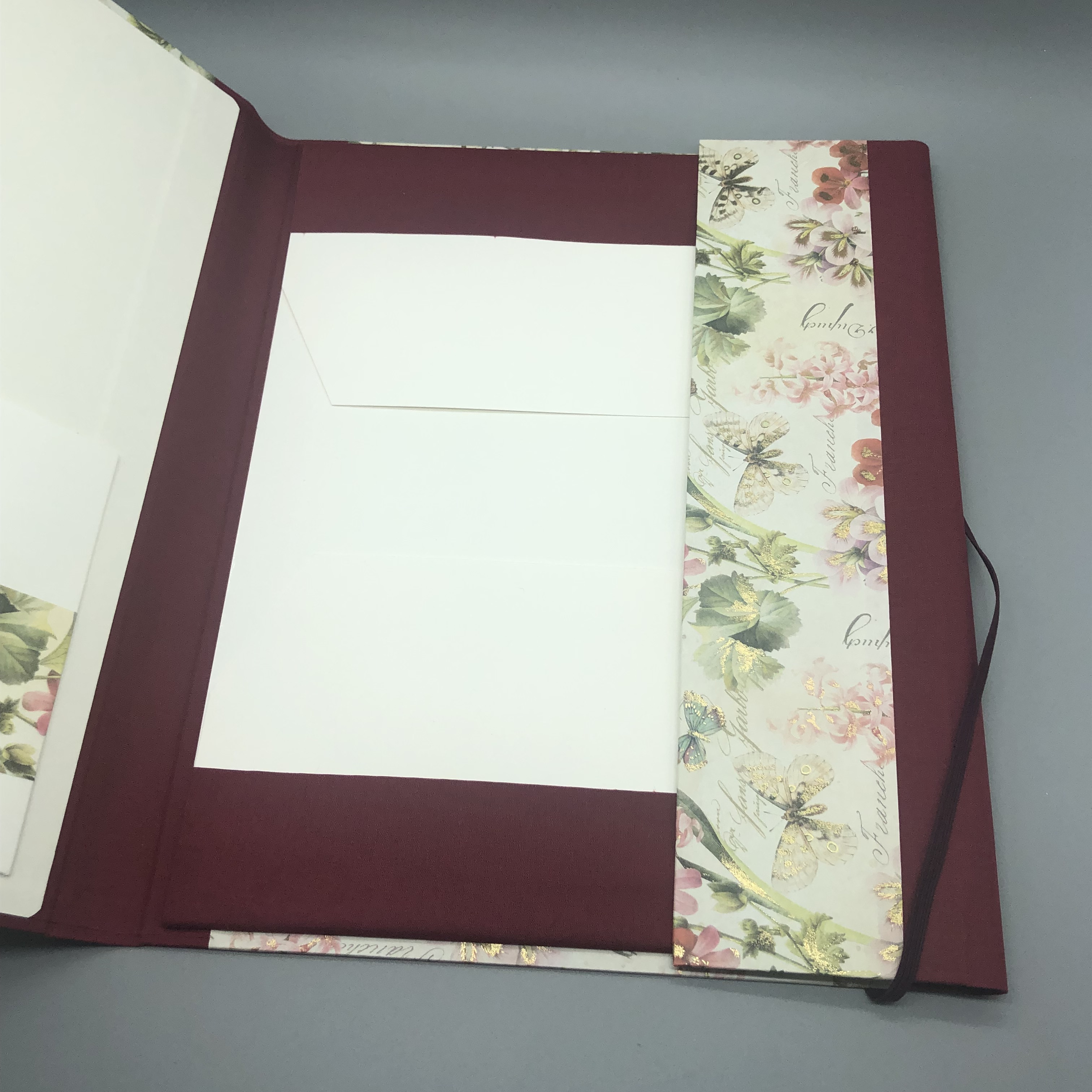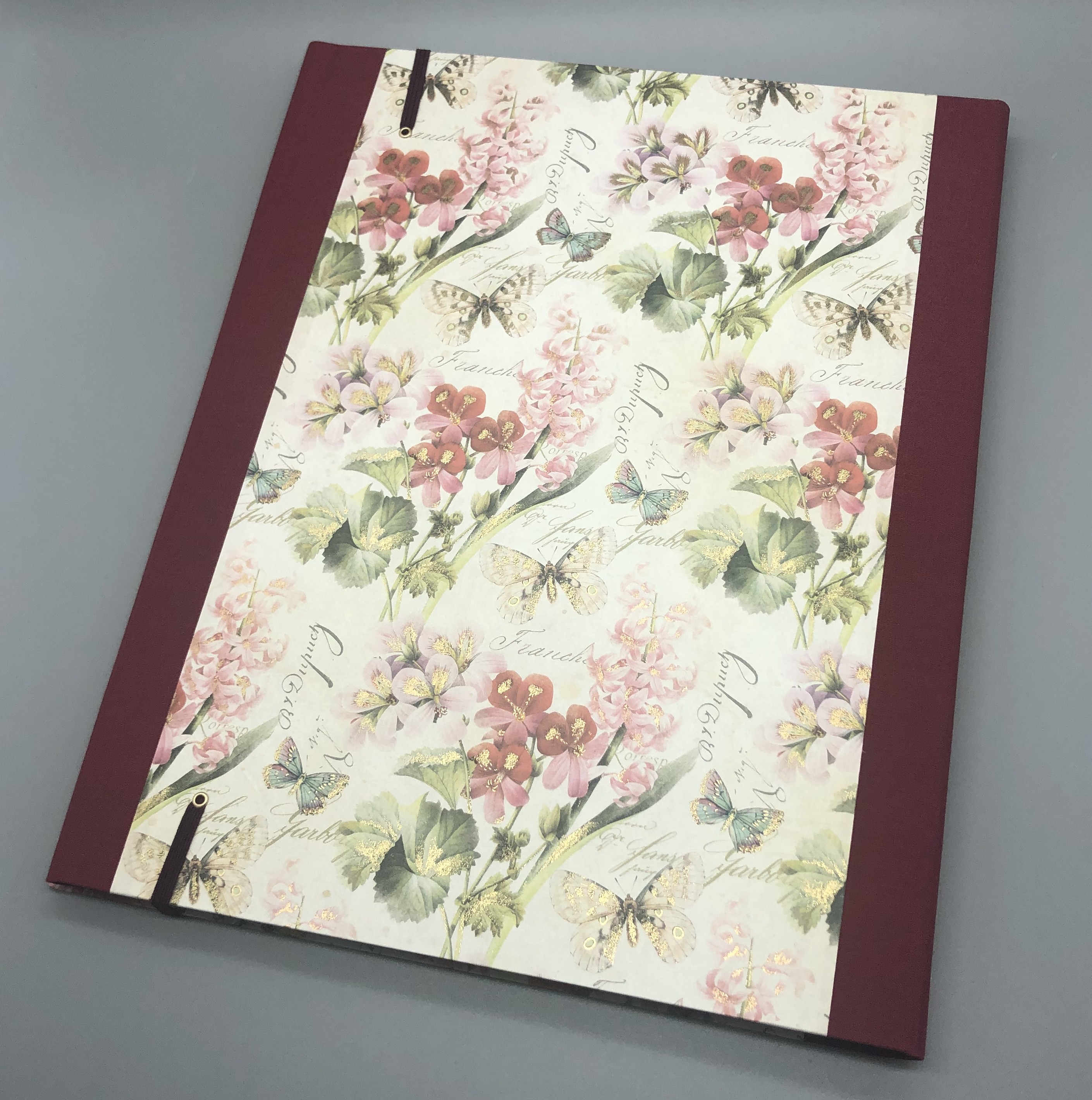 Diese handgebundene Mappe ist vielfältig nutzbar. Das Gesamtformat von etwa 31,5 x 25 x 2,5 cm bietet Papier bis zum Format DIN A4 viel Platz. Im Deckel ist ein Steckfach, das ebenfalls einzelne Bögen aufnehmen kann. Ich fertige die Mappe mit einem hochwertigen italienischen Geschenkpapier mit dezentem Golddruck. Weiterhin kommen Graupappe und hochwertiger Fotokarton zum Einsatz.