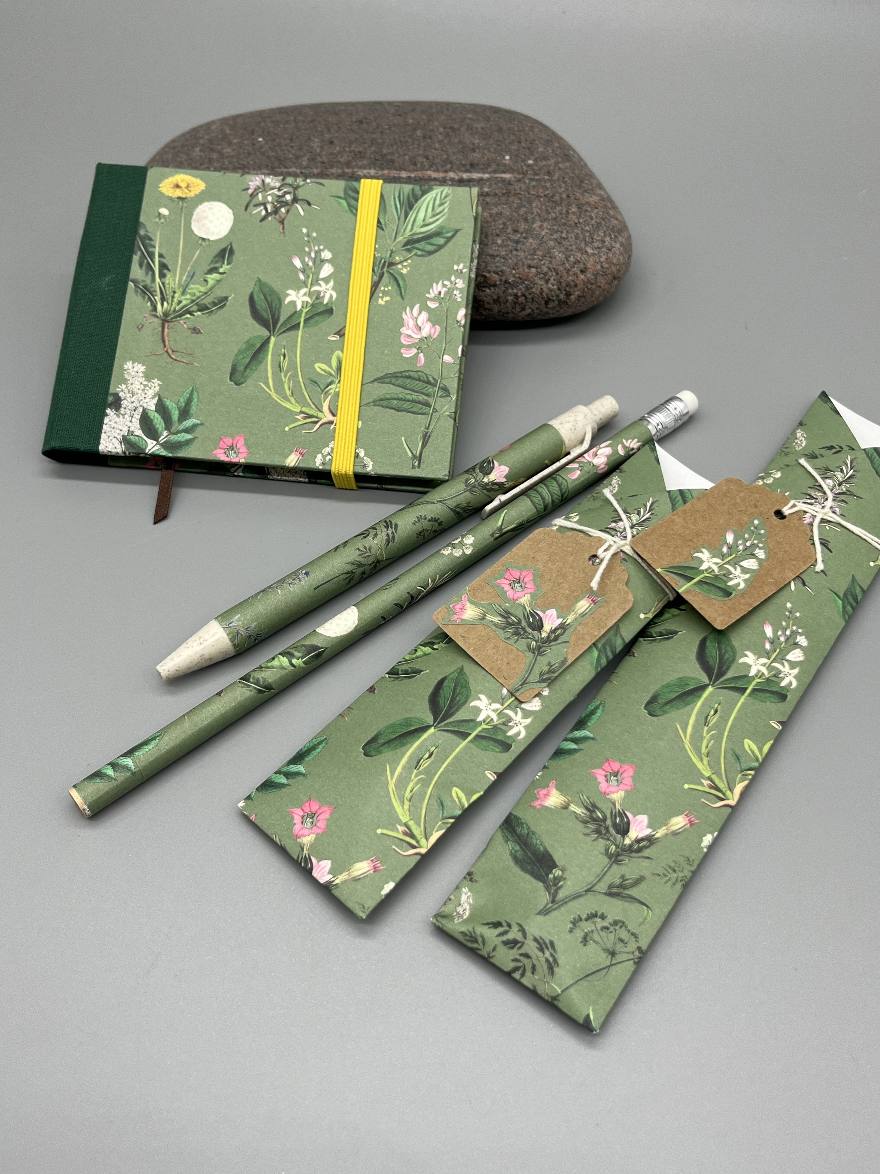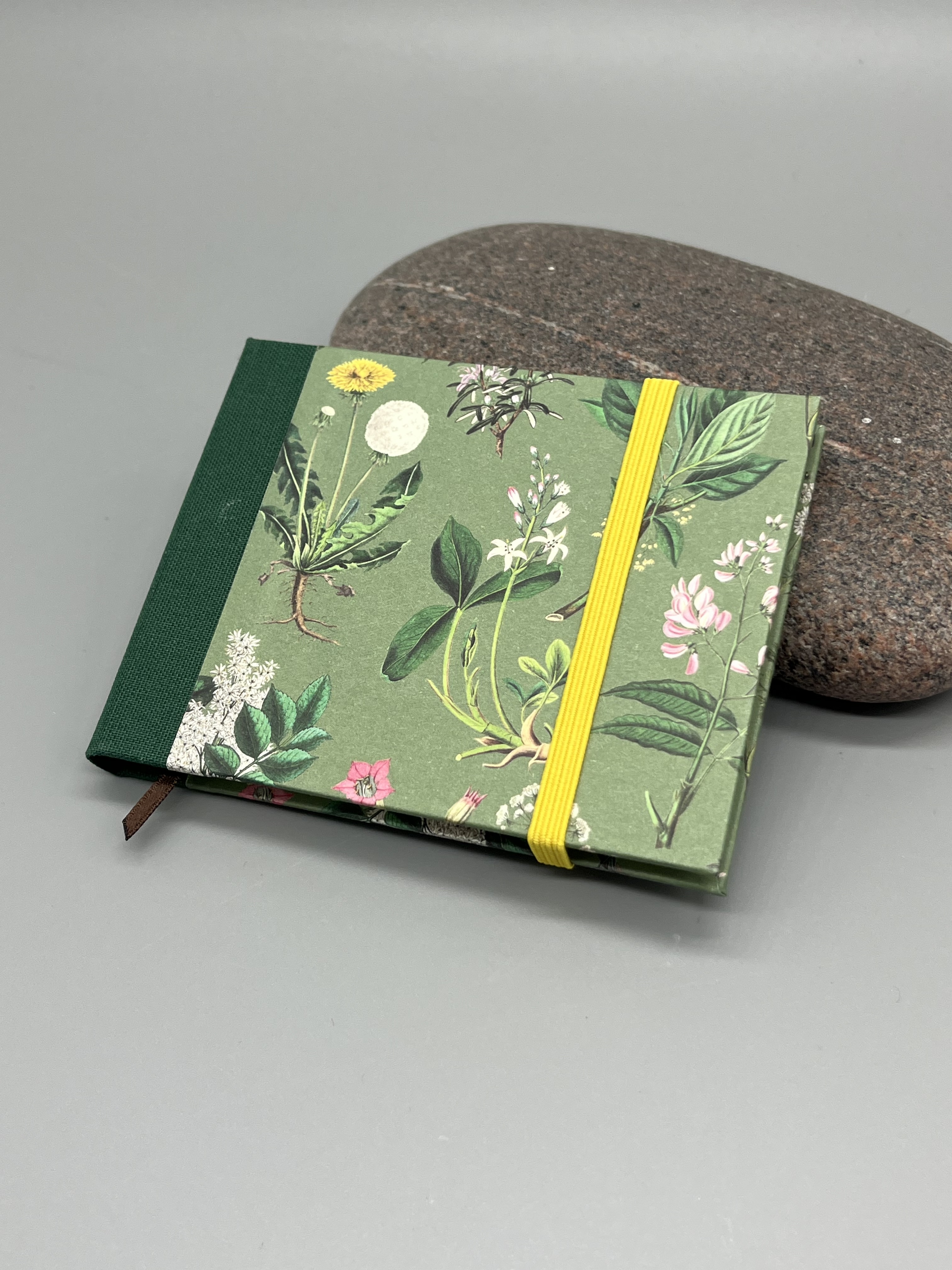 Das Notizbuch habe ich bezogen mit dem hochwertigen Geschenkpapier Herbarium. Verschiedene Heil- und Wildkräuter sind hier auf grünem Untergrund zu sehen.
