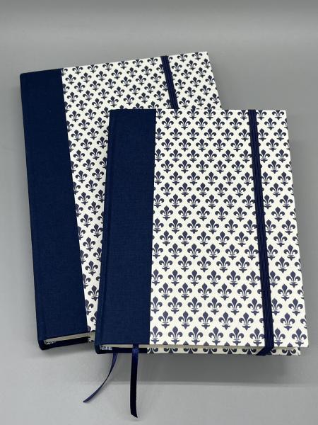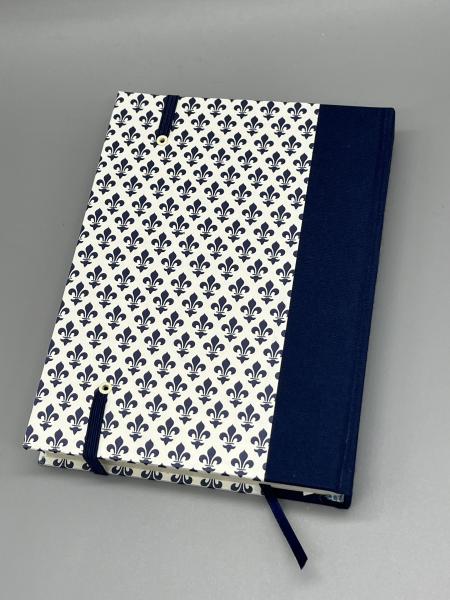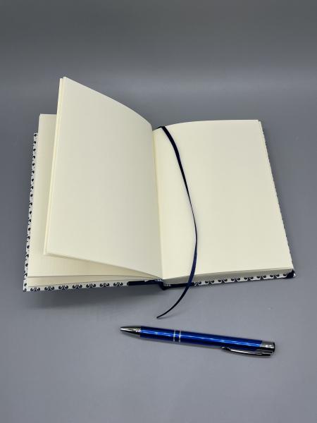 Das Notizbuch habe ich mit hochwertigem Papier mit Carta Varese-Druck bezogen. Der Buchrücken ist in dunkelblaues Leinen gebunden.