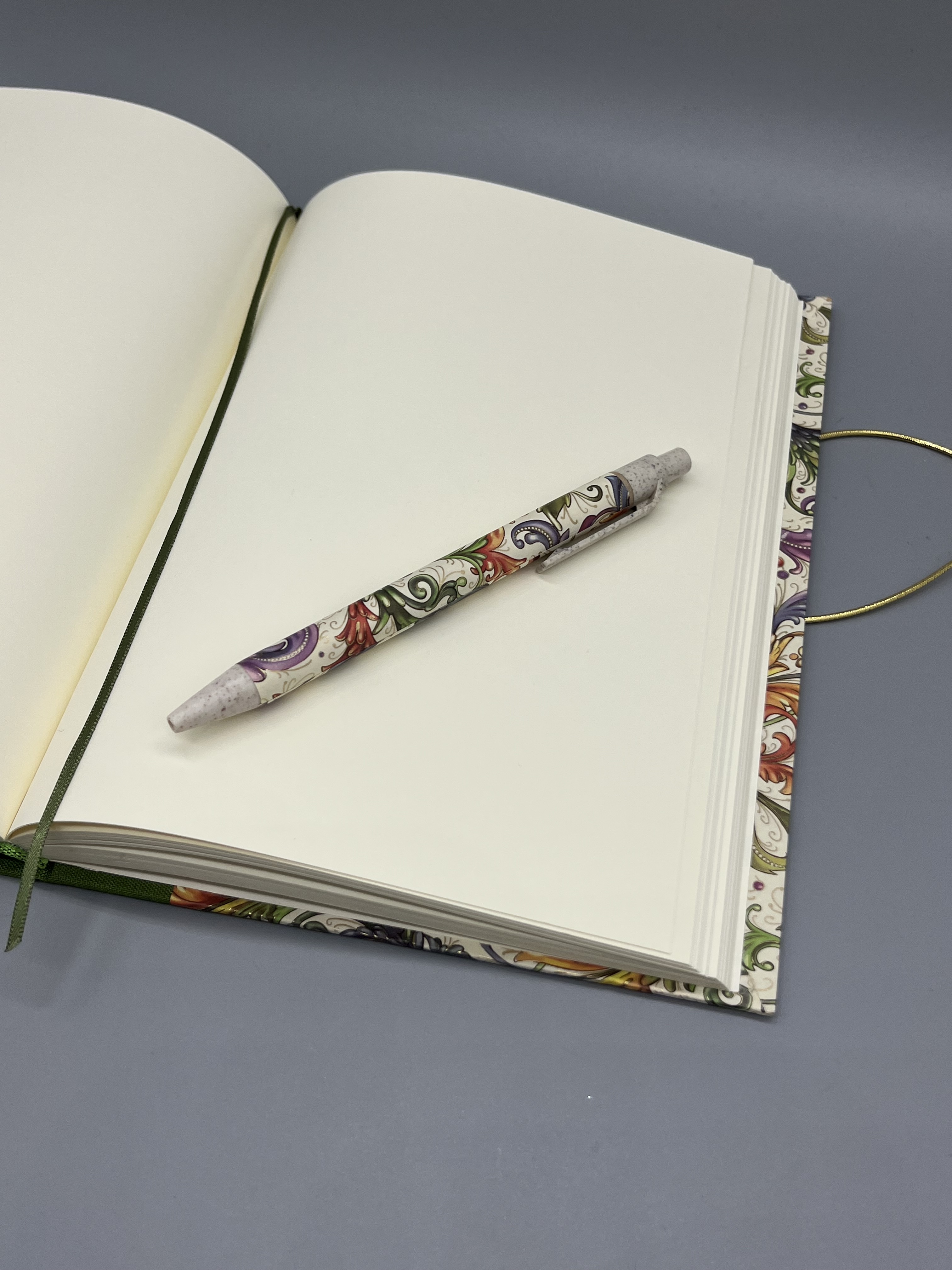 Das Notizbuch habe ich mit hochwertigem, italienischem Papier bezogen, das teilweise dezent mit Goldpulver bedruckt ist. Teile des Motivs glitzern dadurch ein wenig. Der Buchrücken ist in grünes Leinen gebunden.