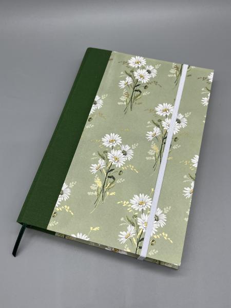 Dieses handgebundene Buch kannst Du immer und überall nutzen - oder auch prima verschenken, gemeinsam mit einem Sträußchen Gänseblümchen vielleicht. Die weißen Blüten sind auf den grünen Buchdeckeln schon gebündelt.