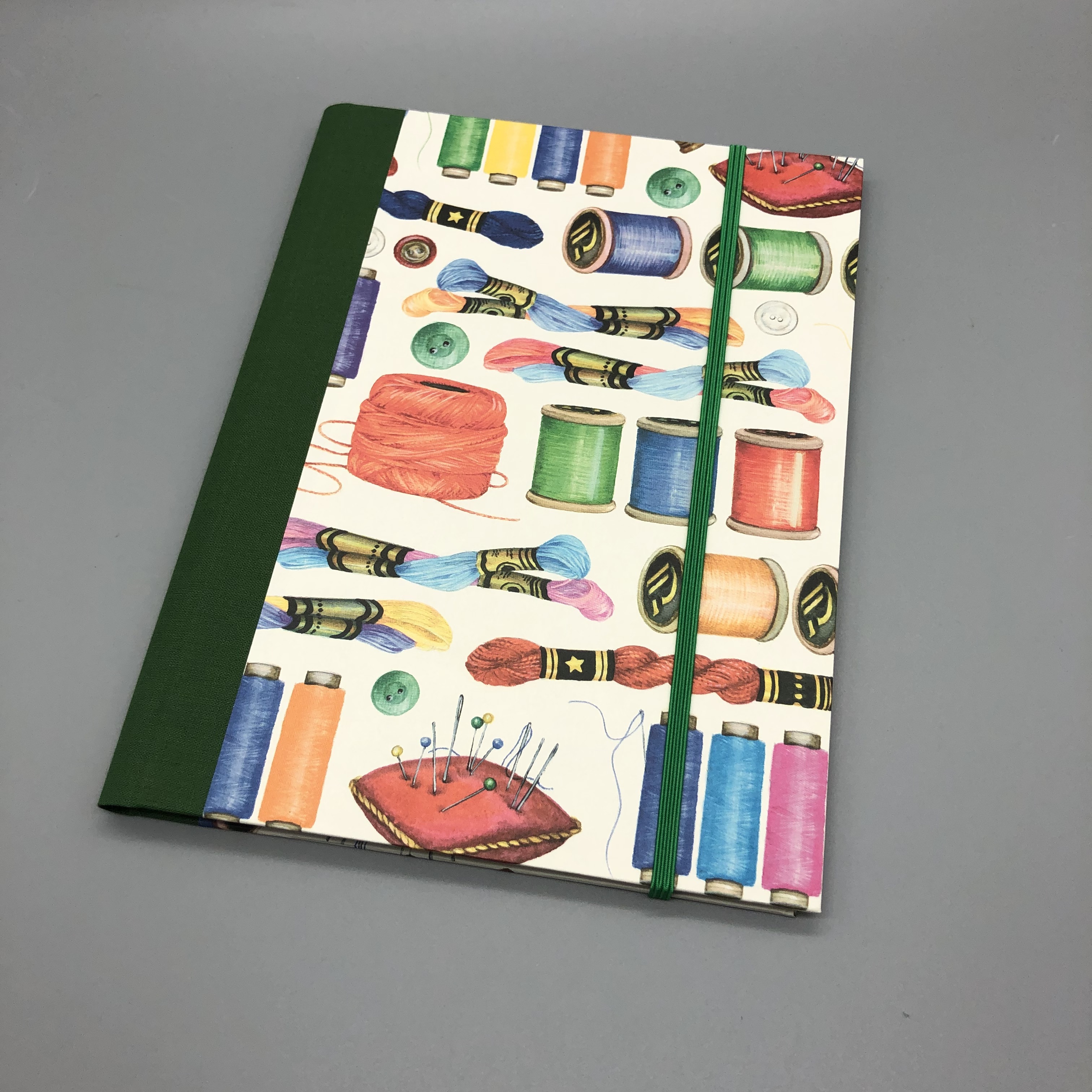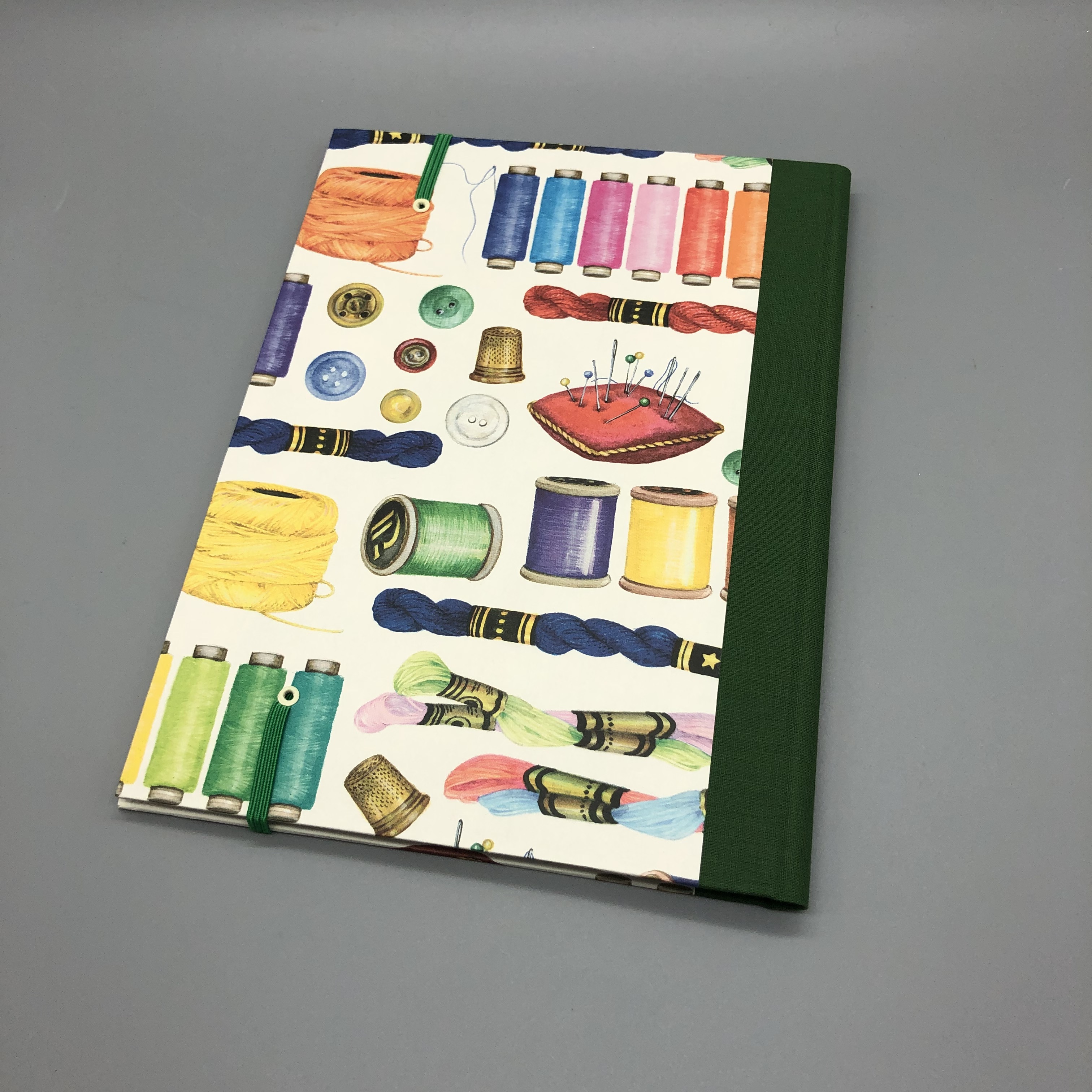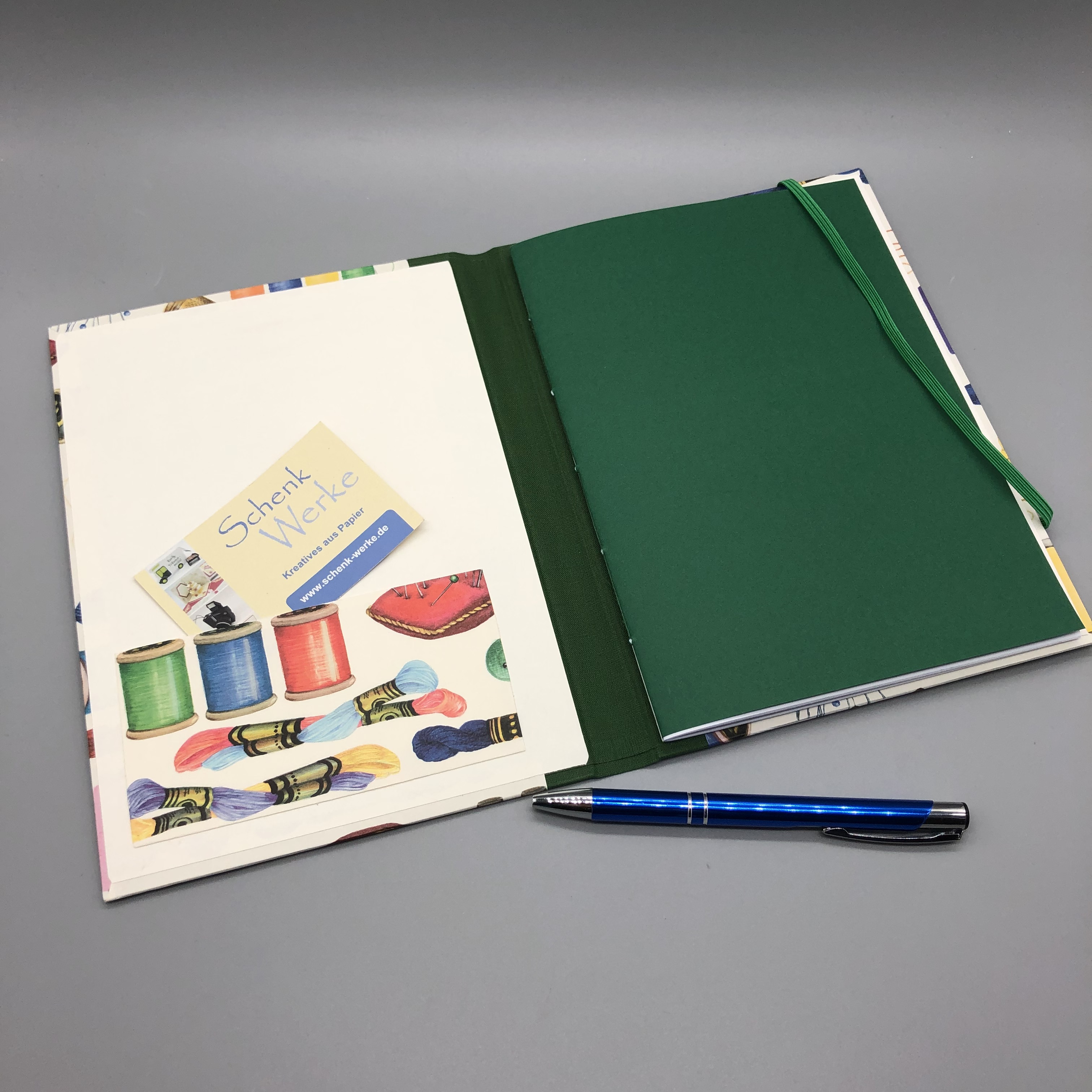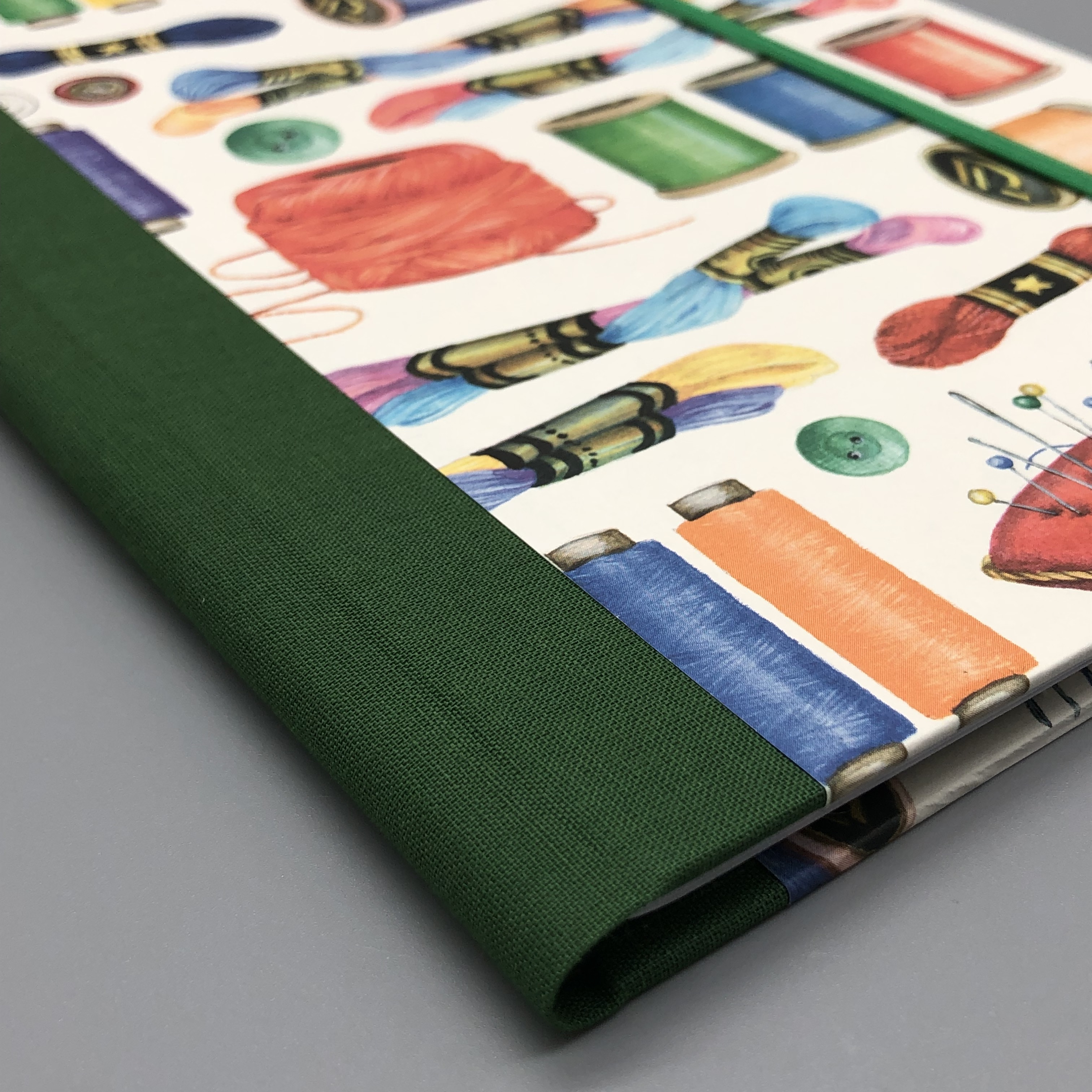 In diesem Notizbuch ist nachhaltig Platz für Deine Gedanken und Ideen! Du kannst hier alles notieren, was dir wichtig ist. Das Motiv mit Garnrollen und Knöpfen legt Notizen für Handarbeiten nahe.