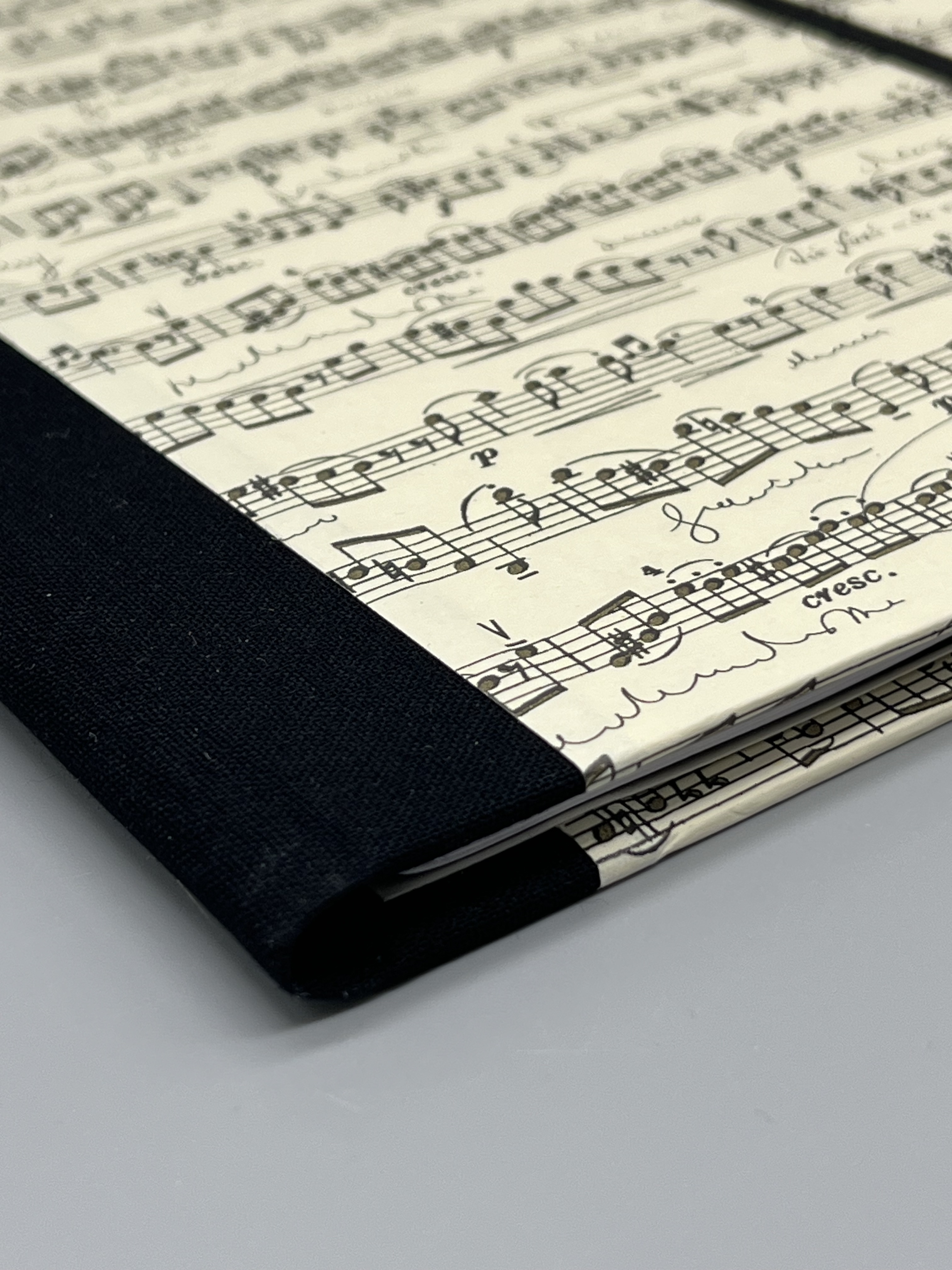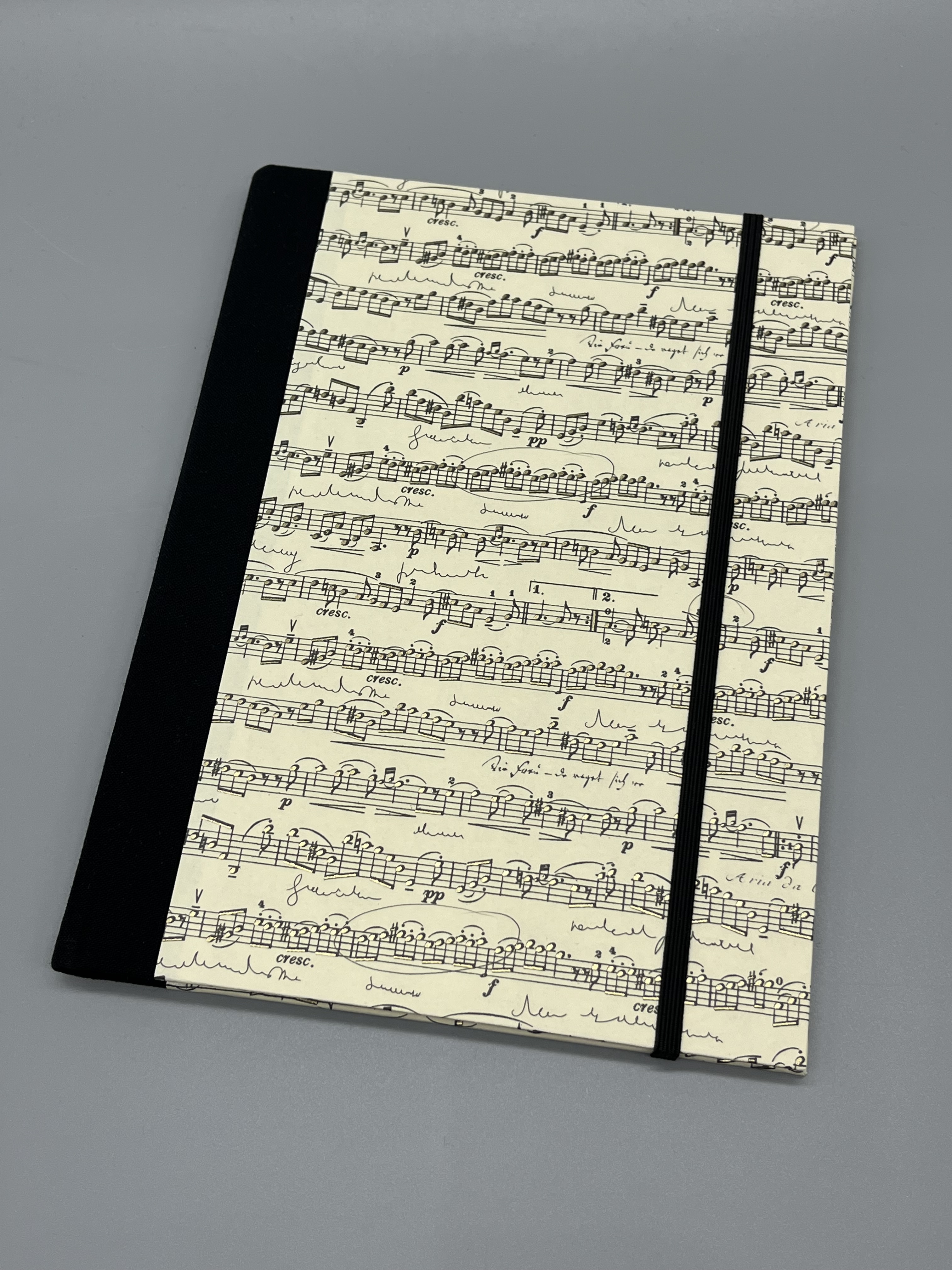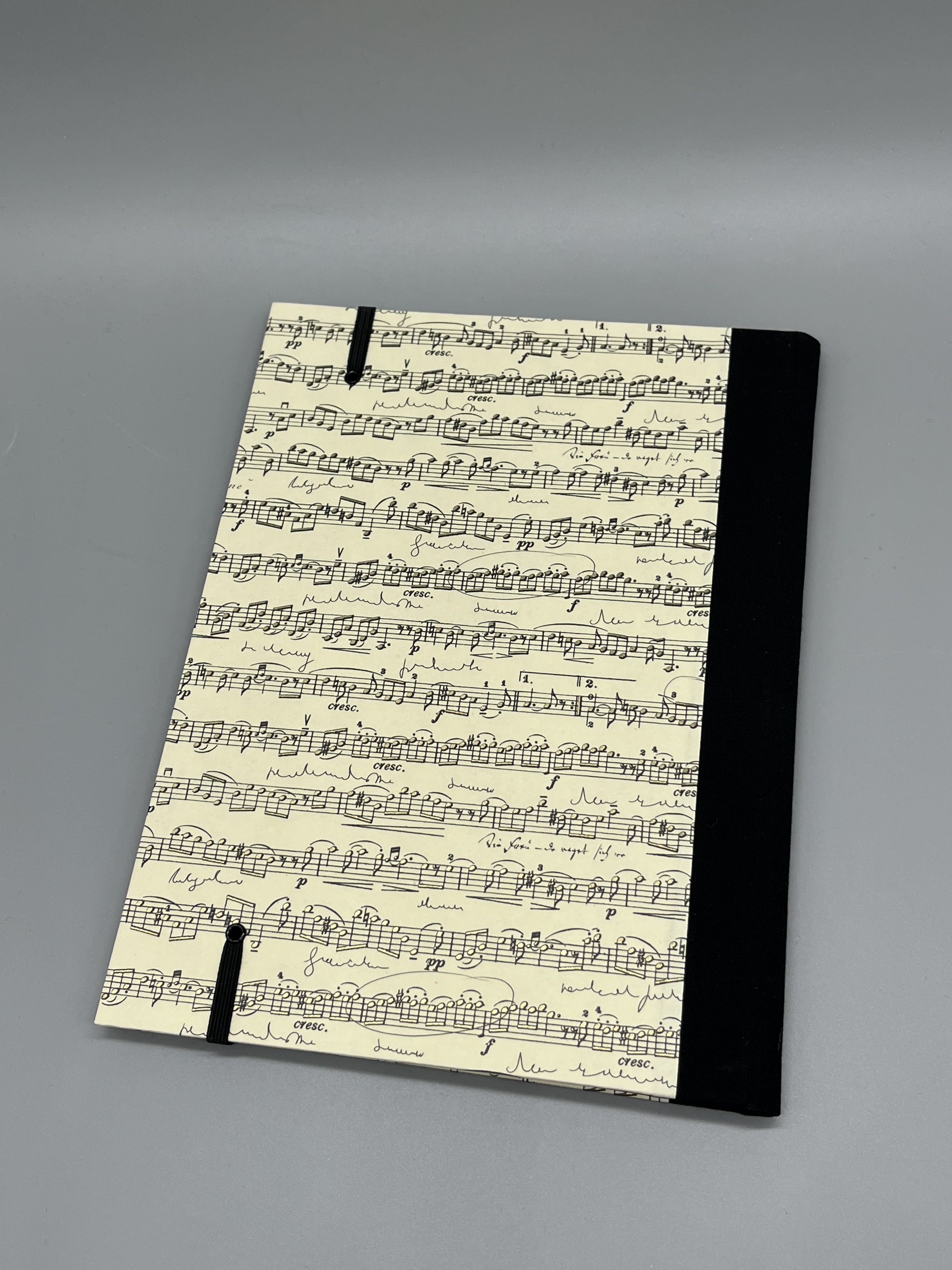 Die Hülle ist aus mit italienischem Geschenkpapier bezogener Graupappe gefertigt. Das edle Papier hat teilweise einen goldenen Schimmer auf den aufgedruckten Noten. Die Buchhülle hat einen leinengebundenen Rücken. In ihr findet ein Notizbuch im Format A6 Platz - oder jedes andere Heft bzw. Büchlein in entsprechender Größe.