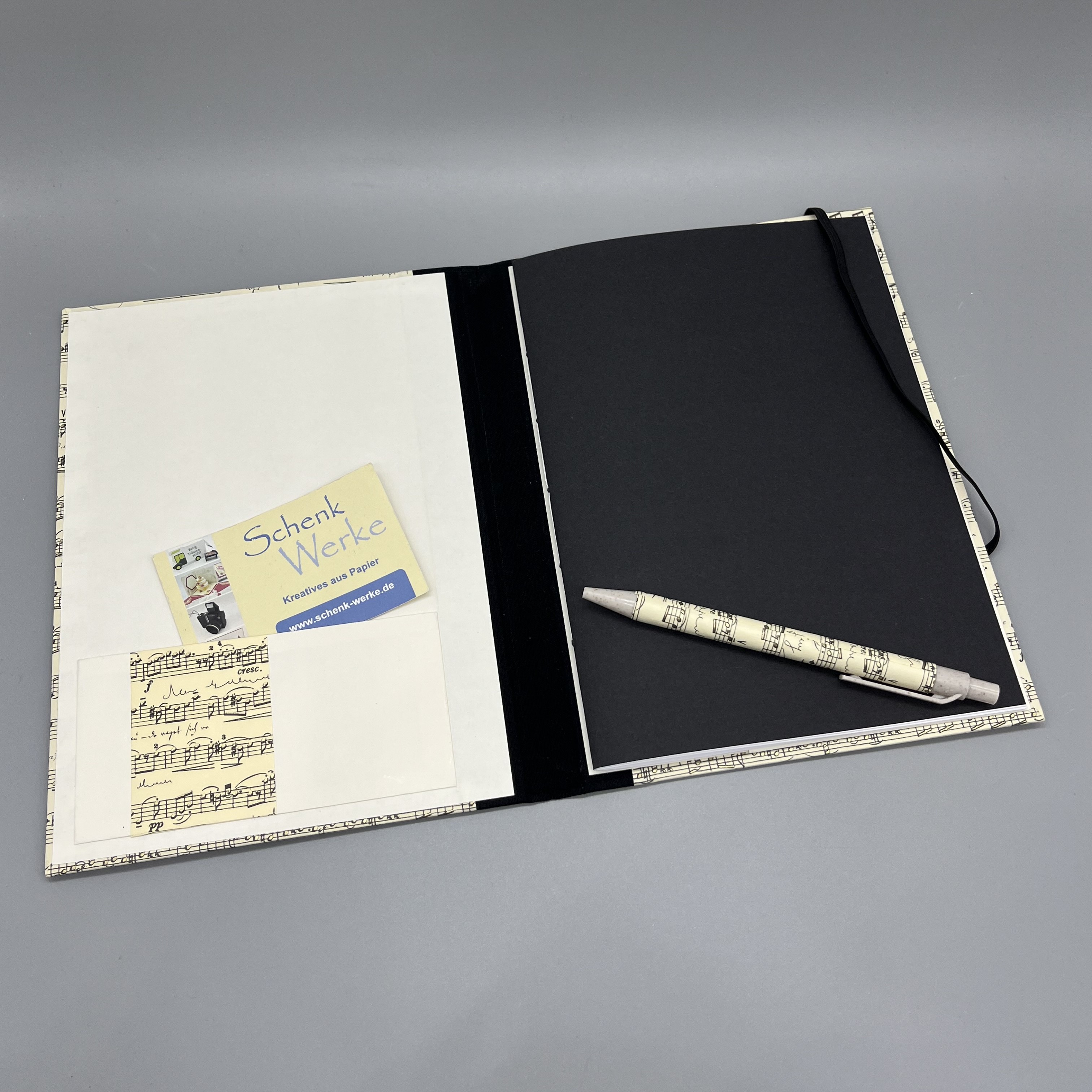 Tipp: Das Bezugspapier mit dem Notenmotiv habe ich in vielen verschiedenen Formaten verarbeitet, so beispielsweise in Ringbüchern oder weiteren Notizbüchern.