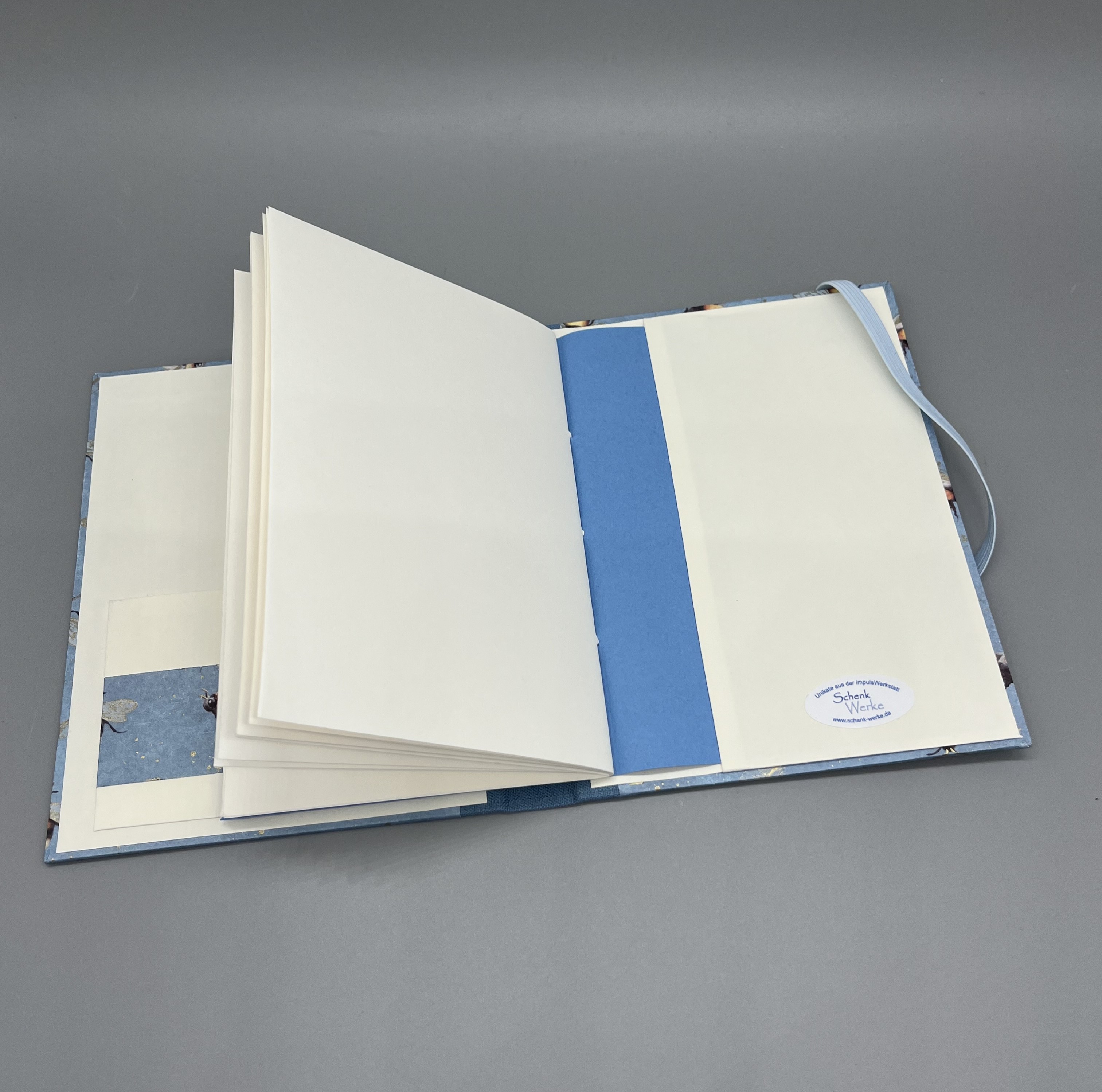 Der Rücken aus blauem Buchleinen bietet bis zu einem Zentimeter Platz, so dass auch stärkere Hefte oder flache Paperback-Bücher eingesteckt werden können. Das handliche Büchlein eignet sich also auch z.B. für Kalendarien oder die Losungen.
