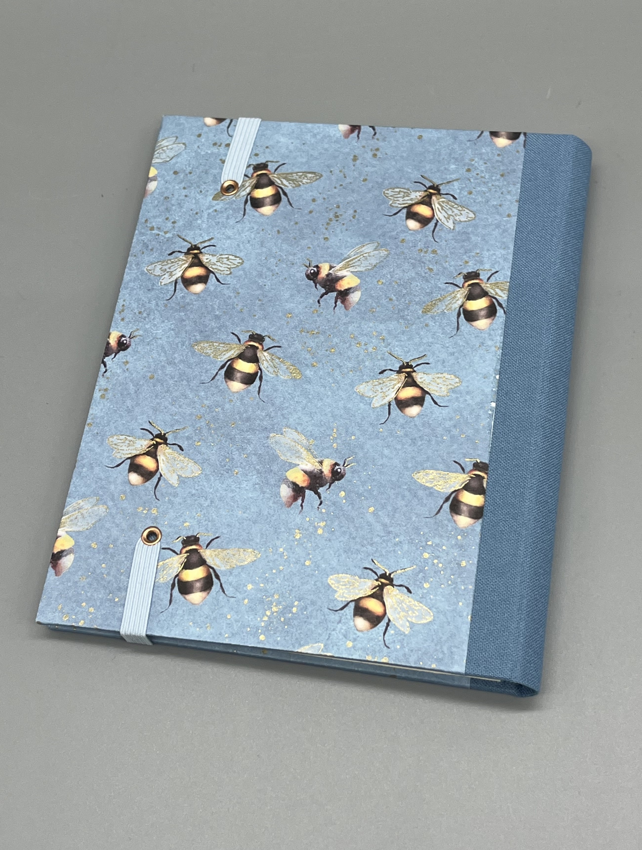 Die Hülle ist aus mit Geschenkpapier bezogener Graupappe gefertigt. Das in Blautönen bedruckte Papier zeigt die gelbbraunen Brummer im Flug. Goldene Sprenkel geben ein wenig Glanz.