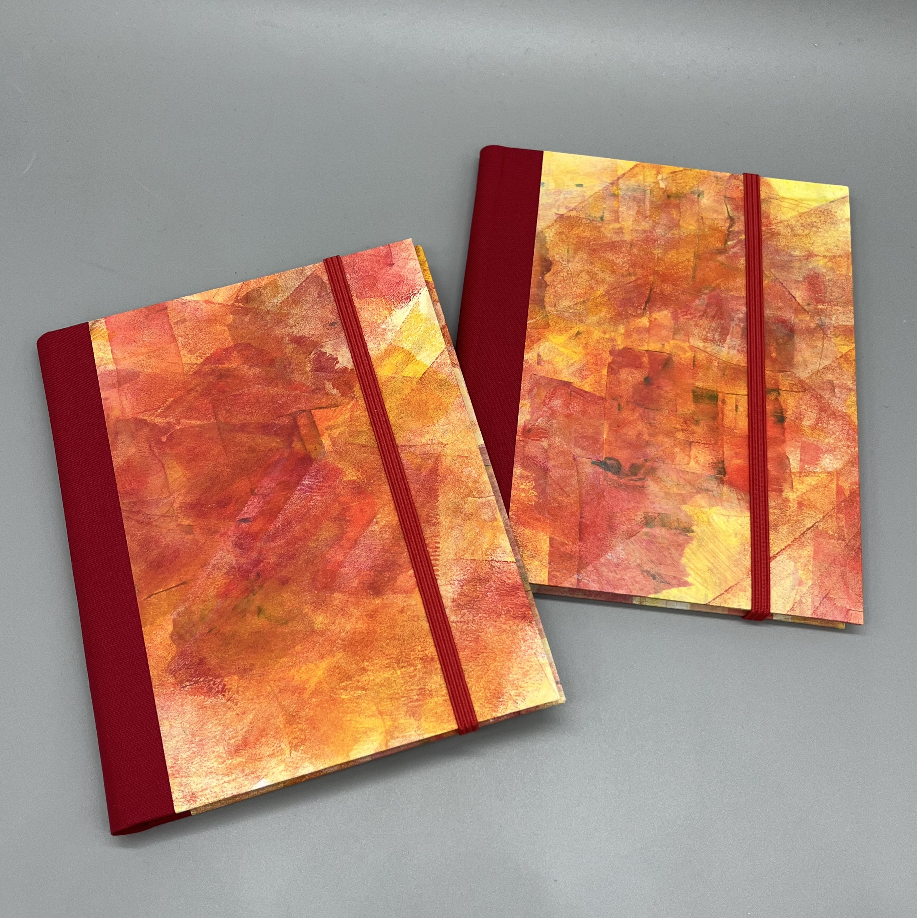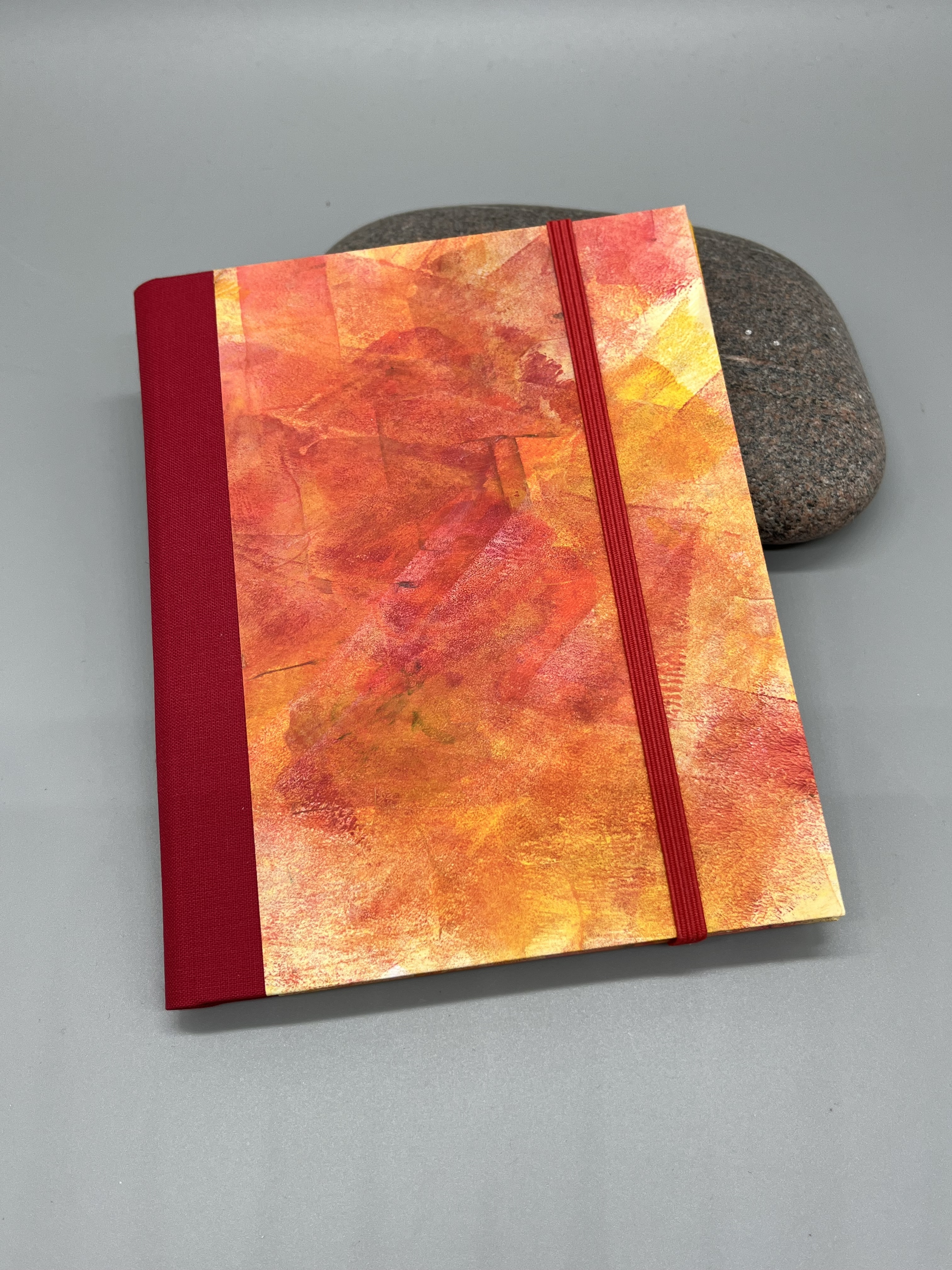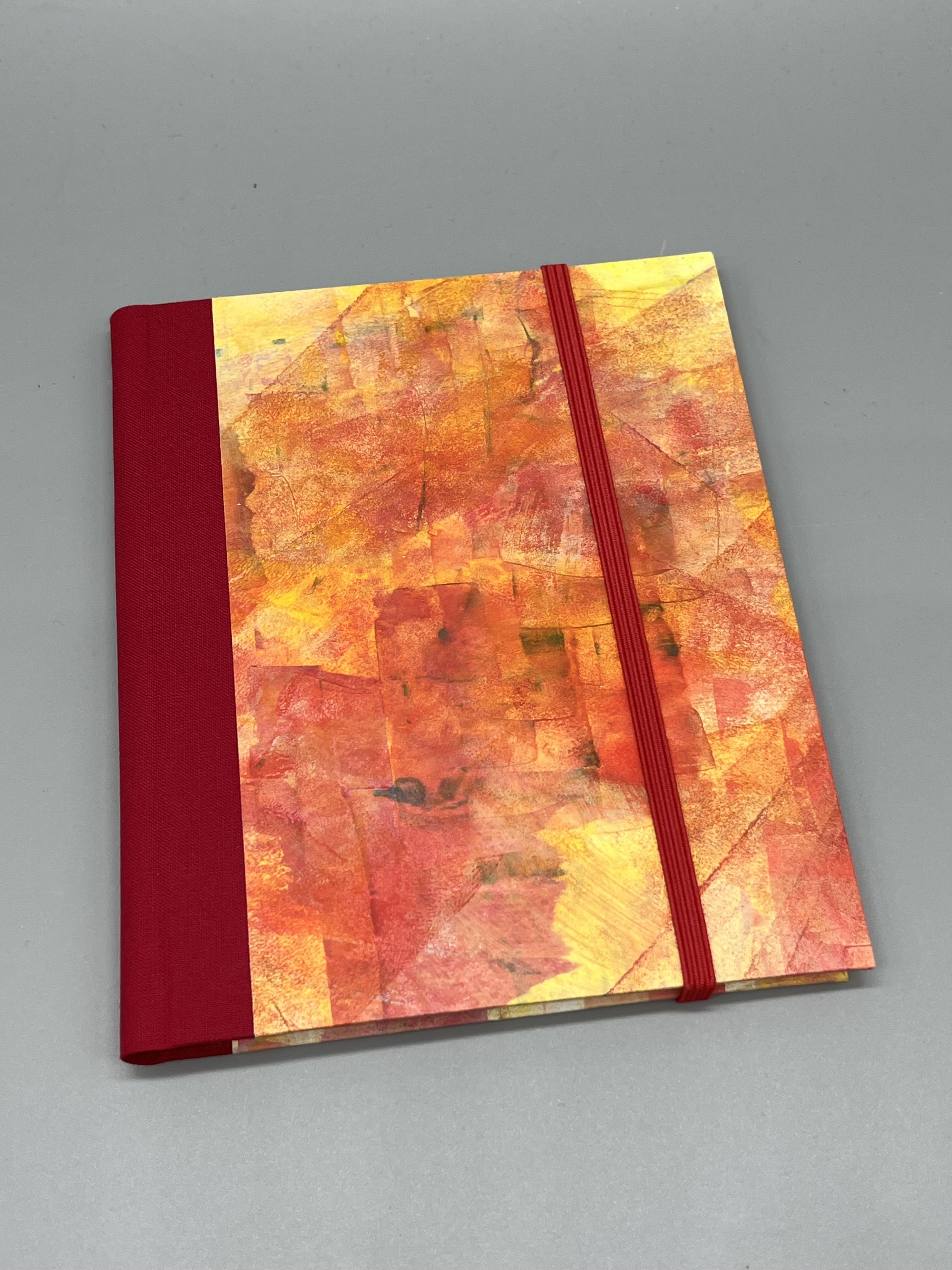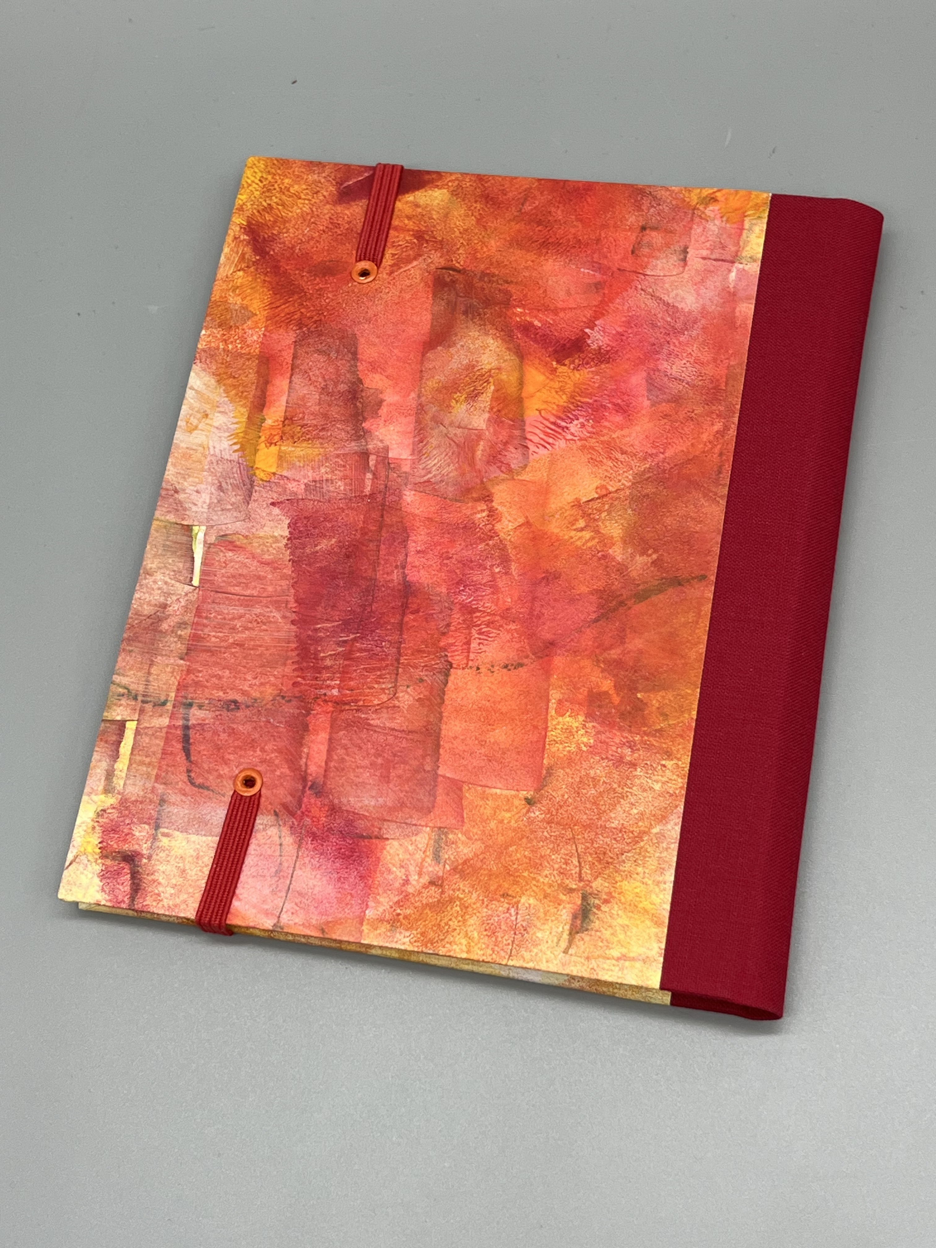 Das Papier, mit dem ich die Graupappe der Deckel bezogen habe, habe ich selbst gefärbt. Es handelt sich um Ausschnitte aus einem Acrylfarbenbild in Rottönen - ein Original, kein Druck. Und damit absolut einzigartig und nicht vervielfältigbar. Durch die gespachtelten Farben fühlt sich die Oberfläche der Buchdeckel leicht rau an und lässt Dich die materialgegebenen Unebenheiten spüren. So ist das Buch nicht nur ein Erlebnis für die Augen.