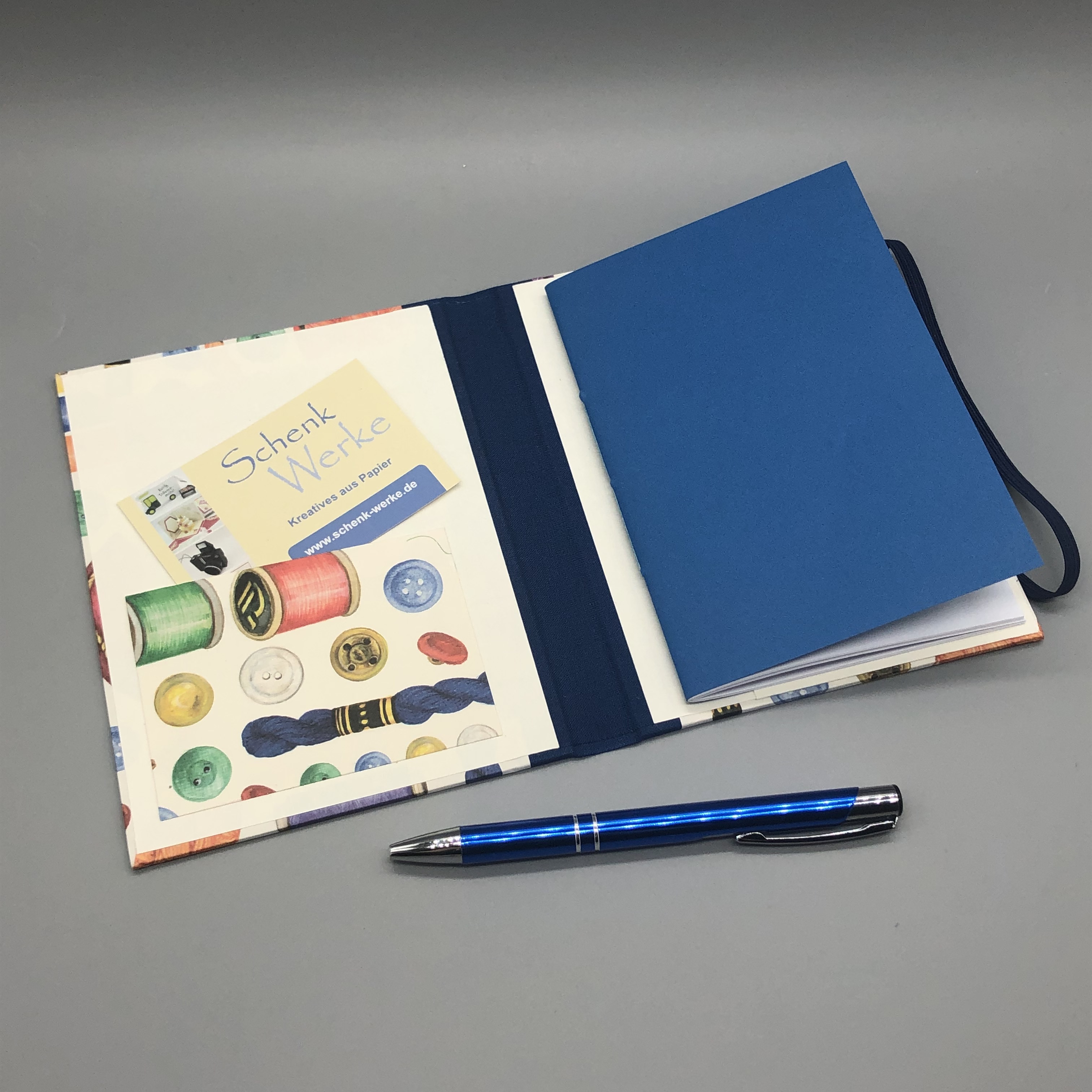 Die Hülle ist aus mit Papier bezogener Graupappe gefertigt und hat einen leinengebundenen Rücken. In ihr findet ein Notizbuch im Format A6 Platz - oder jedes andere Heft bzw. Büchlein in entsprechender Größe.