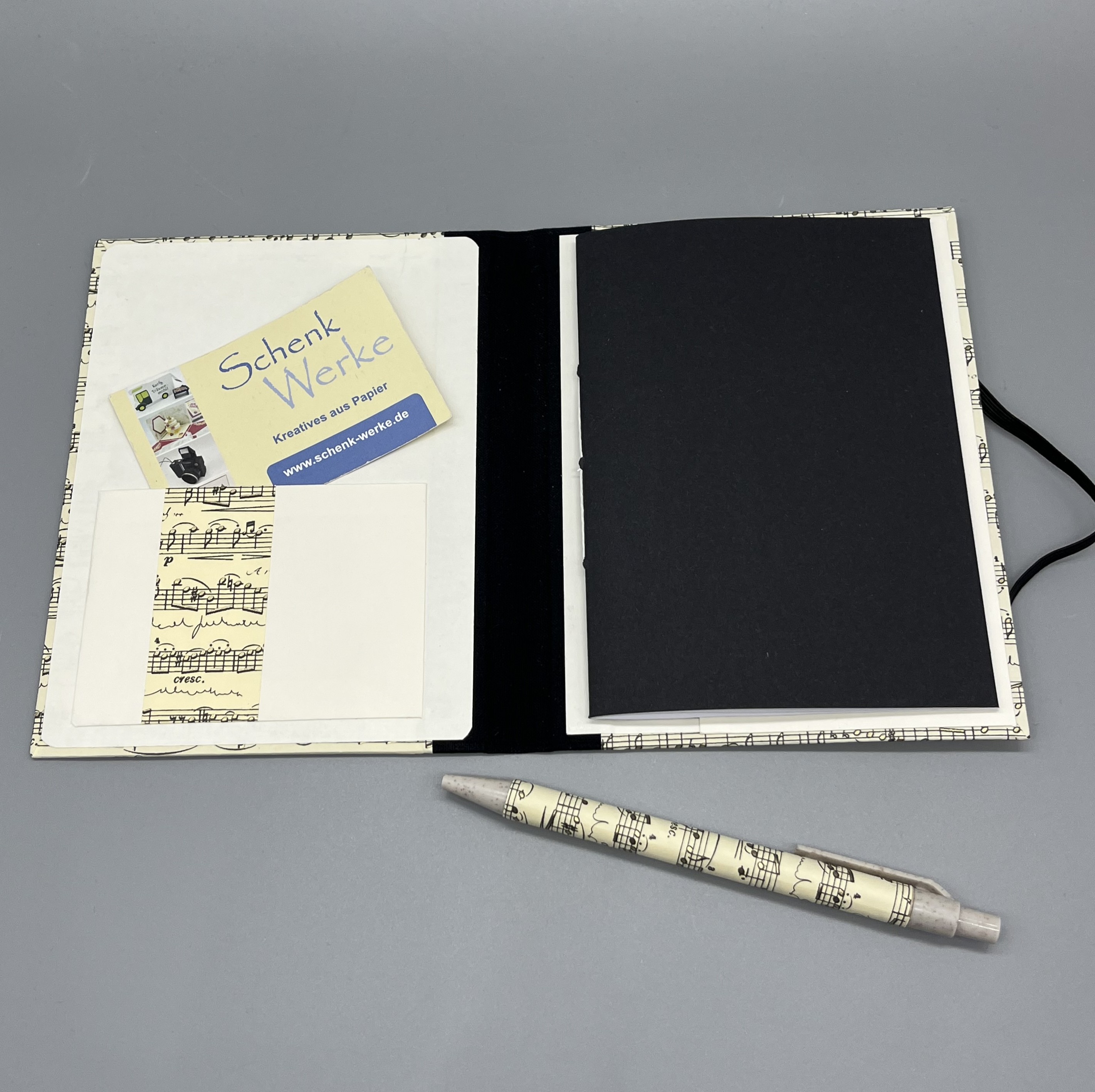Tipp: Das Bezugspapier mit dem Notenmotiv habe ich in vielen verschiedenen Formaten verarbeitet, so beispielsweise in Ringbüchern oder weiteren Notizbüchern.