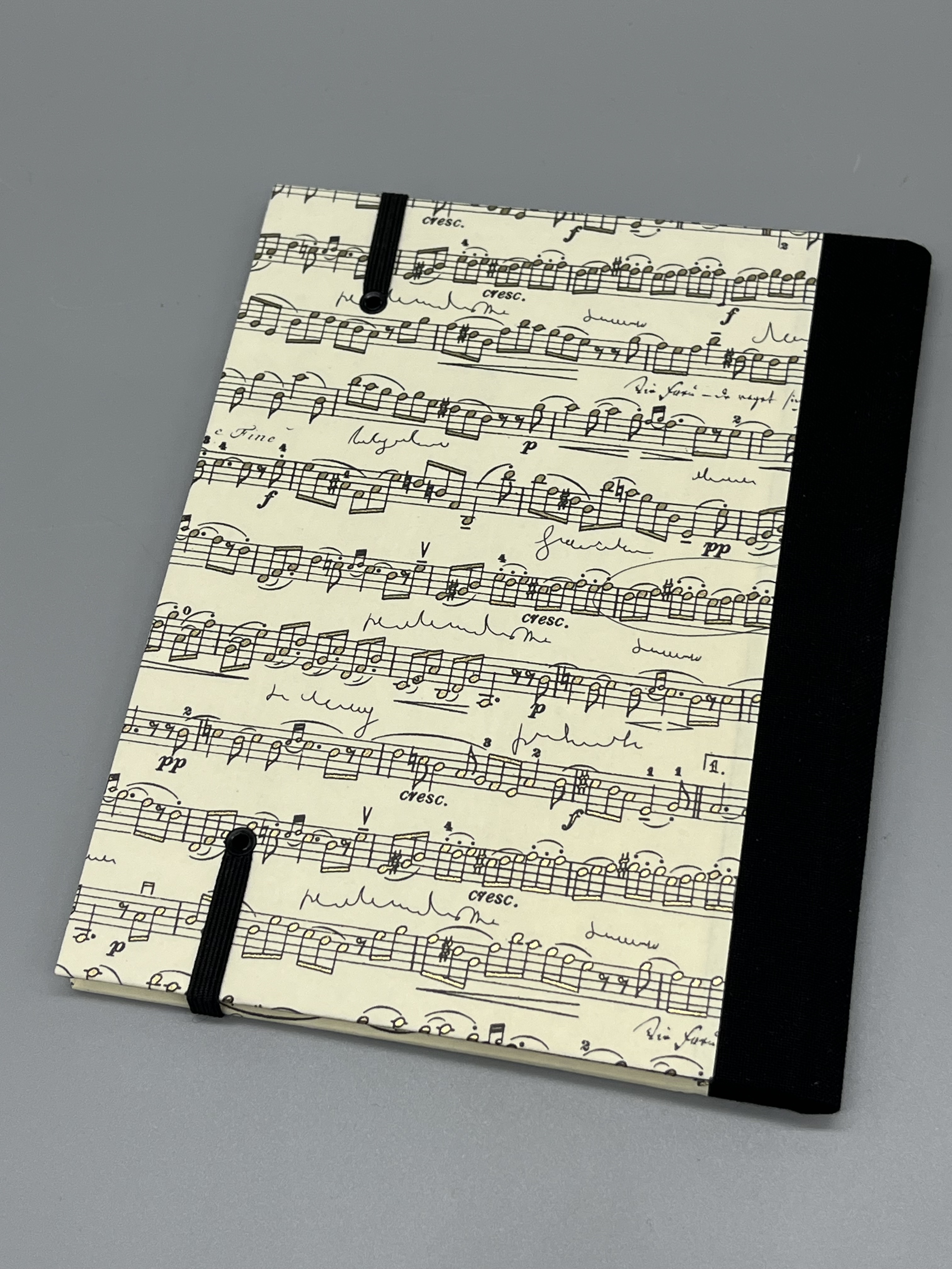 Die Hülle ist aus mit italienischem Geschenkpapier bezogener Graupappe gefertigt. Das edle Papier hat teilweise einen goldenen Schimmer auf den aufgedruckten Noten. Die Buchhülle hat einen leinengebundenen Rücken. In ihr findet ein Notizbuch im Format A6 Platz - oder jedes andere Heft bzw. Büchlein in entsprechender Größe.