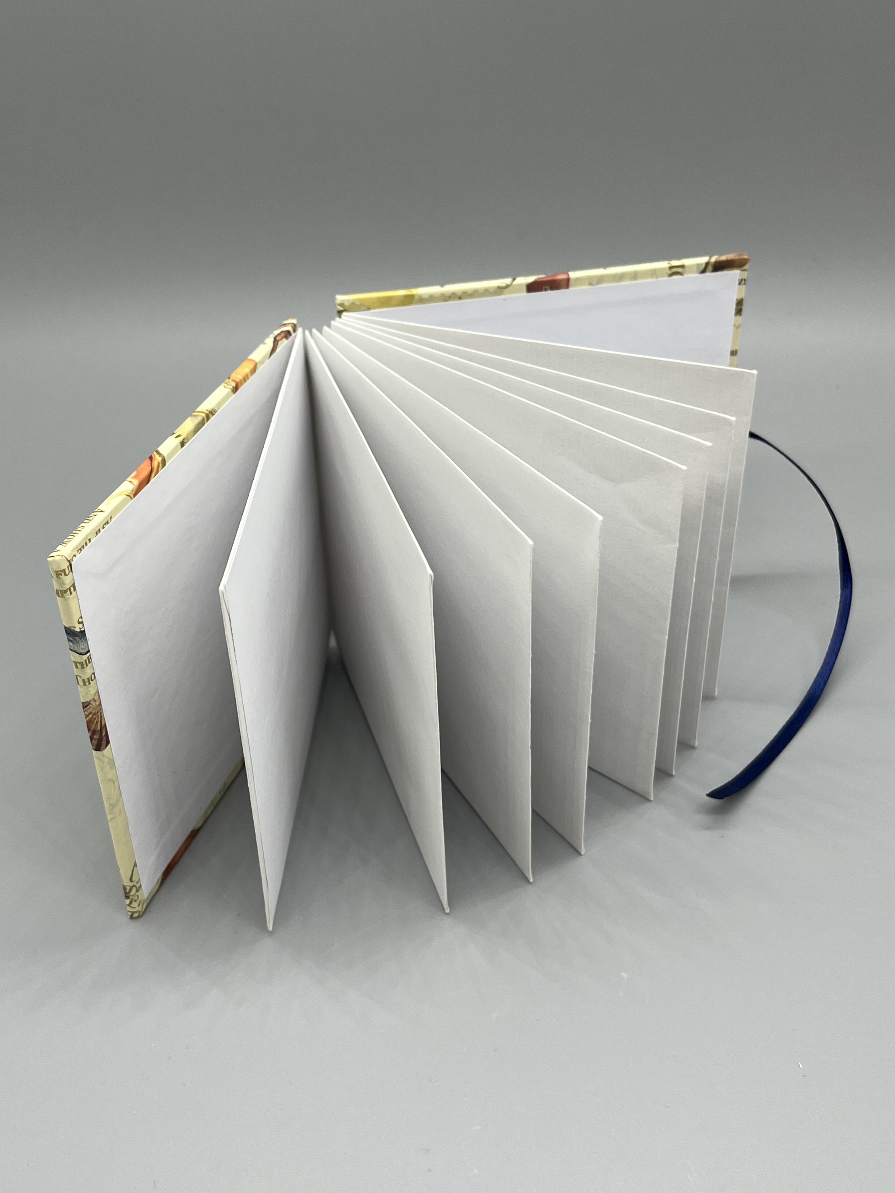 Die Seiten habe ich mit Tonzeichenpapier gefertigt. Die Deckel aus Graupappe habe ich bezogen mit hochwertigem italienischen Geschenkpapier mit dezentem Golddruck. Zu sehen sind verschiedene Tiere, Begriffe und Gegenstände, die mit dem Ozean in Verbindung gebracht werden.