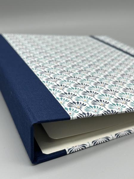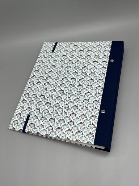 - Im vorderen Deckel befindet sich ein Steckfach für zusätzliche lose Blätter. Ein Streifen des Bezugspapieres ist auch hier angebracht.