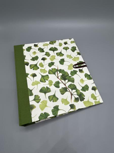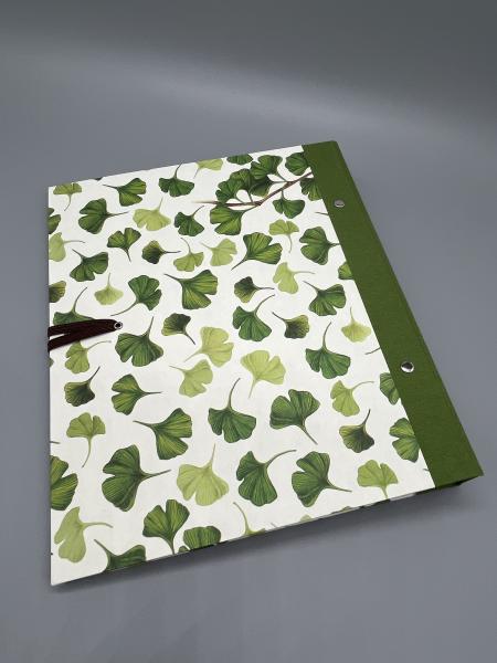 Ginkgoblätter in verschiedenen Grüntönen sind auf diesem handgebundenen Ringordner "verstreut". Sie warten schon auf die Blätter, die Du einfügst.Der Ordner hat Platz für Seiten im DIN A5-Format. Die Ringmechanik für Standardlochung erlaubt Dir ein schnelles Einheften und Austauschender Blätter. Der Ringordner kommt leer bei Dir an. Nur ein Deckblatt ist bereits eingelegt. So kannst Du Deine Seiten ganz individuell zusammenstellen oder nach und nach sammeln. Die Ringmechanik hat eine Füllhöhe von etwa 1,5 cm. Ein Niederhalter aus Metall hilft gegen Verrutschen der eingehefteten Seiten.