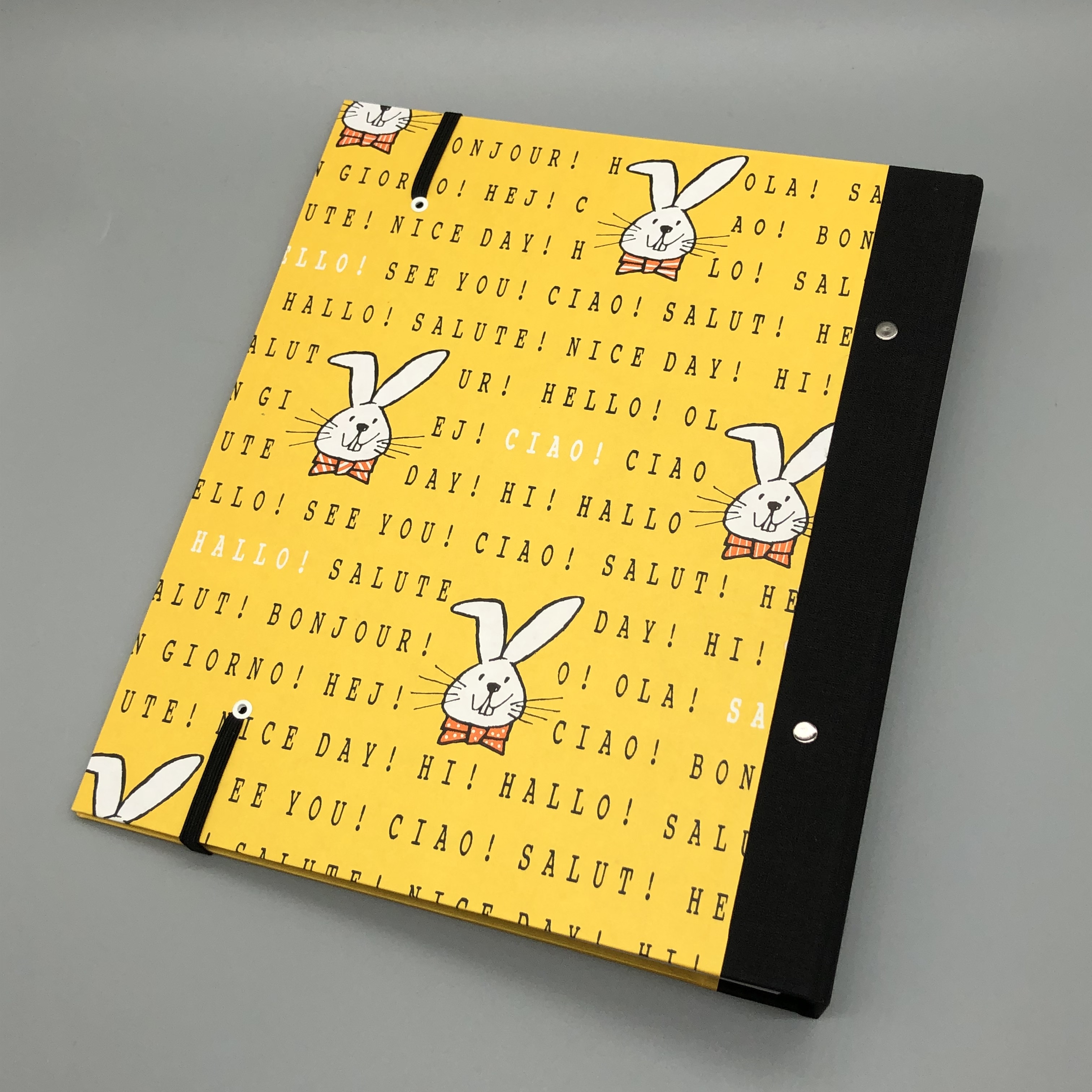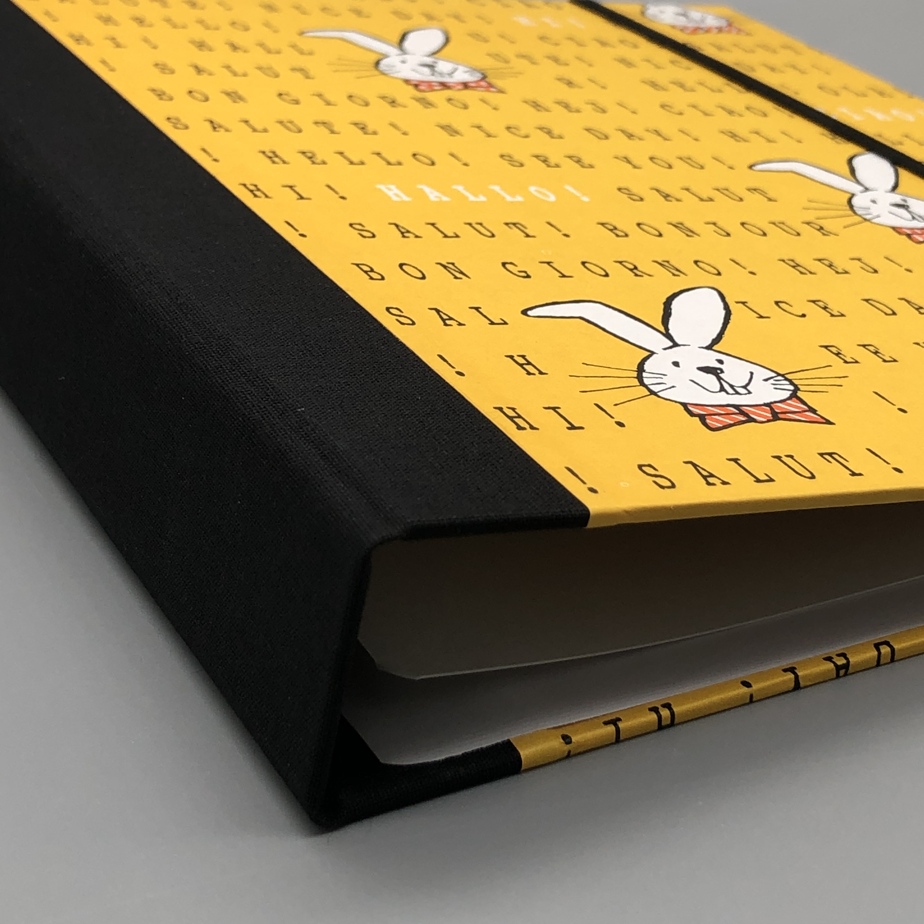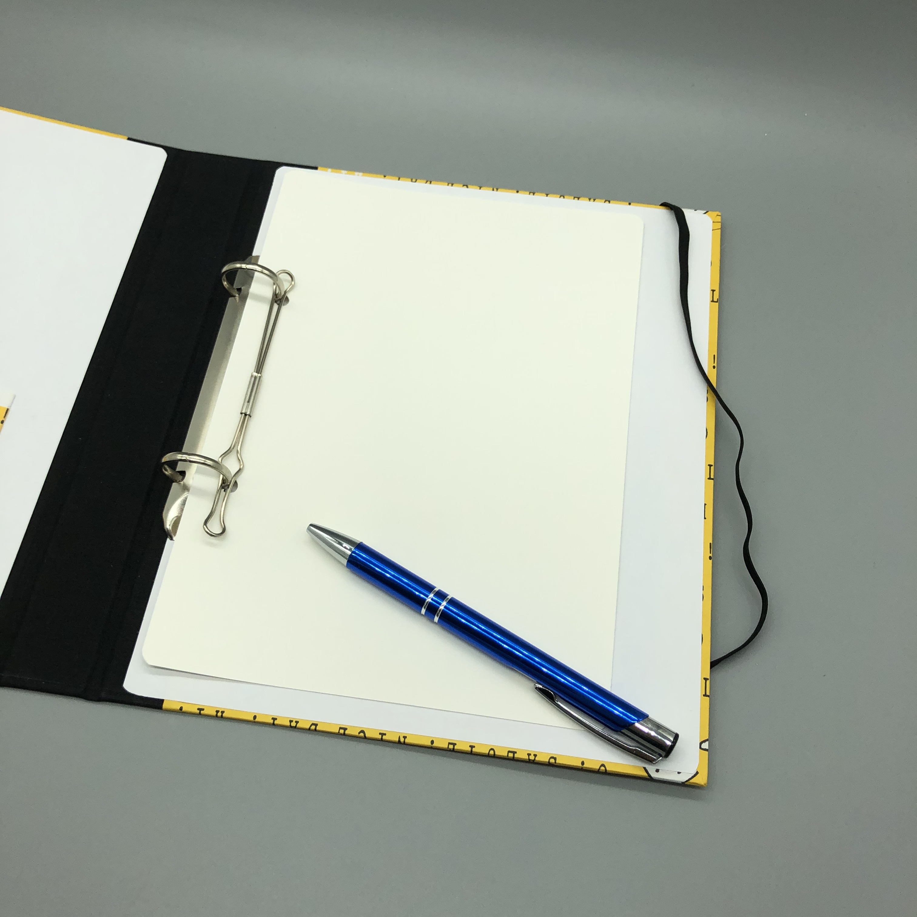 Gefertigt ist der Ringordner A5 Hallo mit hochwertigen Papieren. Der Buchrücken ist mit schwarzem Buchbinderleinen bezogen. Eine Gummikordel hält den Ordner geschlossen.