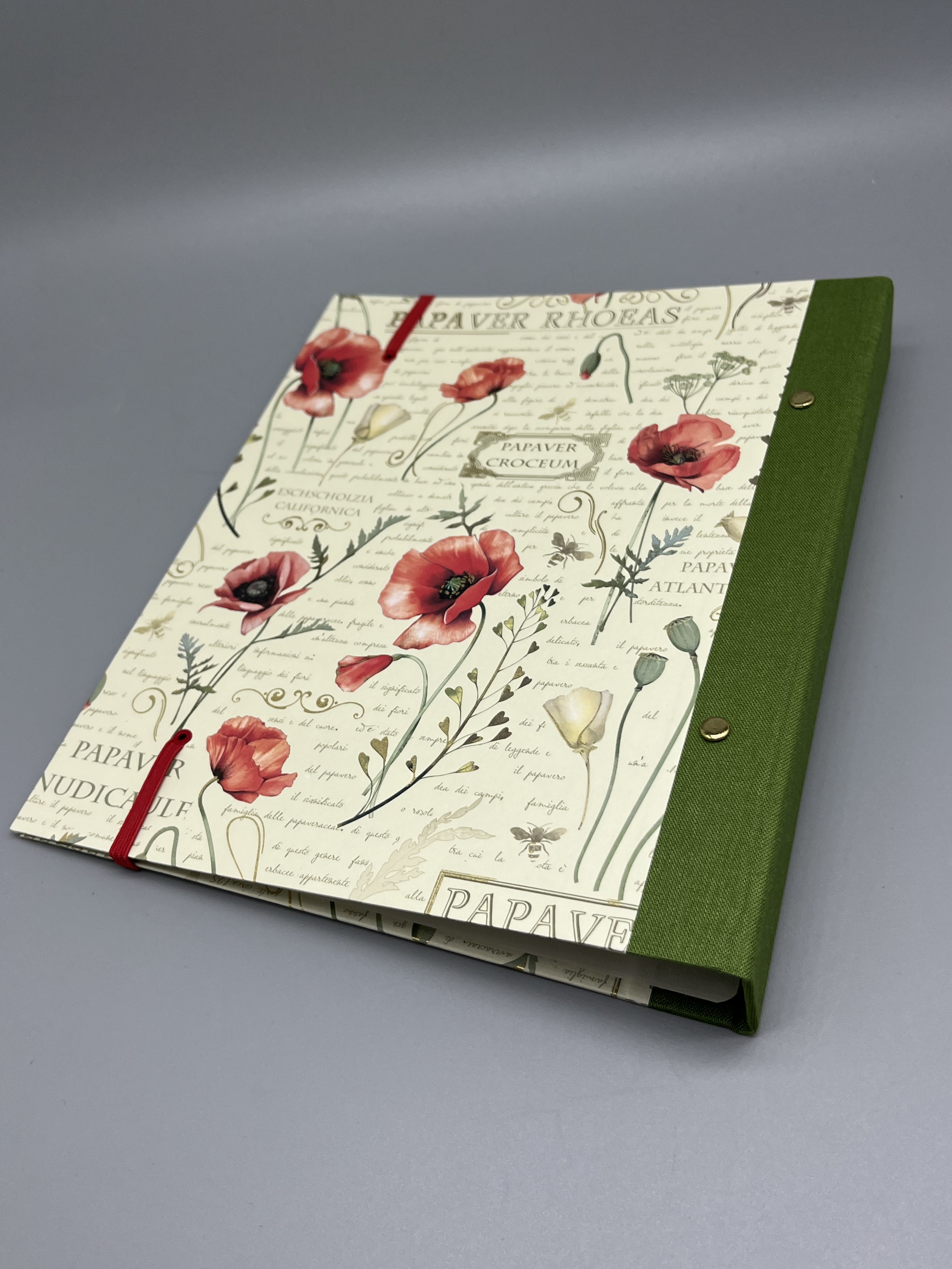 Klatschmohn in seinen verschiedenen Reifegraden Knospe, Blüte und Kapsel sind auf den Deckeln dieses Ringordners zu sehen.