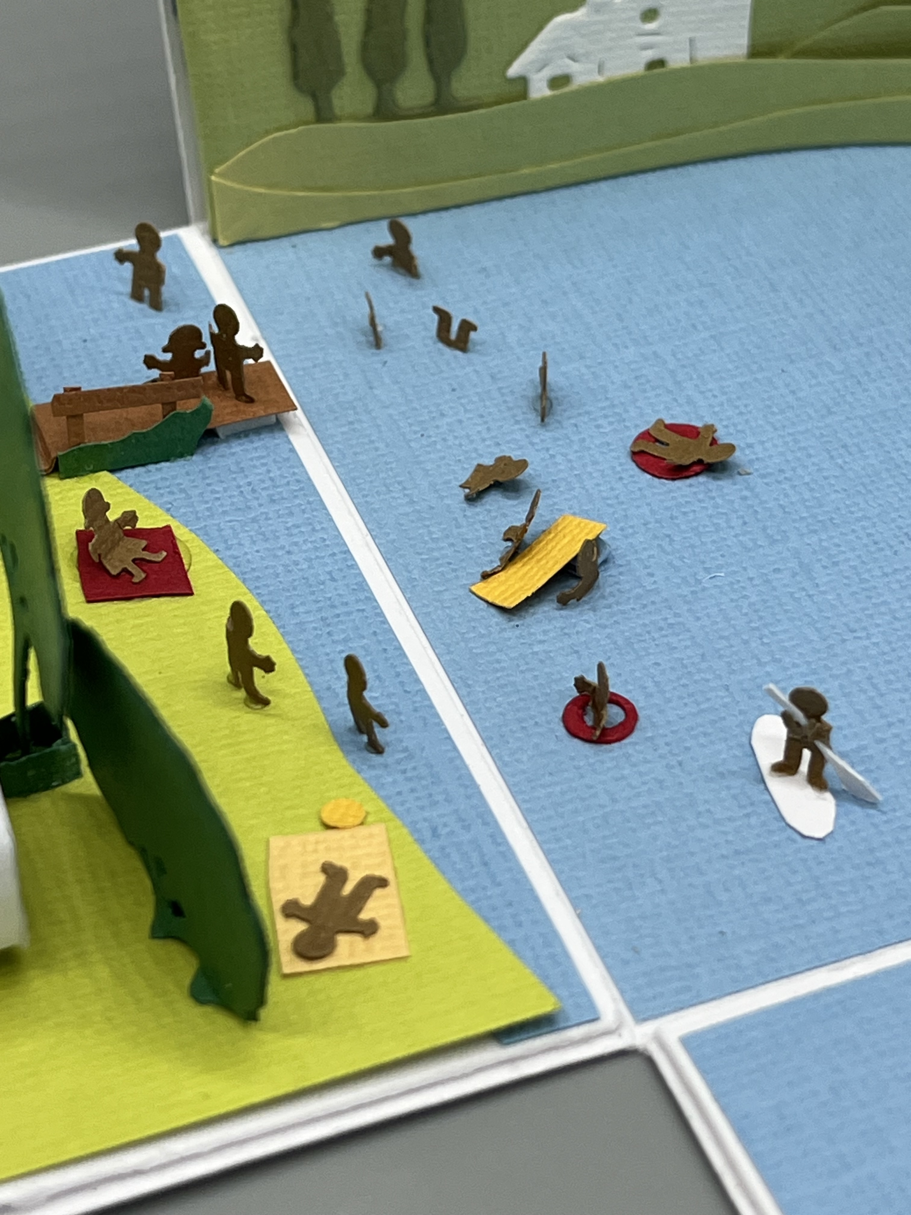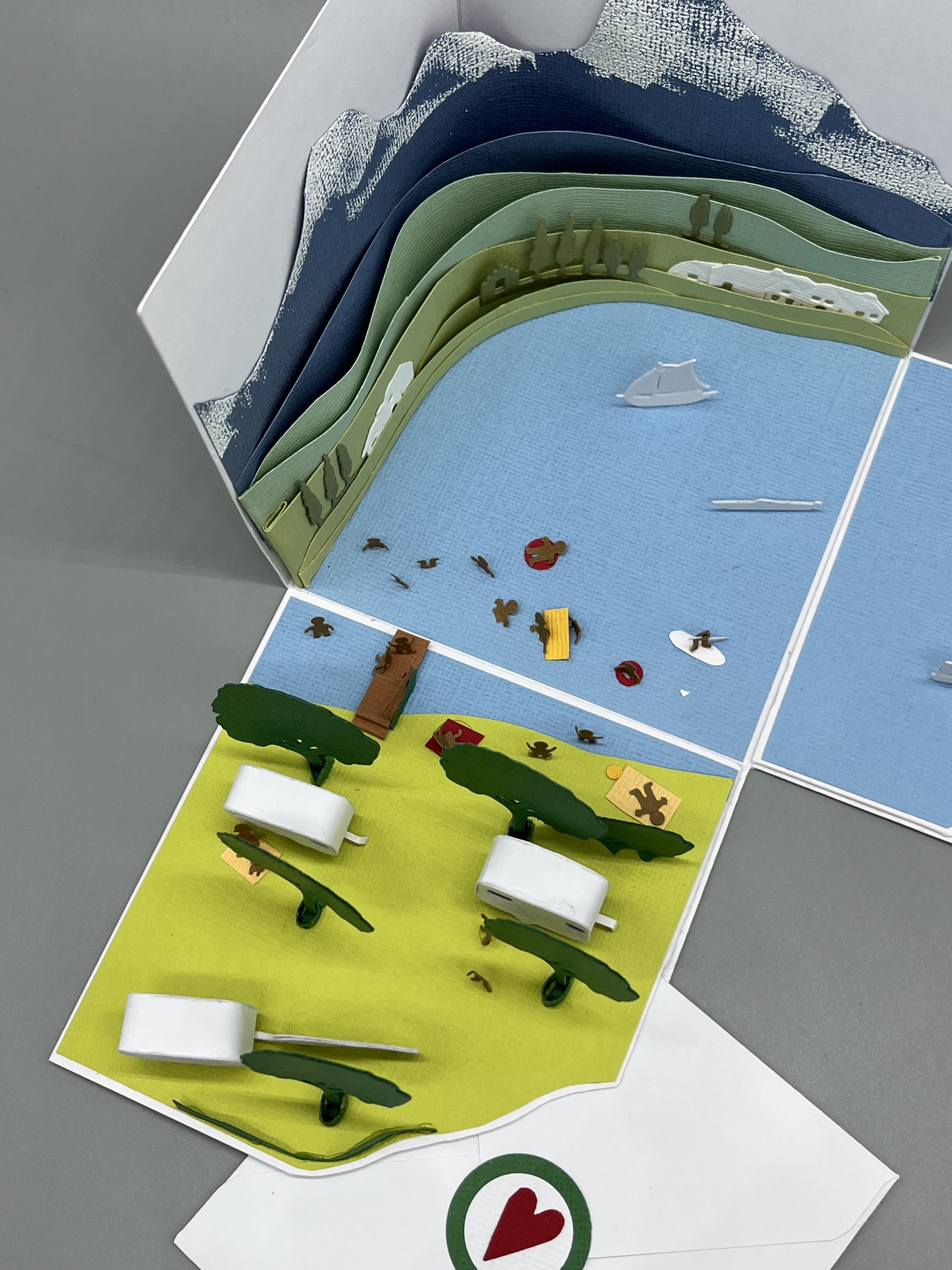 Im Innern habe ich versucht, die Landschaft ein wenig aufzunehmen, was mit den Größenverhältnissen immer schwierig ist. Aber es sollten Berge im Hintergrund und natürlich der Gardasee sowie ein Campingplatz dargestellt werden. So entstand das mehrschichtige Gelände in der stehenden Ecke der Box. Die große Entfernung zur anderen Seeseite ist hier mit bewusst wenigen Details und gedeckten Farben angedeutet. Weiße Boote schippern über das Wasser.