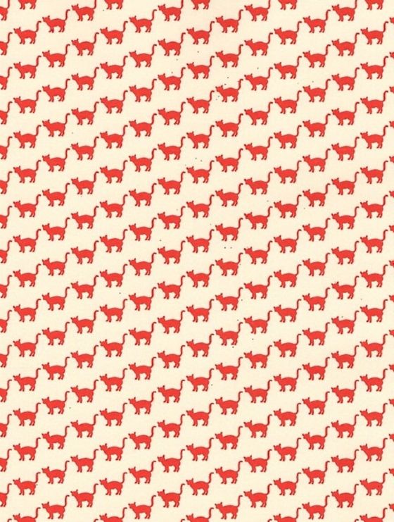 Auf cremefarbenem Hintergrund sind reihenweise rote Kätzchen gedruckt. Nach Carta-Varese-Art ziehen sie sich über den gesamten Bogen.