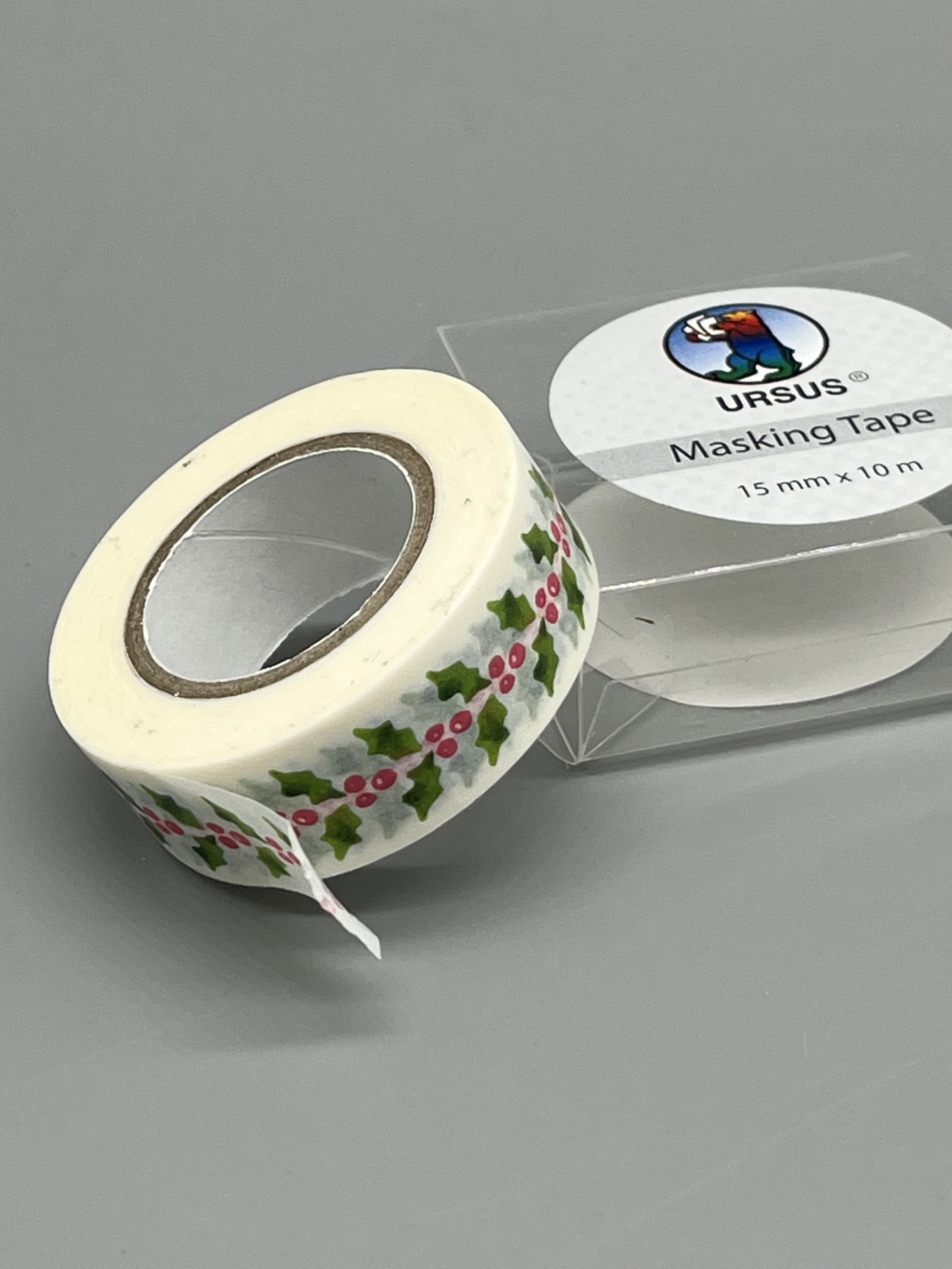 Klassischer Weihnachtsschmuck aus der Natur ist auf diesem Klebeband zu sehen. Auf weißem Hintergrund warten grüne Blätter der Stechpalme (Ilex) sowie deren rote Beeren darauf, Karten oder Geschenkpapier zu schmücken.