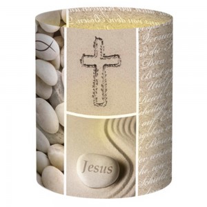Das VaterUnser und einige christliche Symbole sind auf diesen Tischlichtern zu sehen. Alles ist in neutralen Beigetönen gehalten und passt so zu fast jeder Tischdekoration. Schmücke damit die festliche Tafel zu Anlässen wie Taufe, Konfirmation, Firmung oder Kommunion.Füge den Transparentpapierstreifen einfach mit einem Klebestreifen zusammen und setzte ein Gläschen mit einer Kerze in die Mitte.
