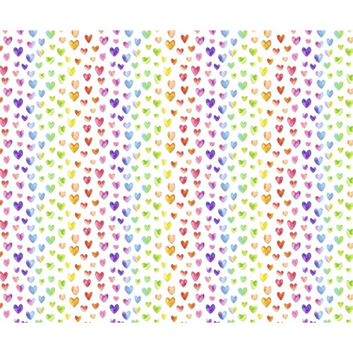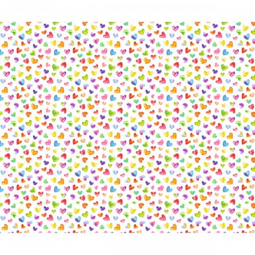 Die Bögen sind beidseitig bedruckt mit einem farbenfrohen Herz-Motiv im Aquarell-Stil. Vorder- und Rückseite sind leicht unterschiedlich in der Anordnung der Herzchen. Auf einer Seite ist das Muster farblich unregelmäßig gestreut, auf der anderen Seite sind die Farben eher in Reihen angeordnet.