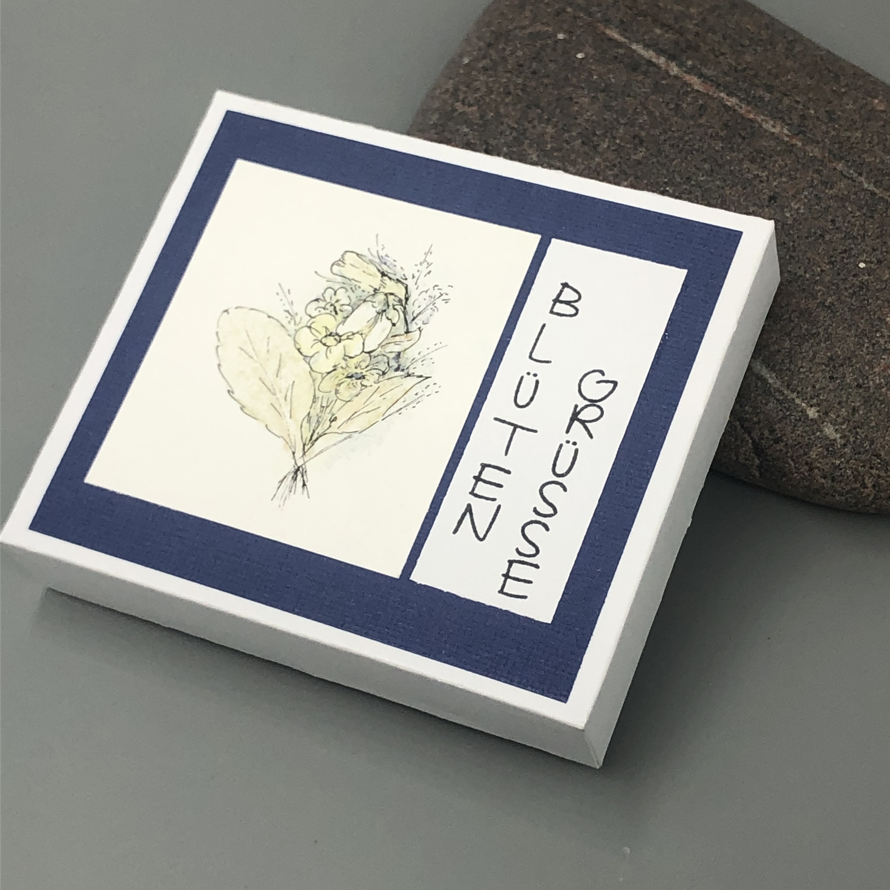 5 Geschenkkärtchen aus Fotokarton und leinengeprägtem Karton stecken mit passenden weißen Kuverts in jedem Schuber. Jedes Set ist ein absolutes Einzelstück. Denn hierfür habe ich echte Blüten gepresst und deren Farben so auf das Papier gebannt. Farben und Formen der Blumenmotive sind so einzigartig wie jede Blüte in der Natur. Der Zufall ist bei jedem Pressvorgang mit von der Partie und macht die Herstellung spannend. Eine Wiederholung gibt es nicht. Daher gibt es zwar verschiedene Sets, aber jedes nur ein Mal.
