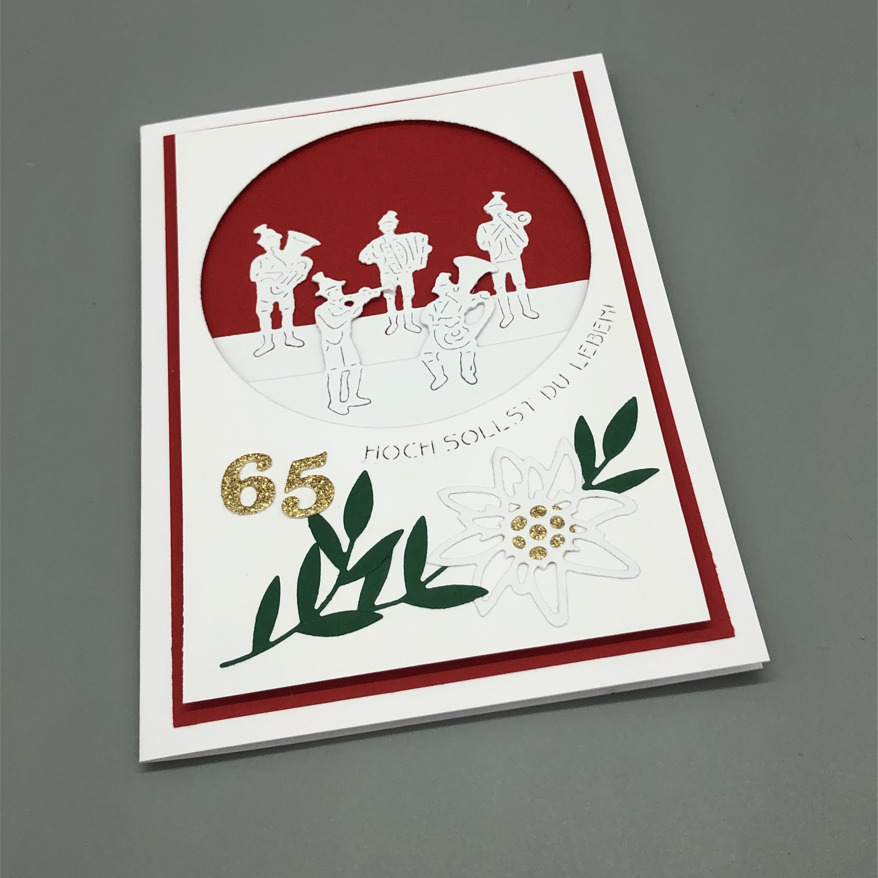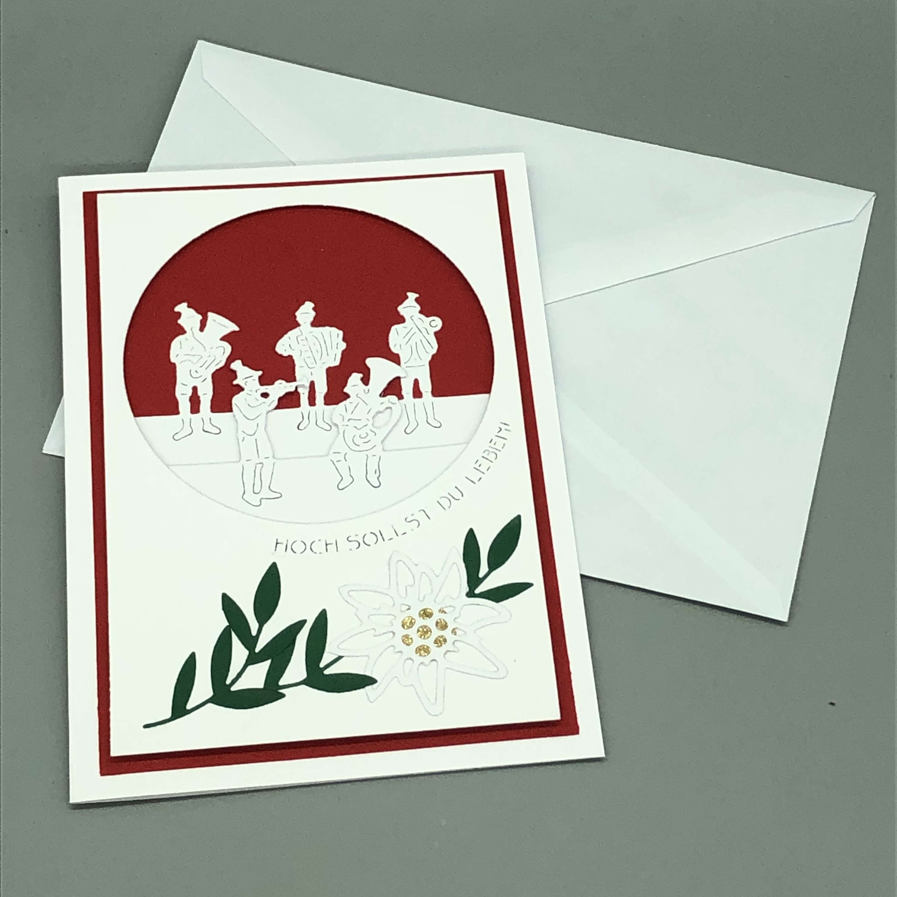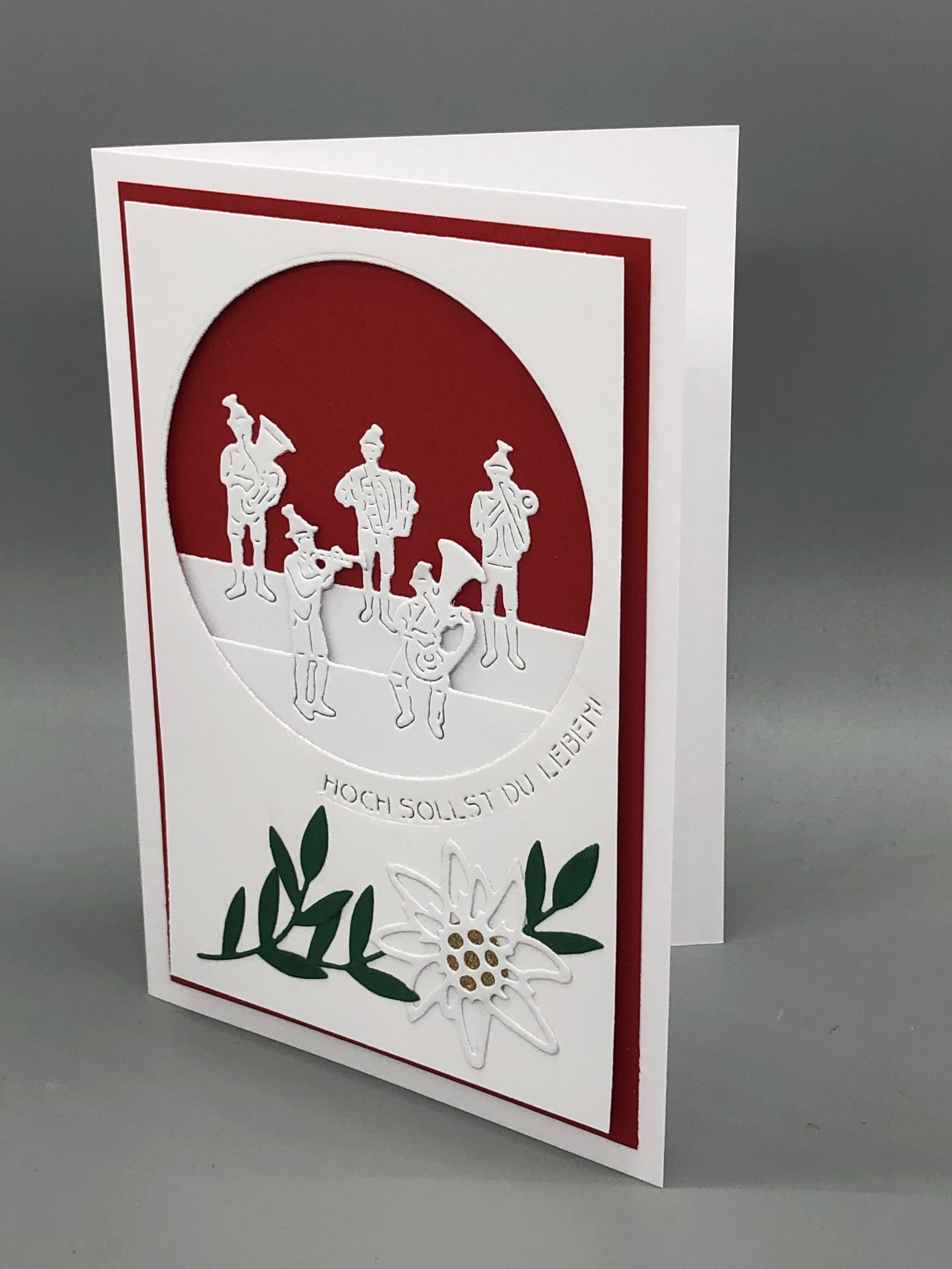 Eine Blaskapelle in Lederhosen und mit Gamsbart spielt hier zum feierlichen Anlass auf. Die Stanzteile aus Fotokarton habe ich auf dieser Karte in ein rundes Fenster gesetzt. An dessen unterem Rand ist der eingestanzte Text "Hoch sollst du leben" zu lesen. Darunter liegt ein Edelweiß quer auf der Karte. Es ist ebenfalls aus Fotokarton gestanzt und mit goldenem Glitzerkarton in der Blütenmitte ergänzt. Grüne Stängel und Blätter bringen etwas Farbe.